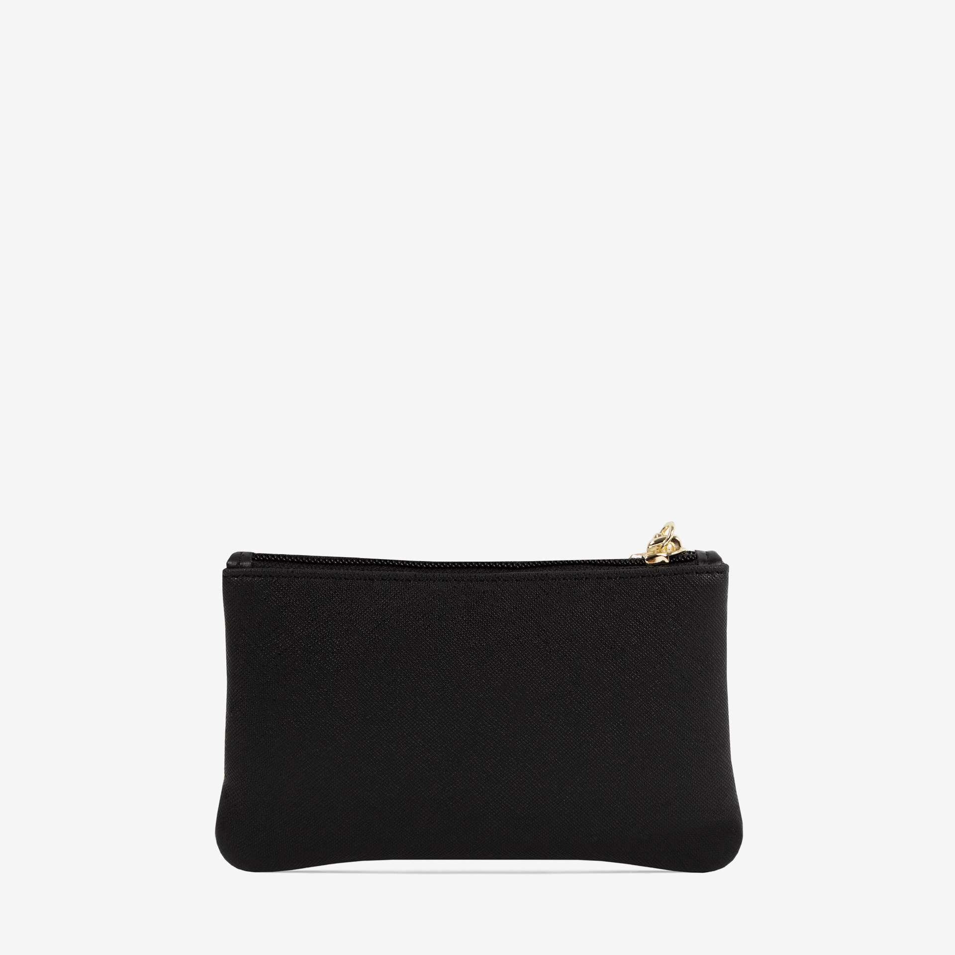 Mini bolsa de cosméticos em tela na cor preta com detalhes em pele genuína. Duas divisórias e fechos de correr. Detalhes em pele genuína e aplicações douradas.