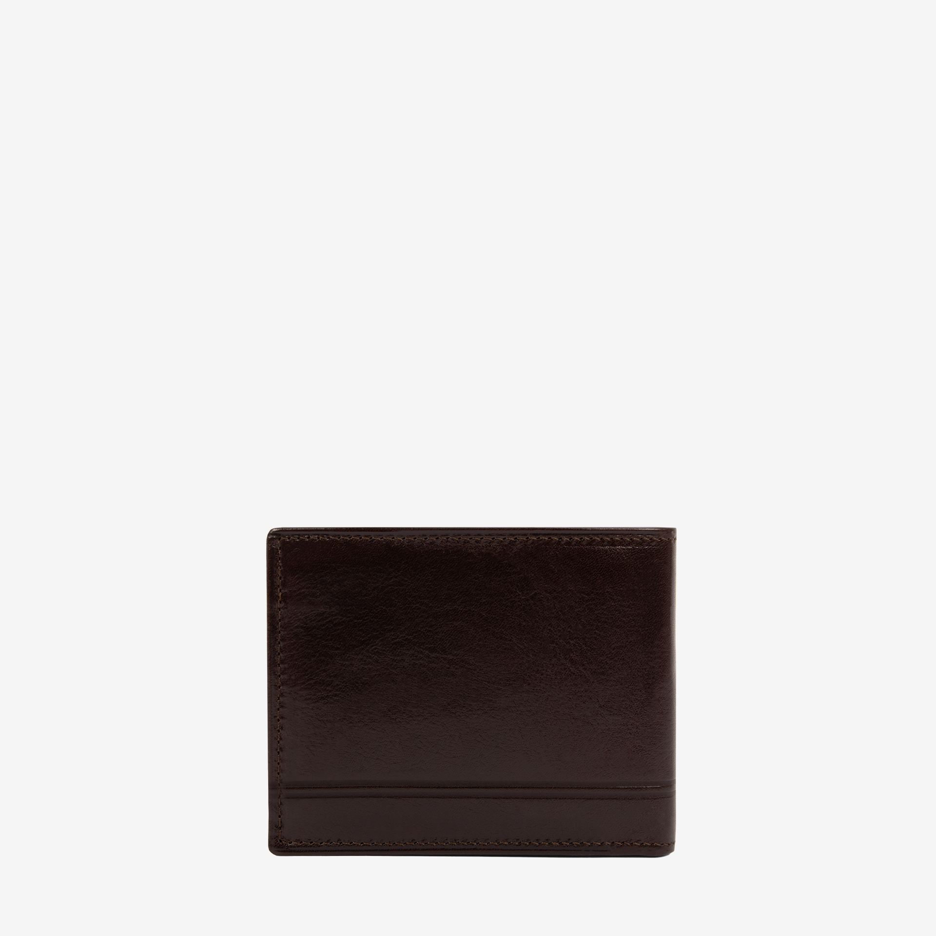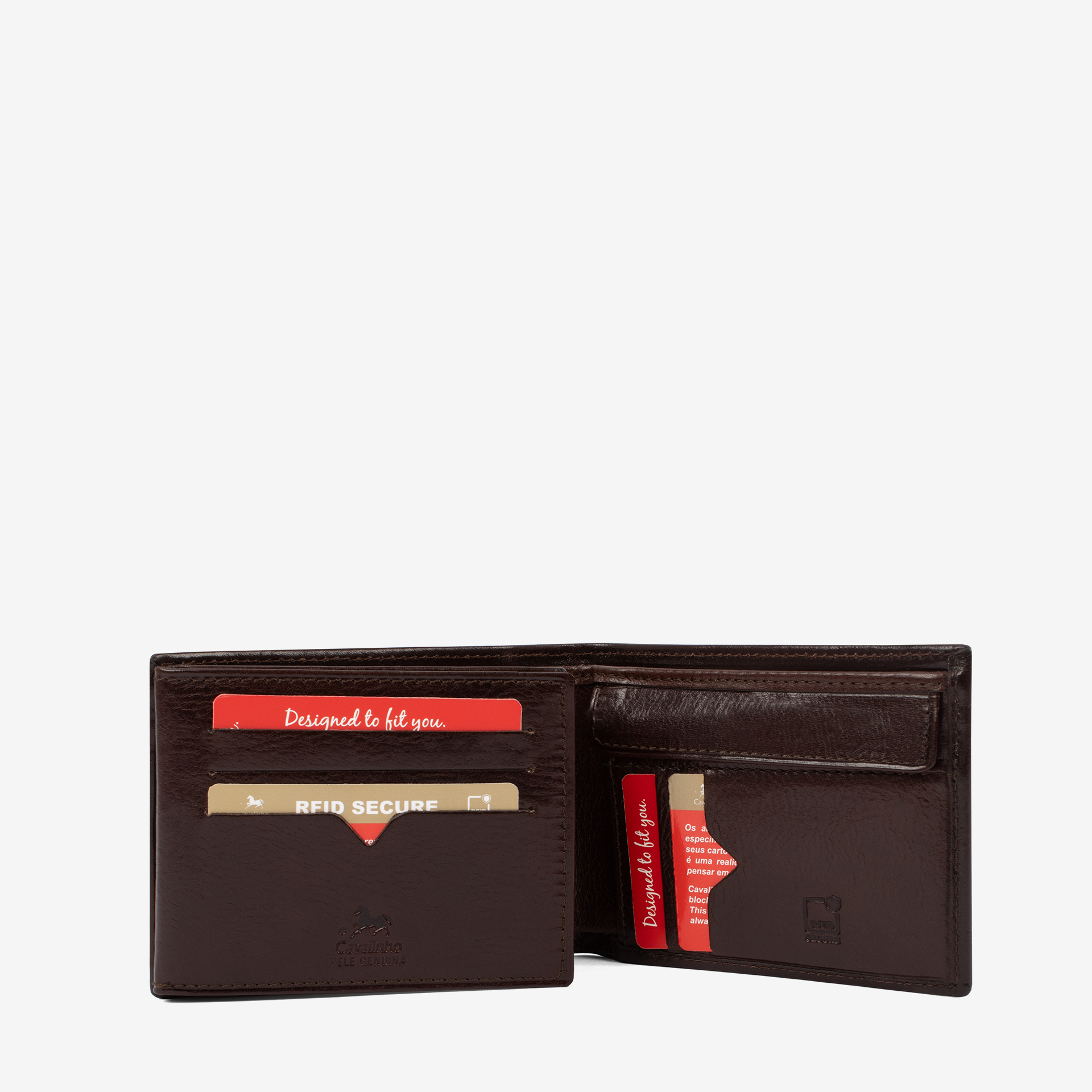 Carteira com dois compartimentos para notas, uma mica, quatro compartimentos livres, um bolso com fecho de correr personalizado para moedas e capacidade para catorze cartões de crédito.