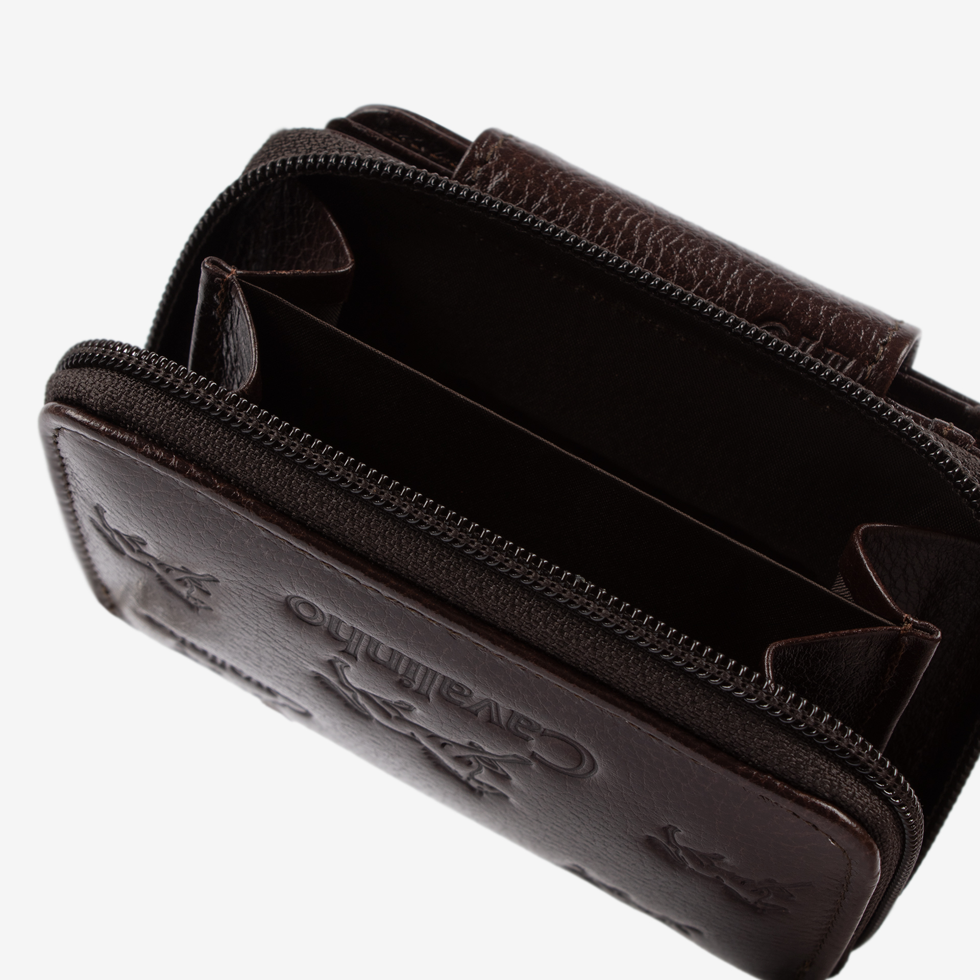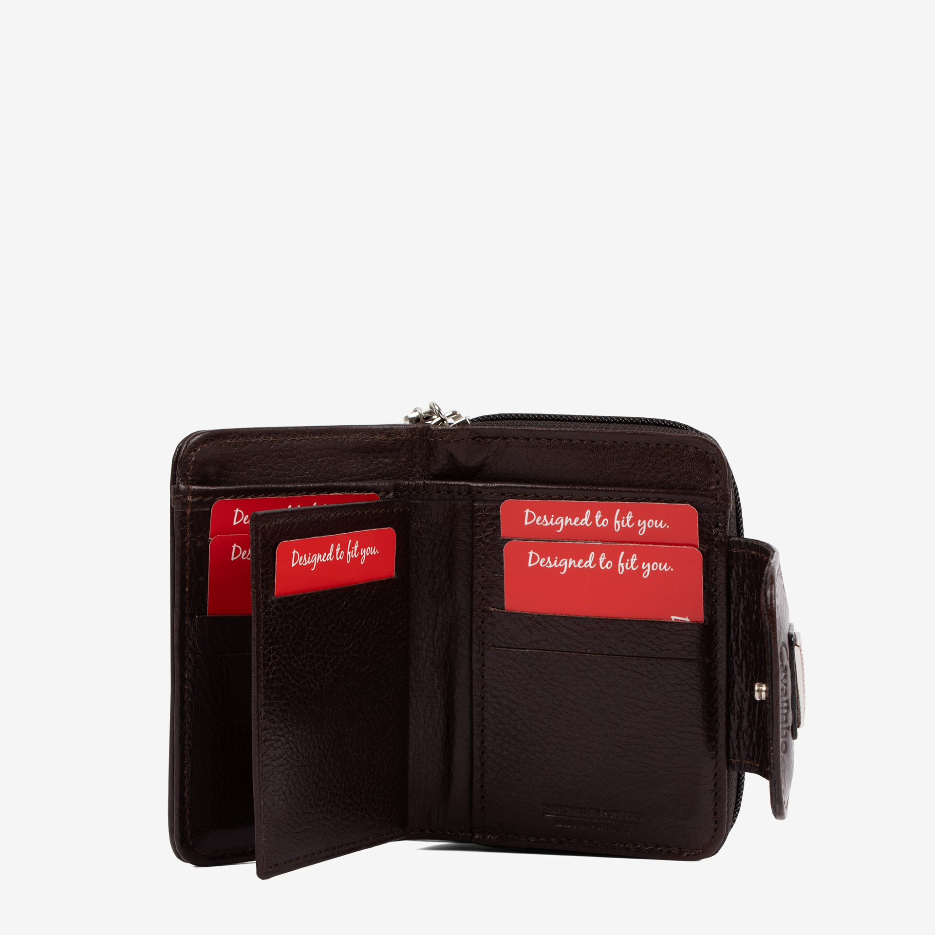 Carteira com duas divisões principais: na frontal, capacidade para dez cartões; na traseira, dois compartimentos livres para moedas com fecho de correr.