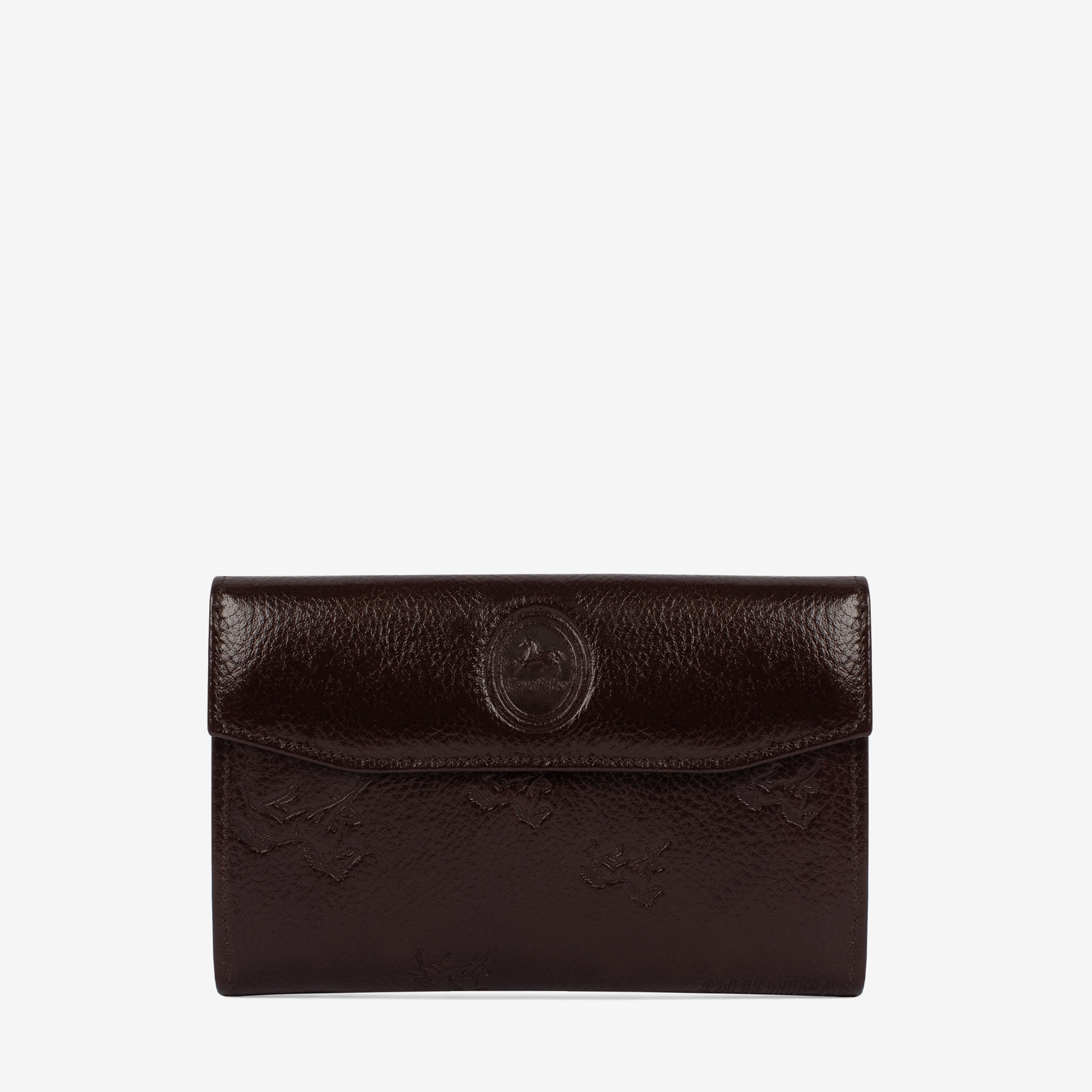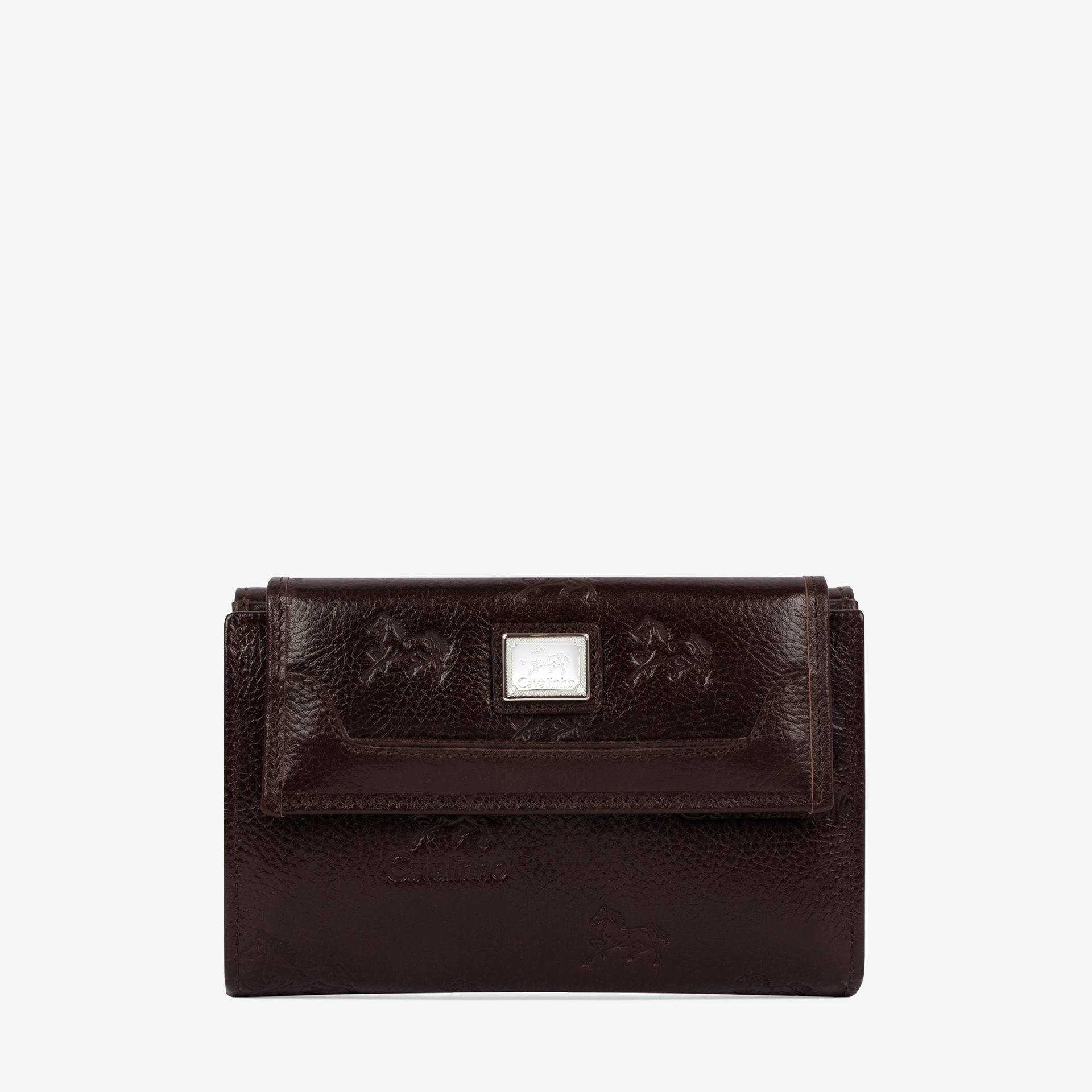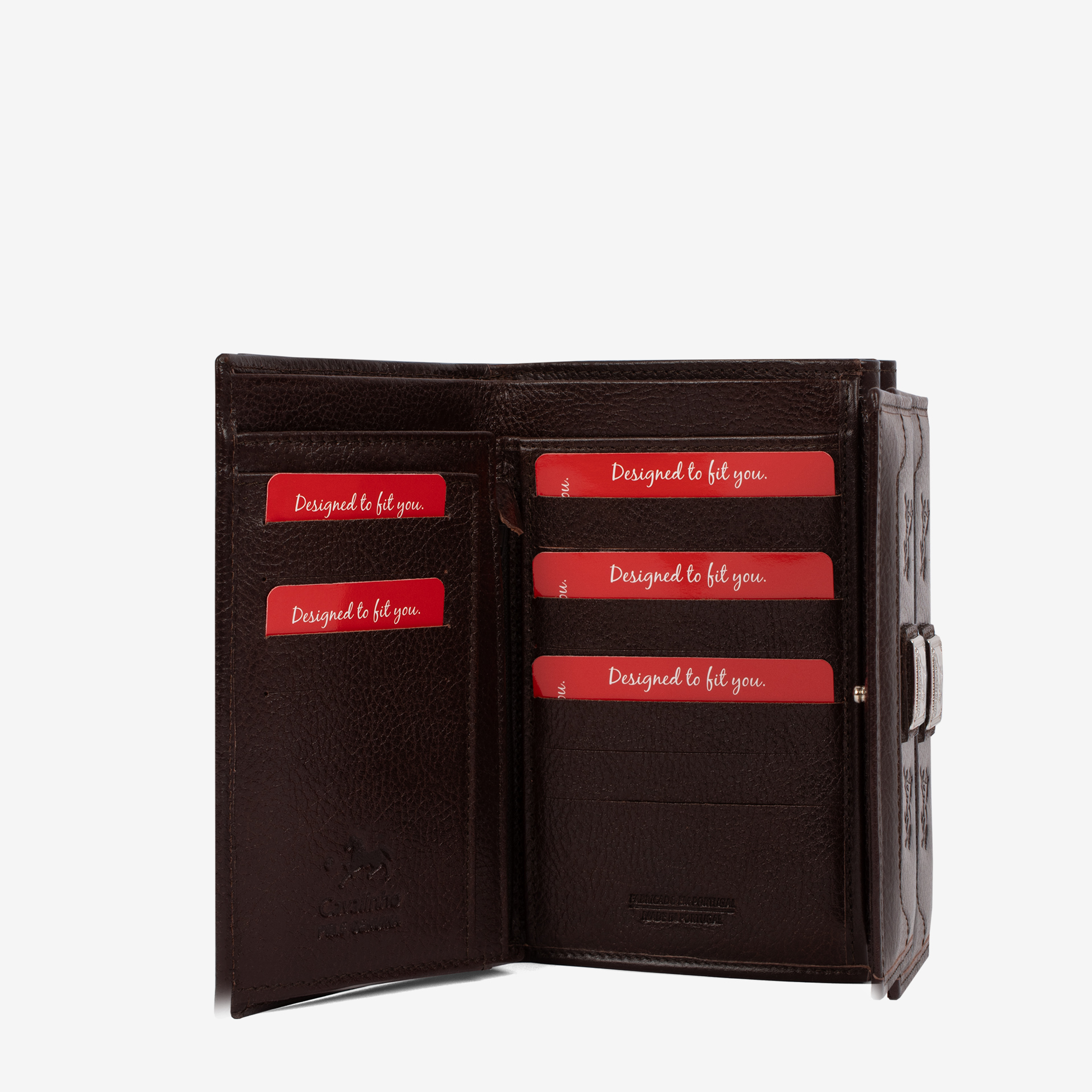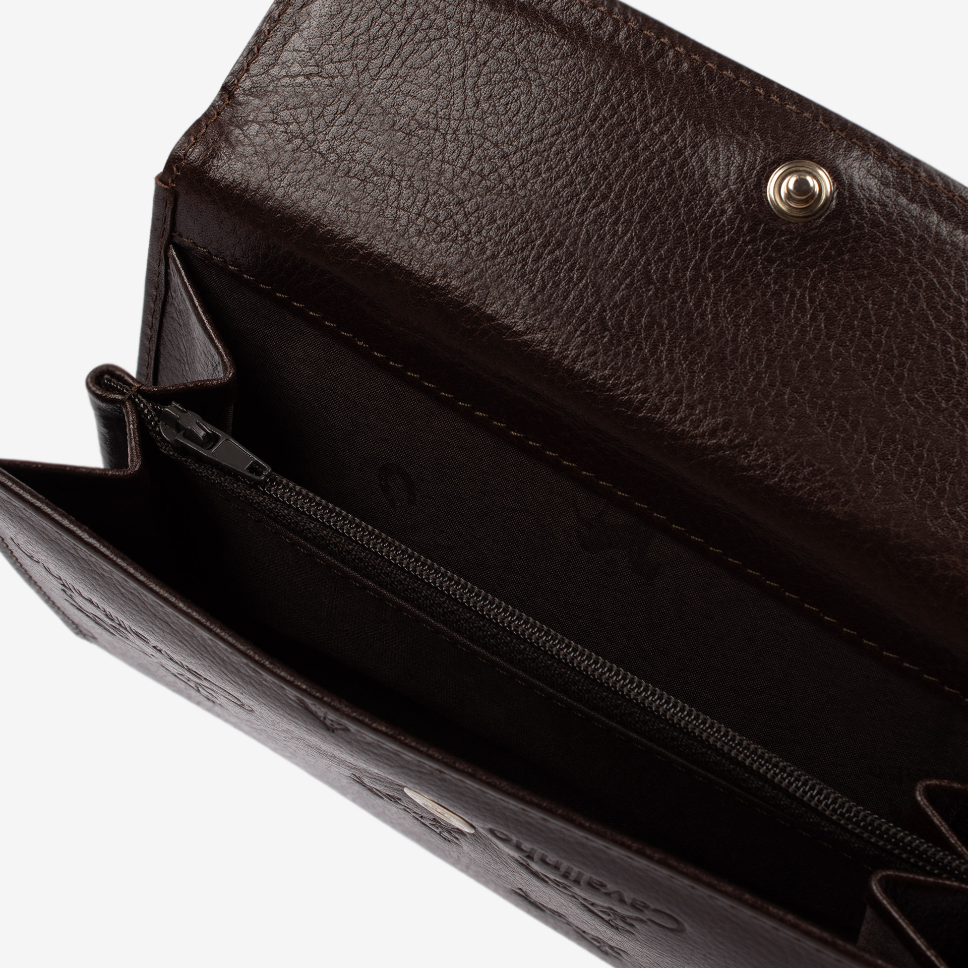 Carteira de documentos em pele genuína com gravação na cor castanho. Duas divisórias: na frontal, dois compartimentos para notas, um para documentos, duas bolsas transparentes, uma divisão com fecho de correr e capacidade para dez cartões; na traseira, dois compartimentos livres e um com fecho de correr para moedas. Aplicações prateadas.