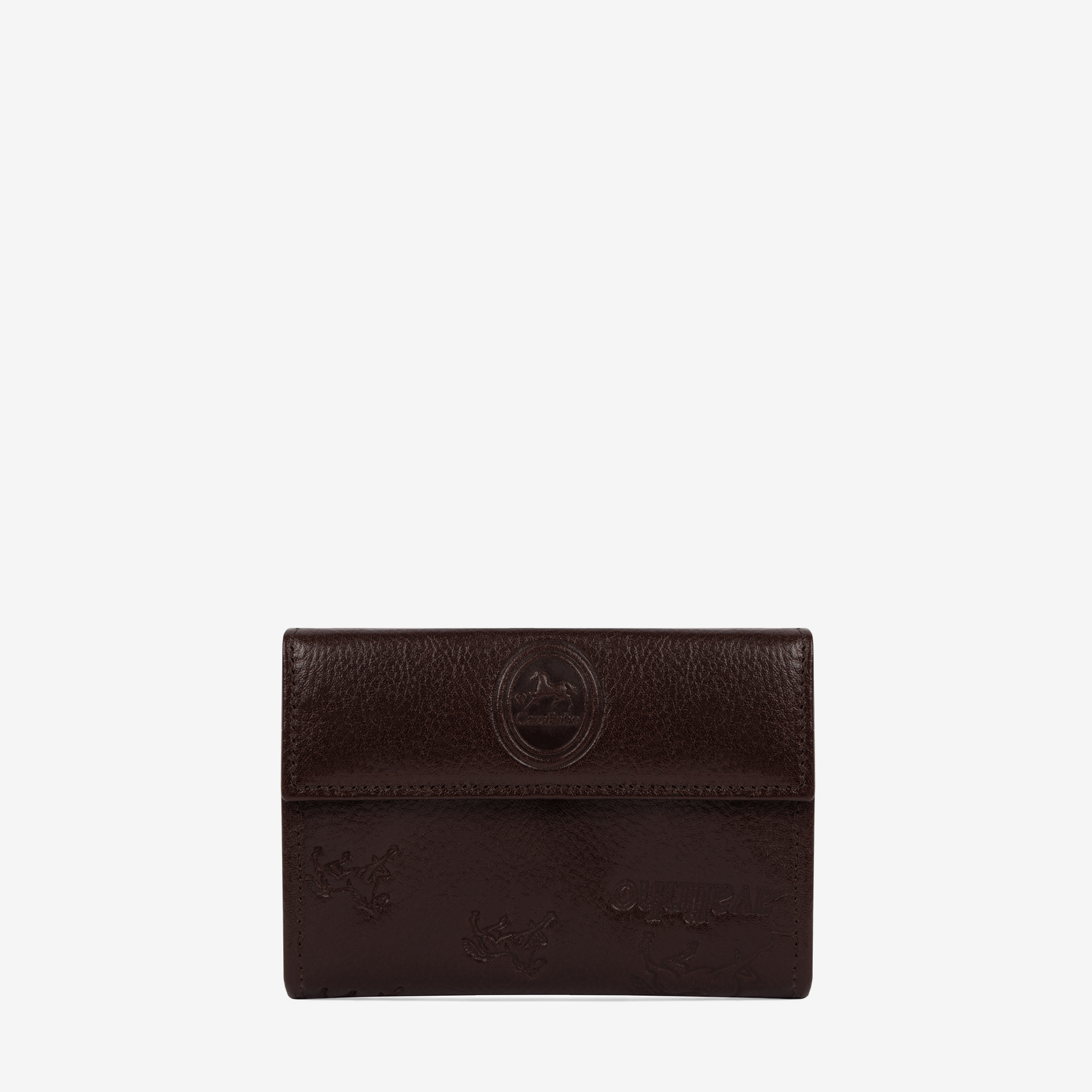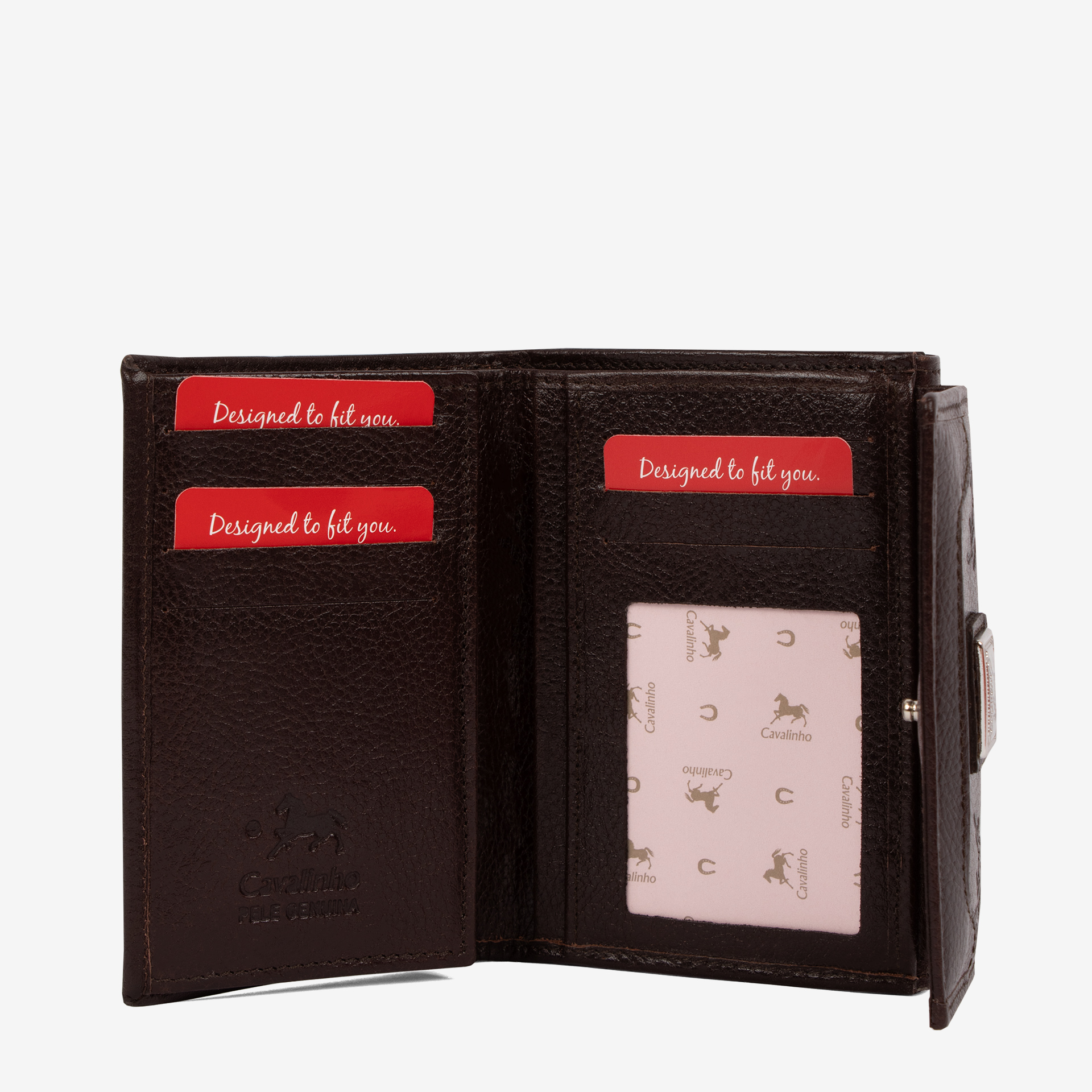 Carteira de documentos em pele genuína com gravação na cor castanho. Duas divisórias: na frontal, capacidade para onze cartões, uma bolsa transparente, um compartimento para notas e três livres; na traseira, dois compartimentos livres e um para moedas com fecho de correr. Aplicações prateadas.