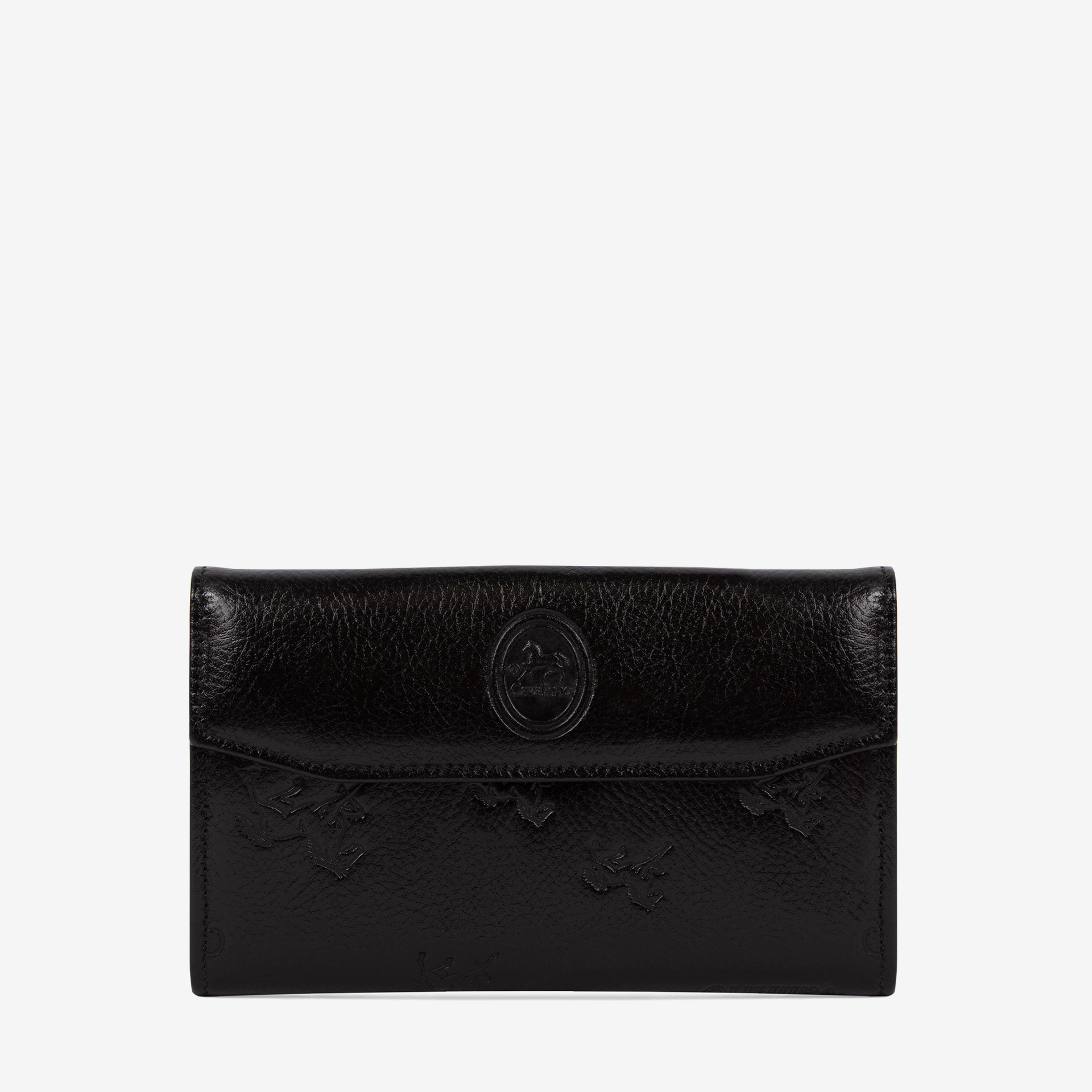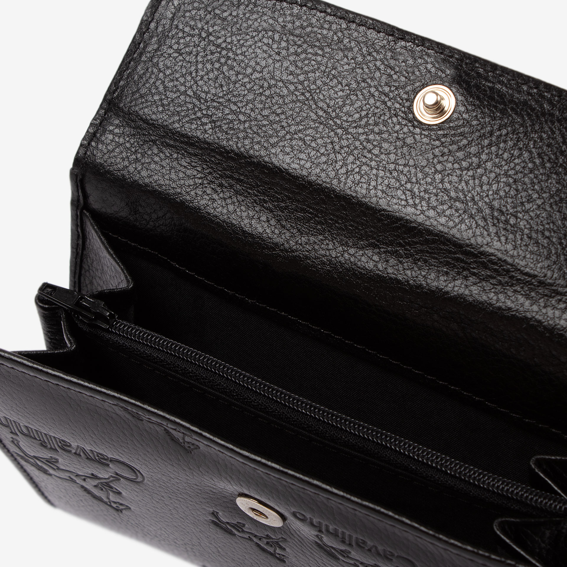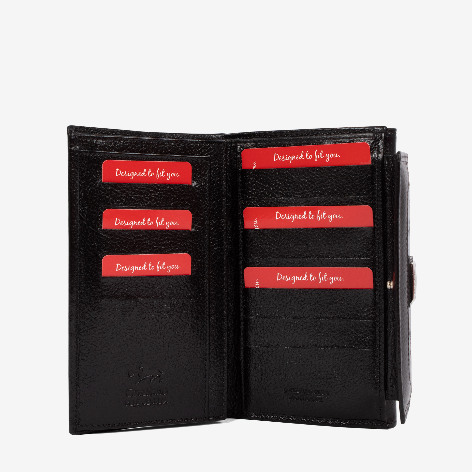 Carteira de documentos em pele genuína com gravação na cor preto. Duas divisórias: na frontal, um compartimento notas, um para caneta e capacidade para dezassete cartões; na traseira, dois compartimentos livres e um compartimento para moedas com fecho de correr. Aplicações prateadas.