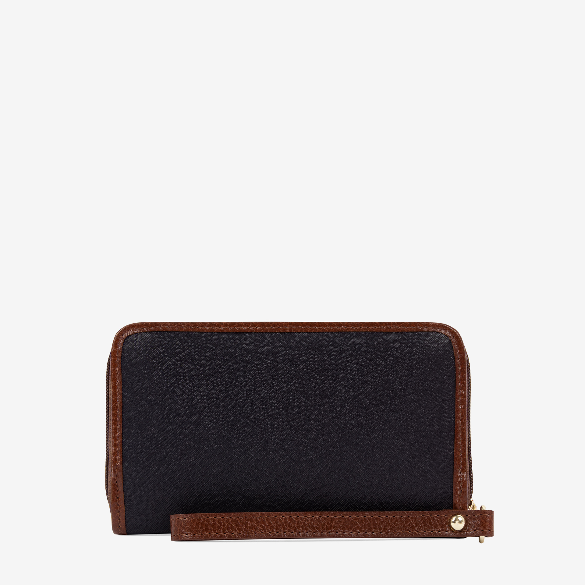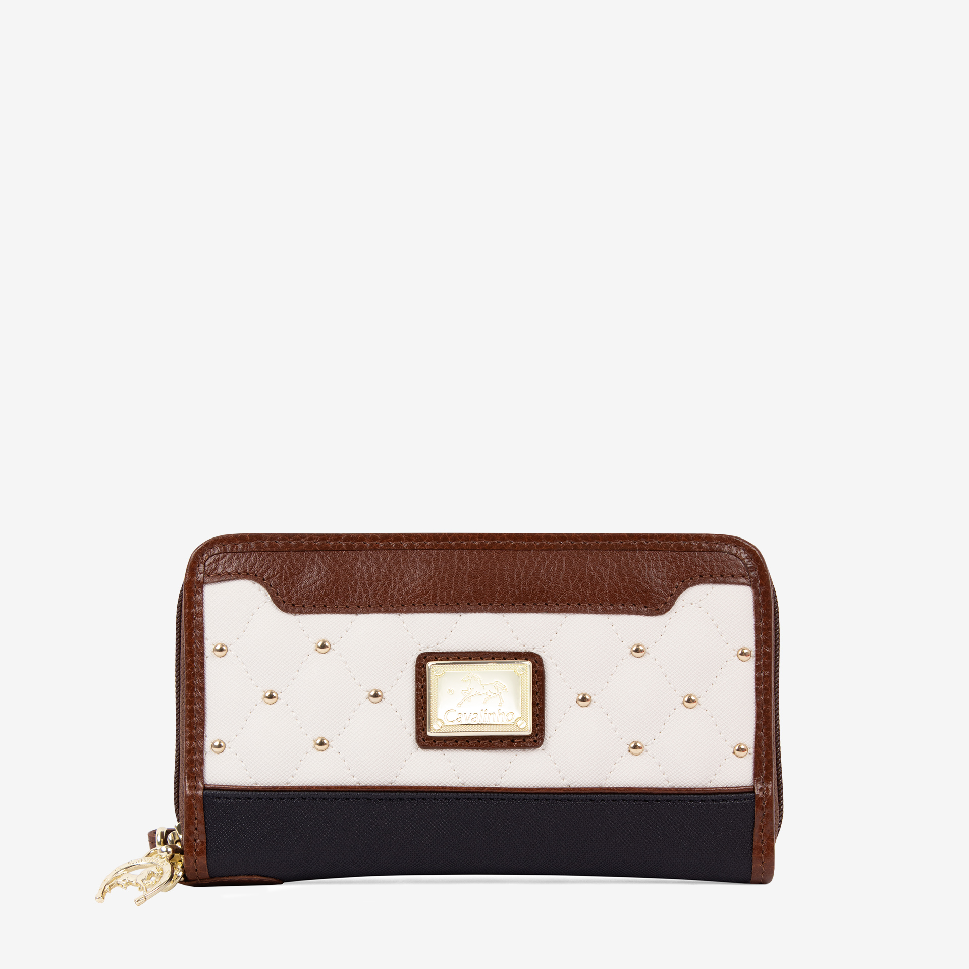 Carteira com dois compartimentos para notas, um para moedas, uma bolsa transparente e capacidade para nove cartões. Fecho de correr. Detalhes em pele genuína e aplicações douradas.