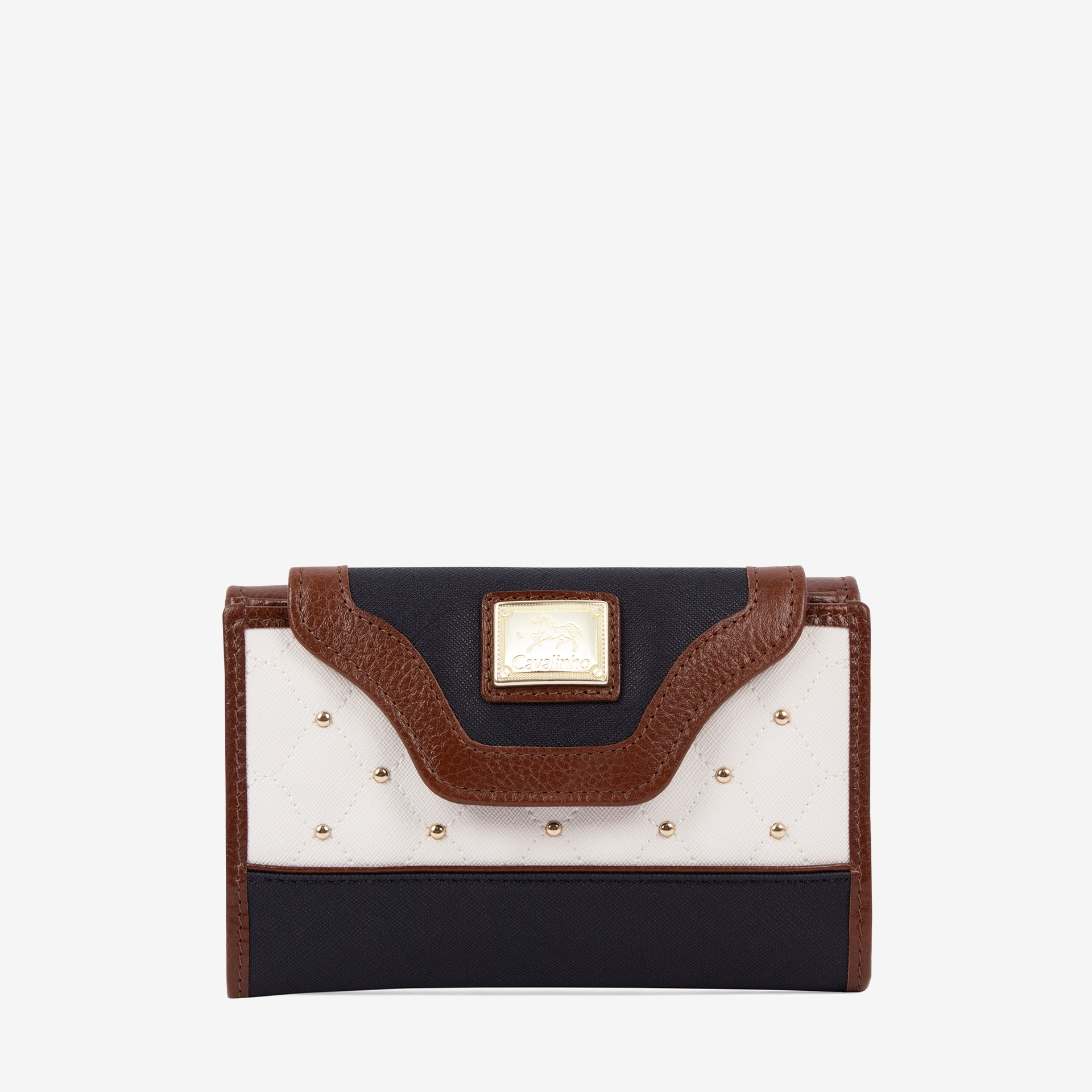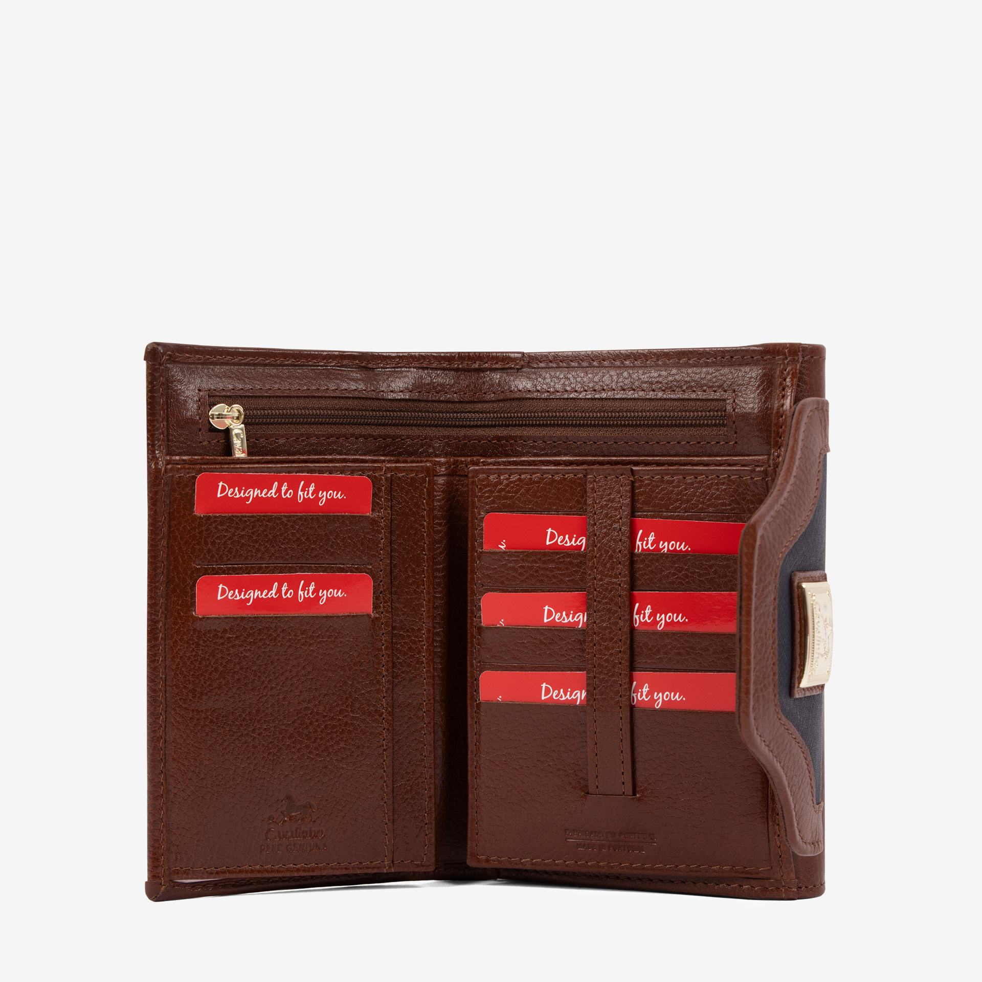 Carteira com duas divisórias principais: na frontal, um compartimento para notas, três bolsas transparentes, um bolso com fecho de correr e três divisões com capacidade total para quinze cartões; na traseira, dois compartimentos livres e um com fecho de correr para moedas. Detalhes em pele genuína e aplicações douradas.
