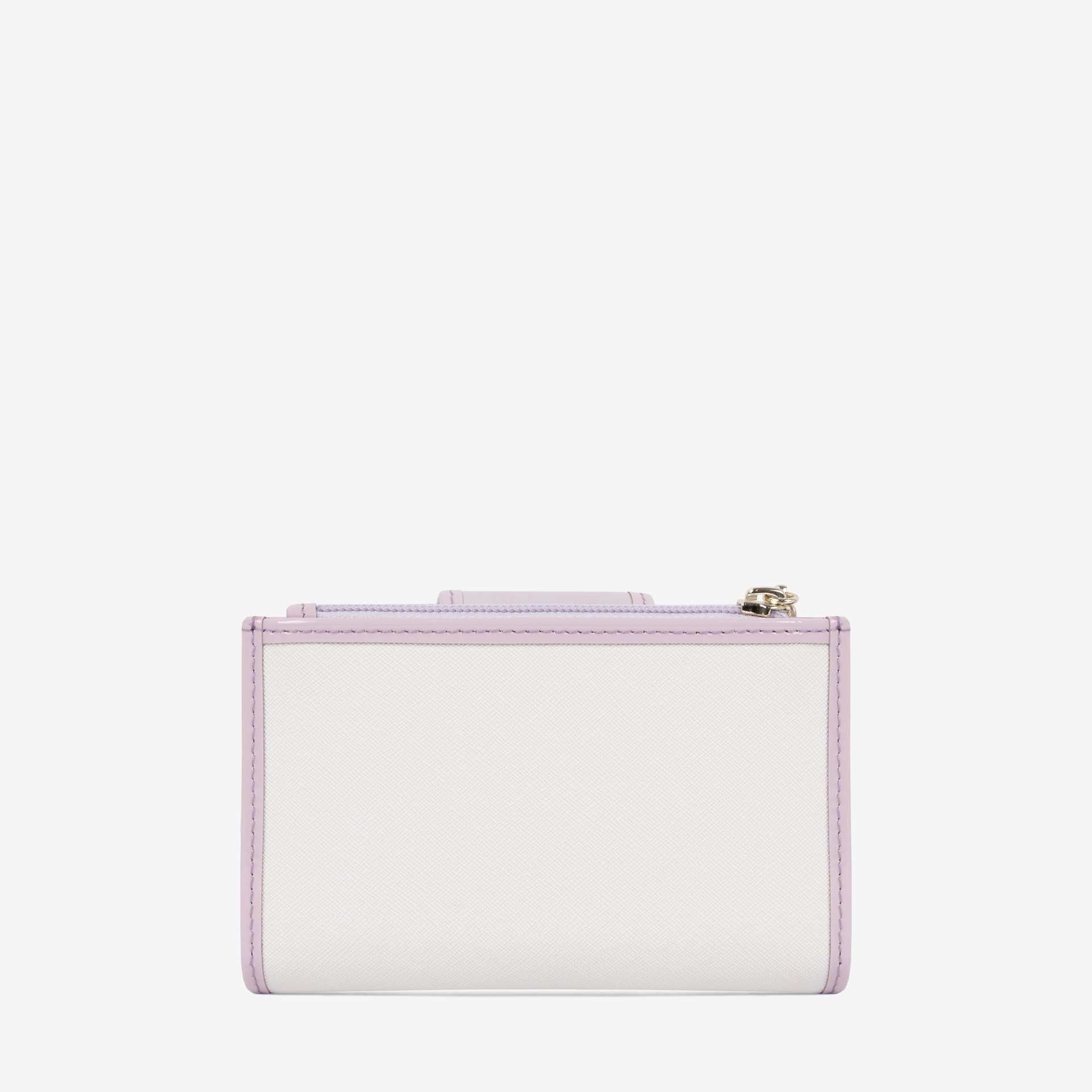 Carteira em tela branca e detalhes em pele envernizada lilás, com duas divisórias: na frontal, um compartimento para notas, duas bolsas transparentes e capacidade para catorze cartões; na traseira, um compartimento para moedas com fecho de correr. Pormenor branding no tecido. Aplicação dourada CV. Coleção exclusiva e limitada Dear Me.