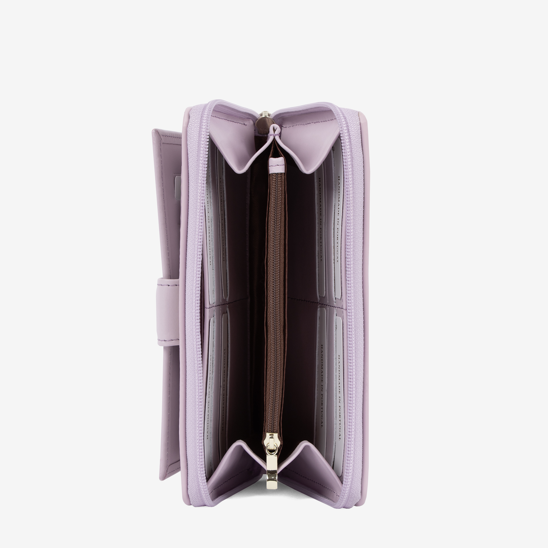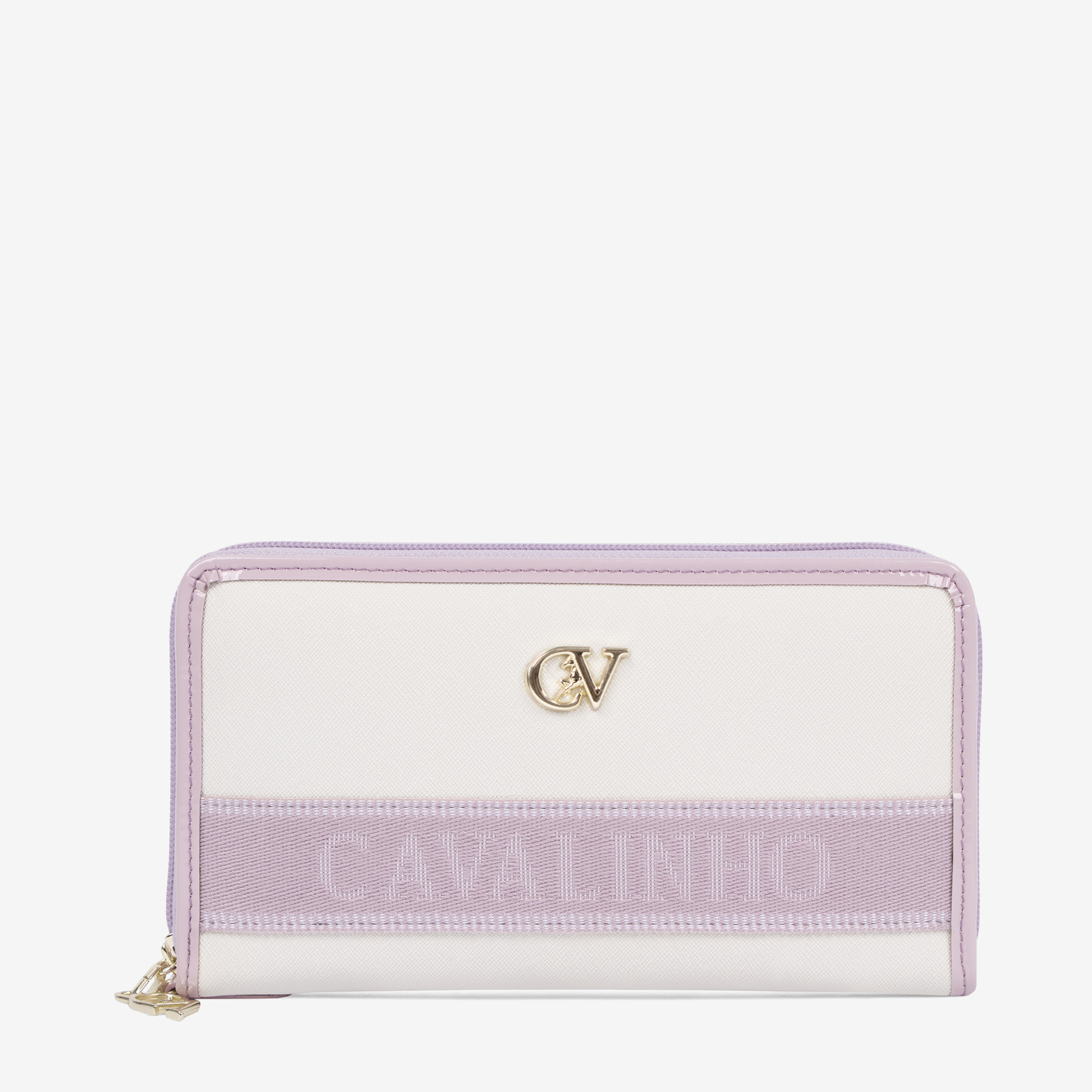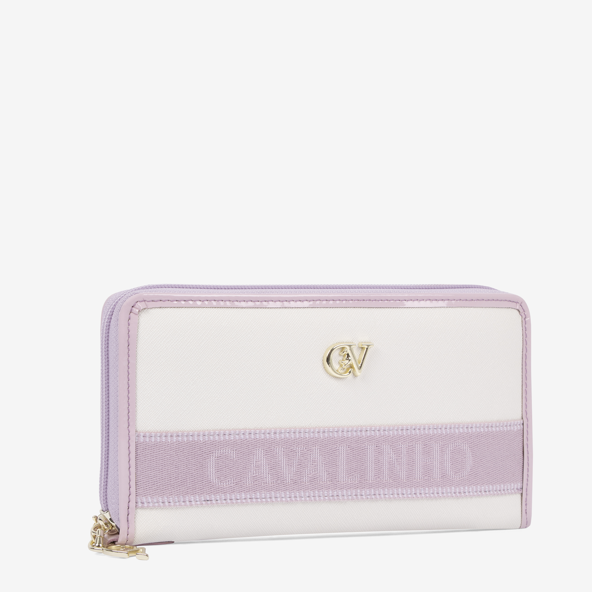 Carteira de documentos em tela branca e detalhes em pele envernizada lilás. Duas divisórias: na frontal, compartimento para moedas com fecho de correr, dois livres e capacidade para doze cartões; na traseira, capacidade para dez cartões. Pode ser utilizada como clutch, através da mini alça de mão. Pormenor branding no tecido. Aplicação dourada CV. Coleção exclusiva e limitada Dear Me.