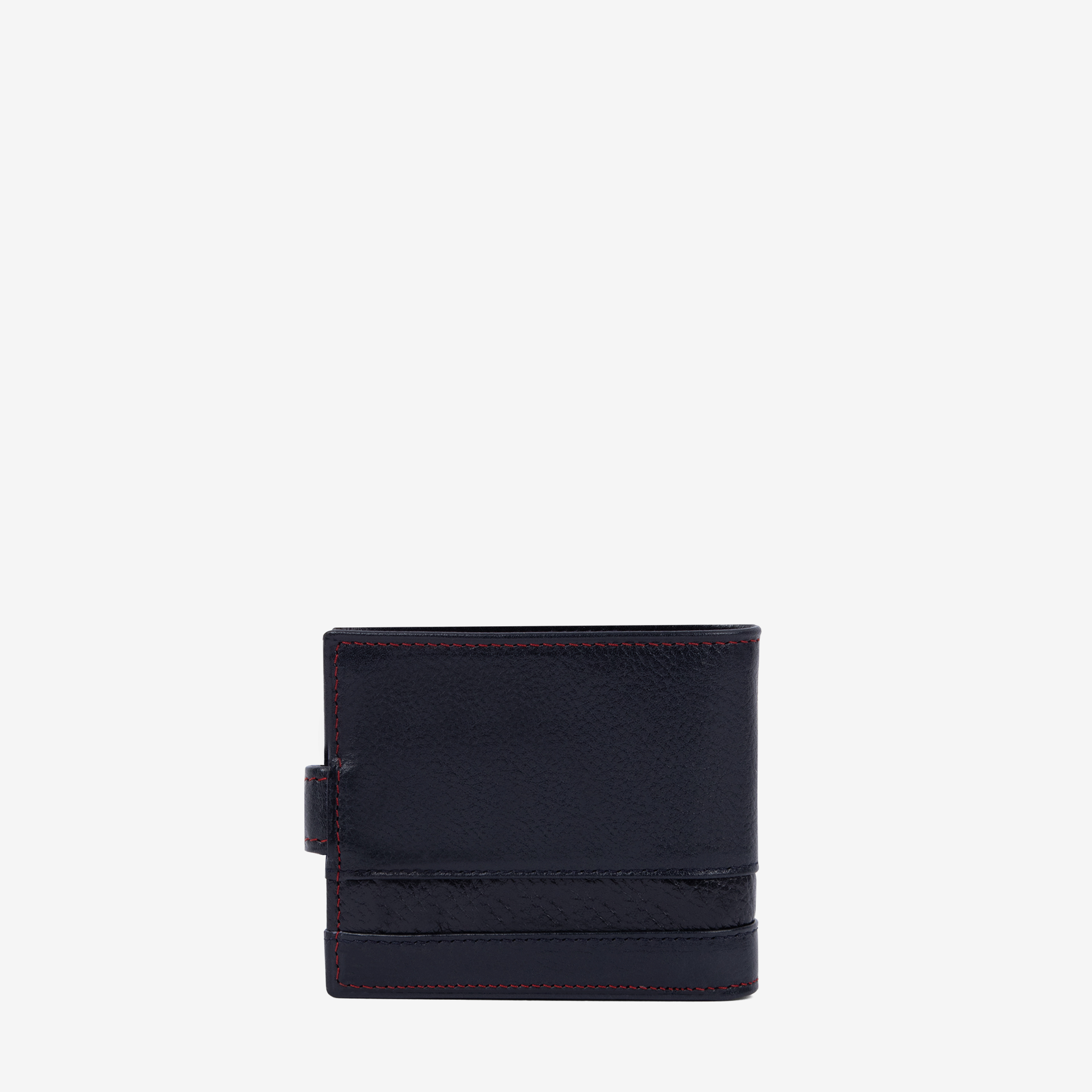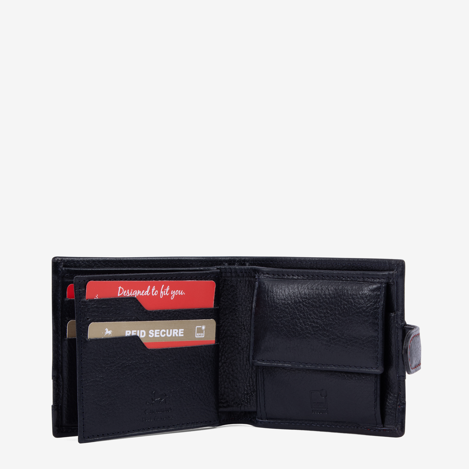 Carteira com capacidade para seis cartões, um compartimento para notas, uma bolsa transparente, três compartimentos livres e um bolso com mola para moedas.