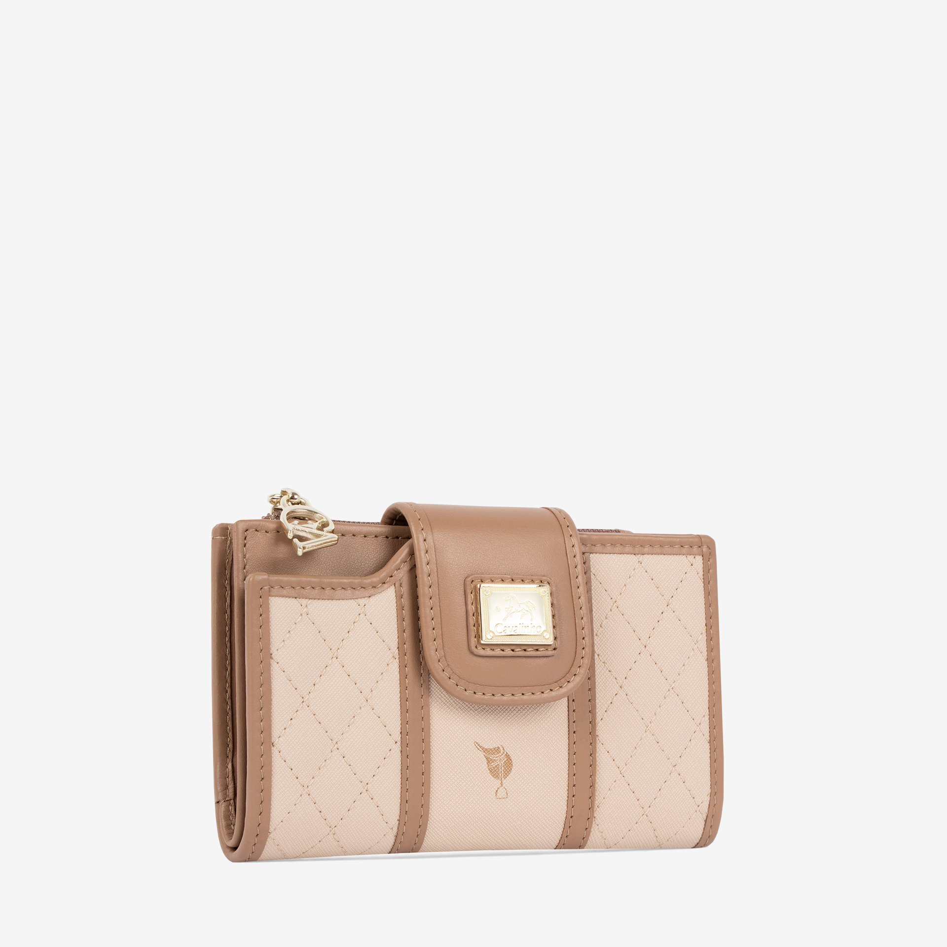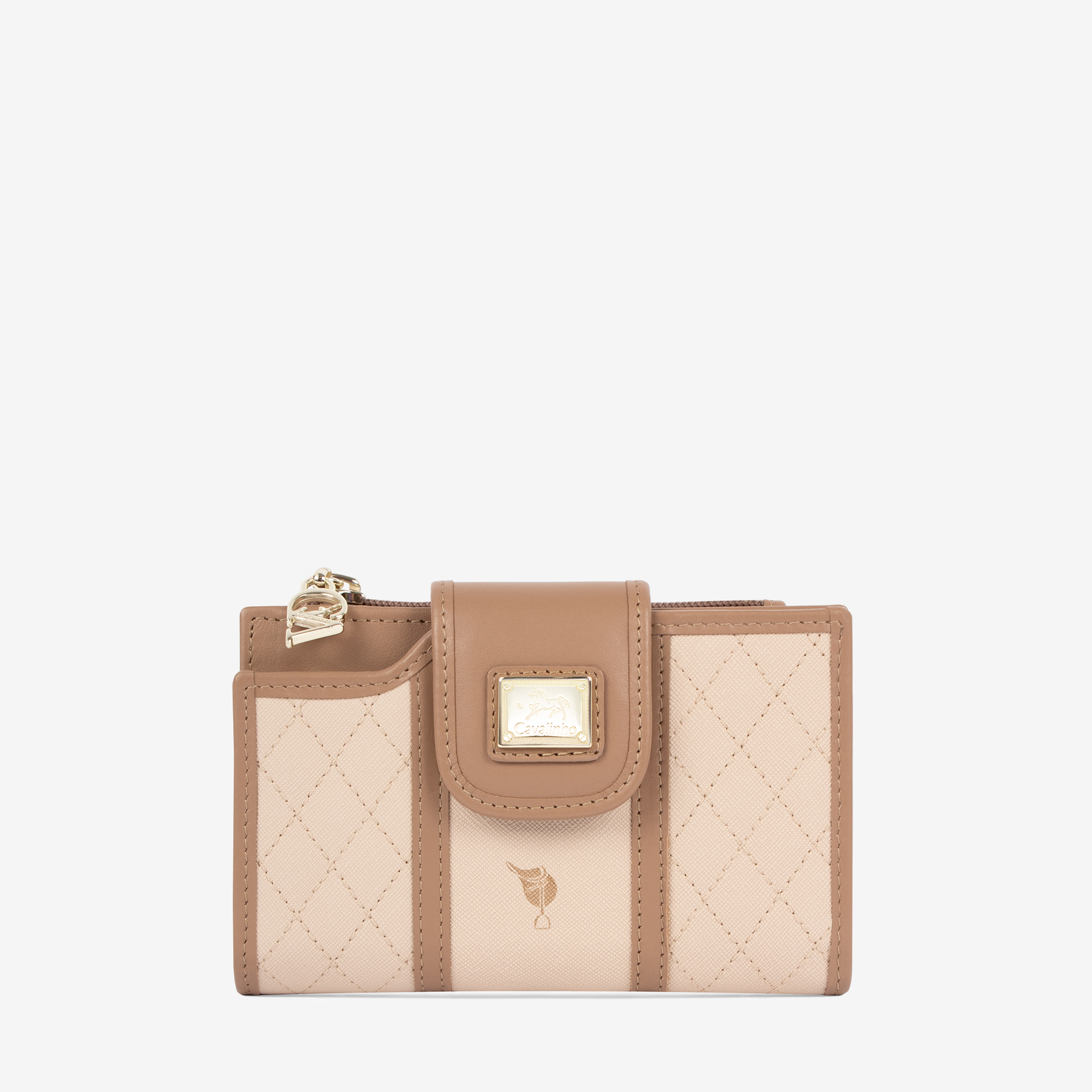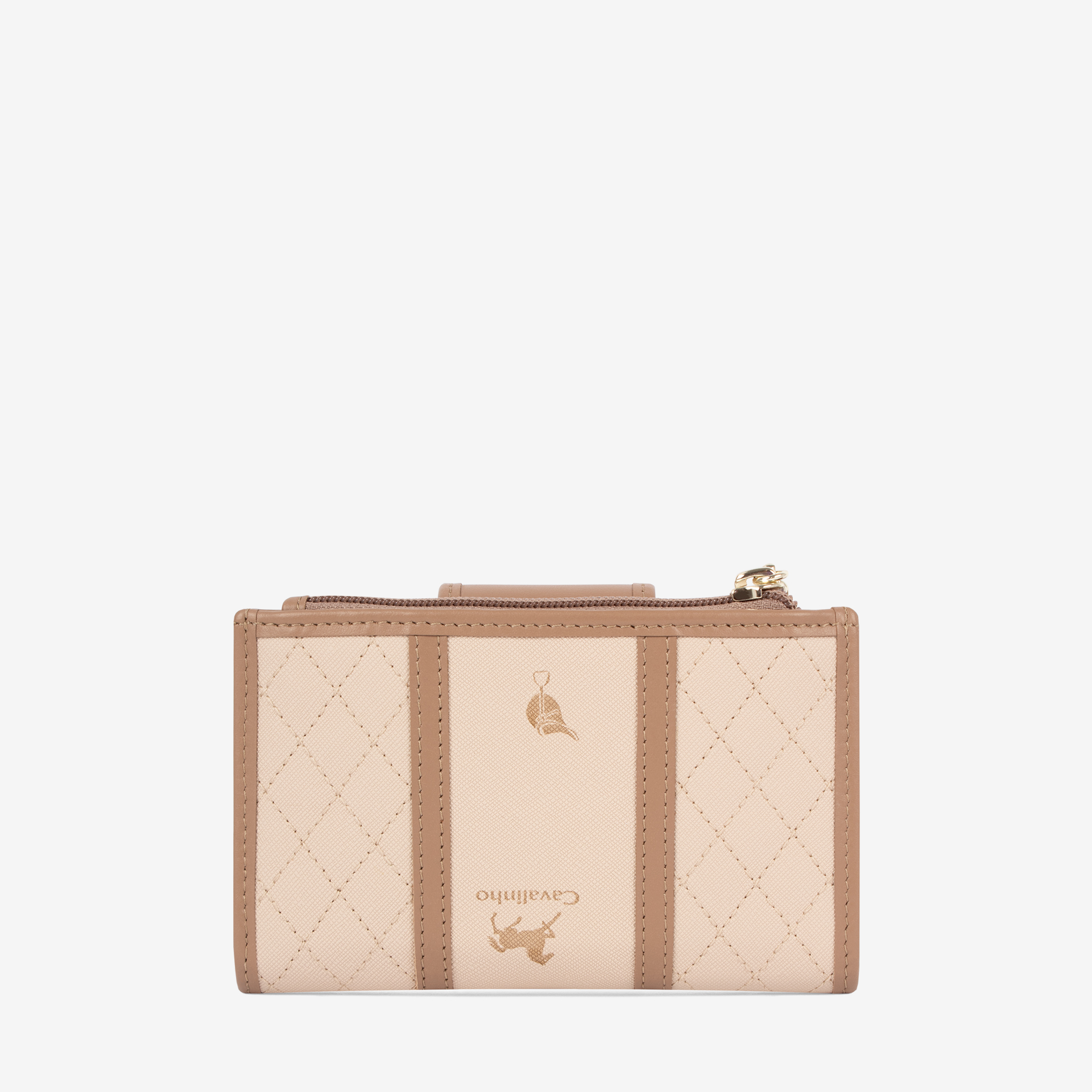 Carteira de documentos em tela e com padrão losangular na cor bege. Duas divisórias: na frontal, um compartimento para notas, duas bolsas transparentes e capacidade para catorze cartões; na traseira, um compartimento para moedas com fecho de correr. Aplicações douradas.