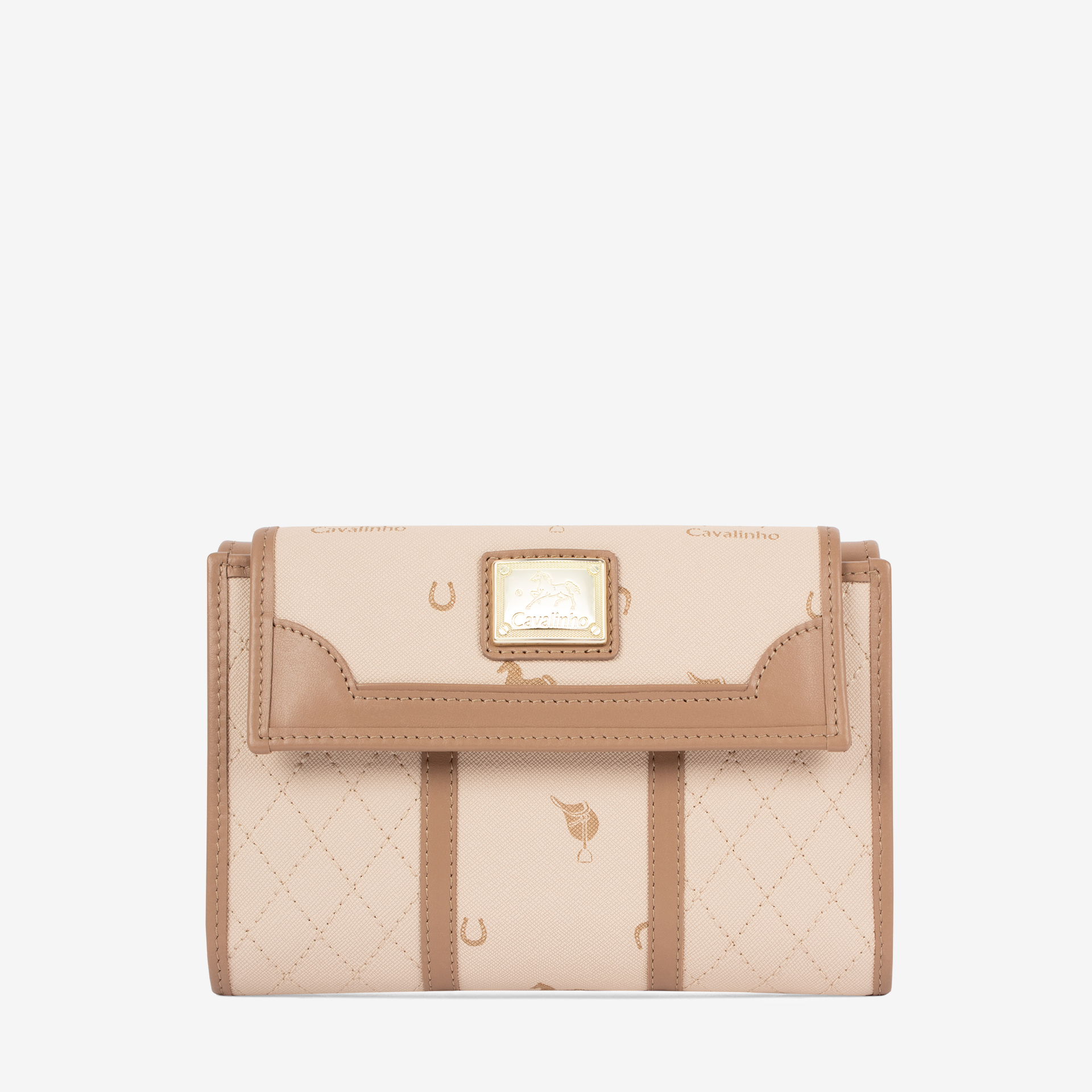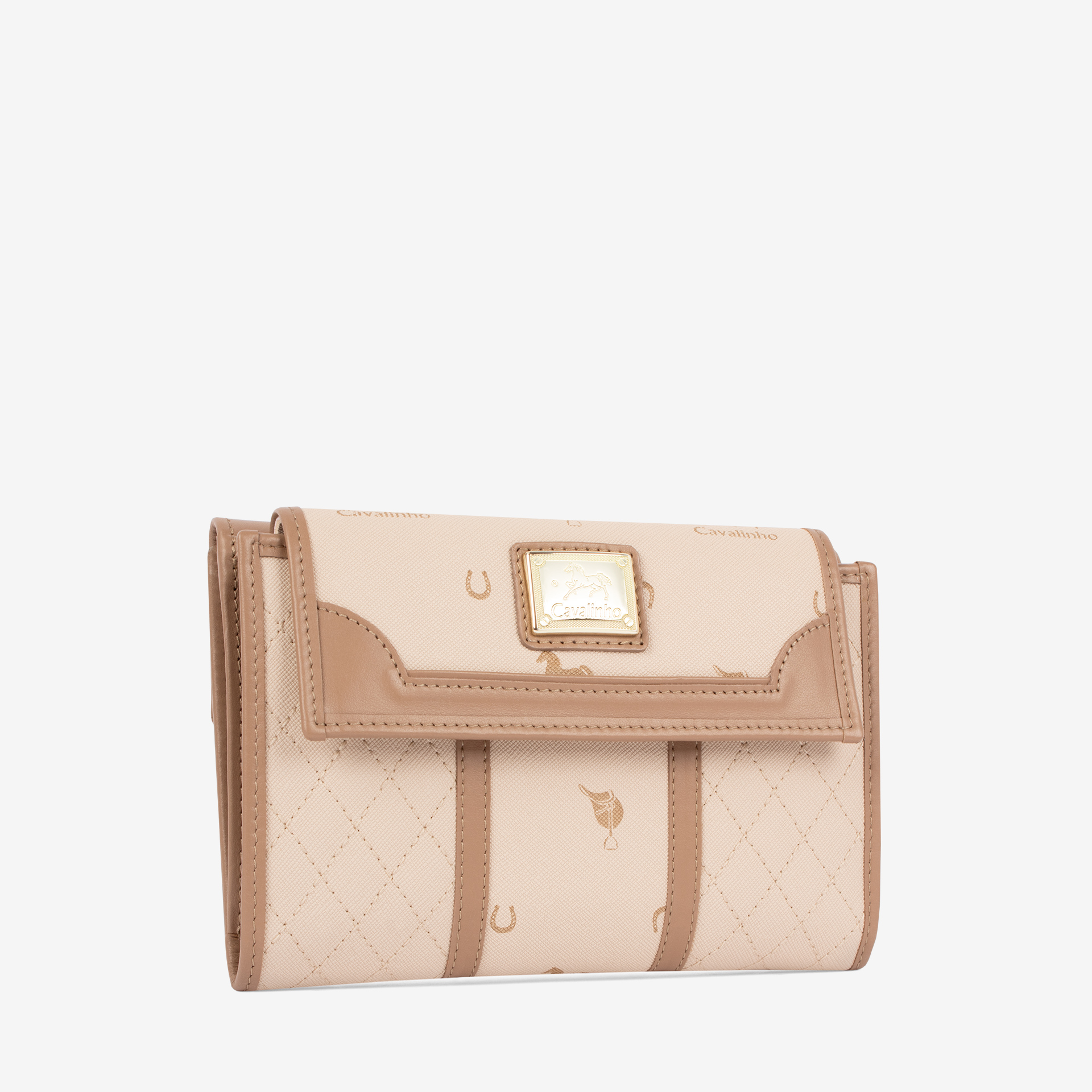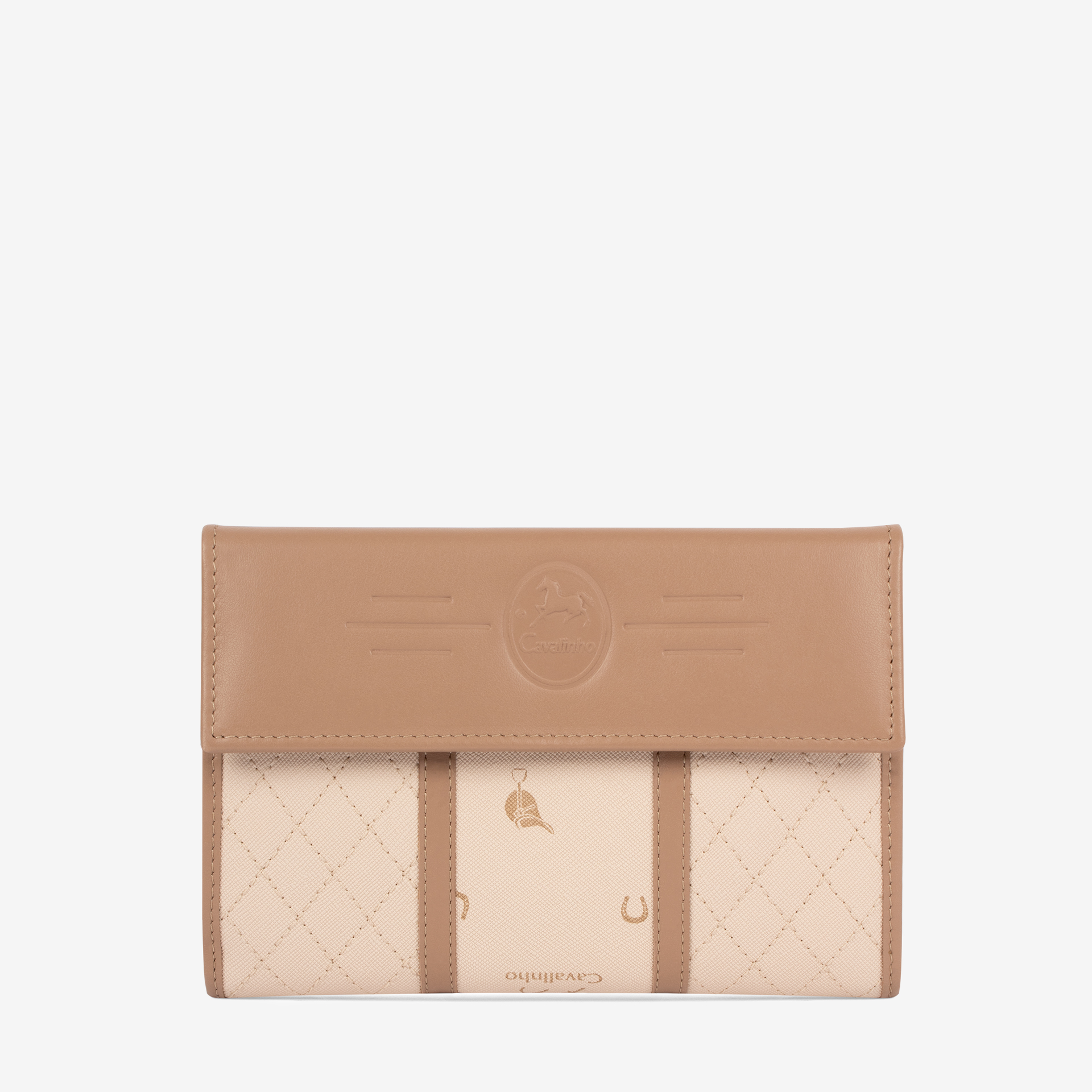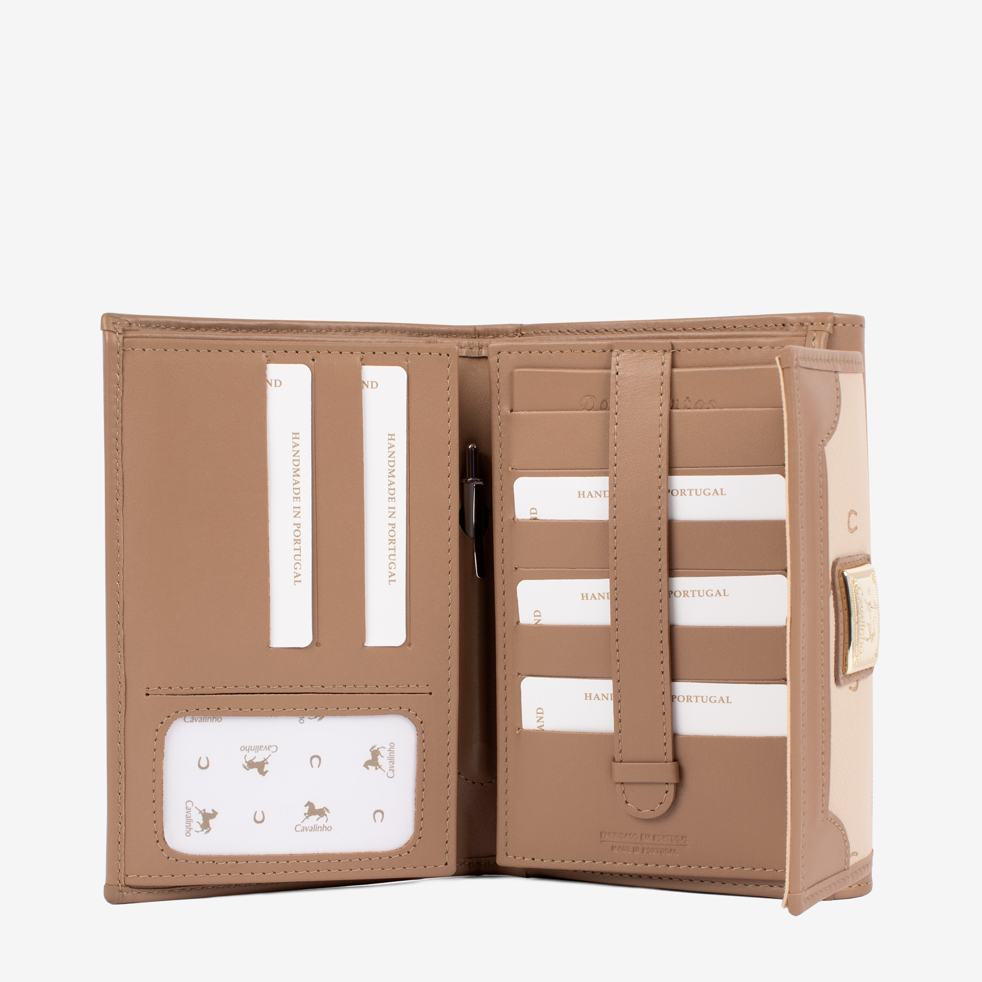 Carteira de documentos em tela com padrão losangular na cor bege. Duas divisórias: na frontal, um compartimento para notas, quatro bolsas transparentes, uma divisão para caneta e capacidade para dezassete cartões e um passe para documentos; na traseira, três compartimentos, dois livres e um com fecho de correr para moedas. Aplicações douradas.