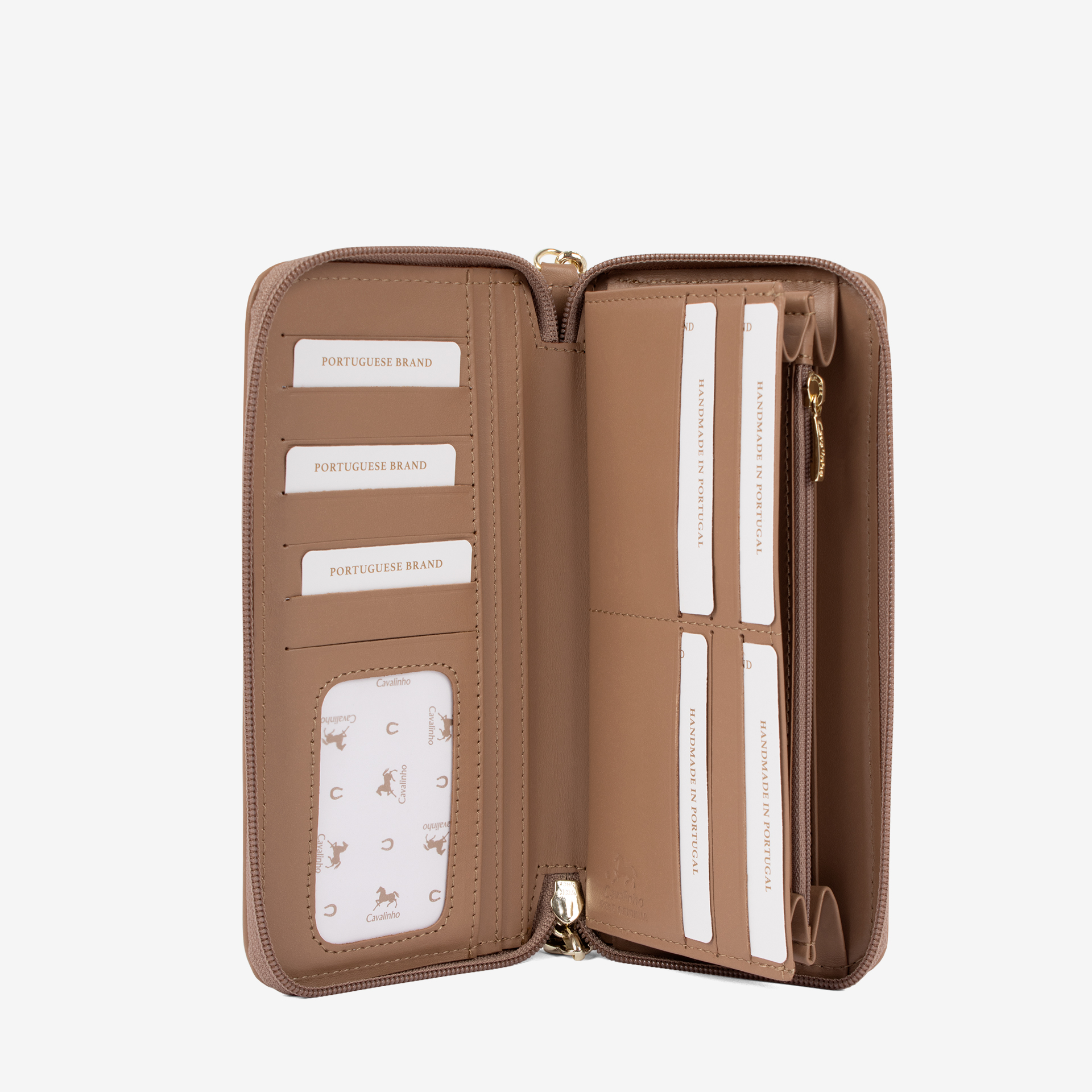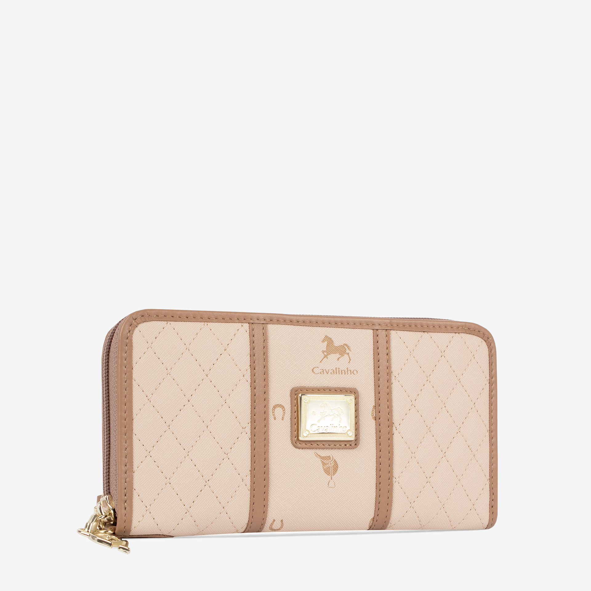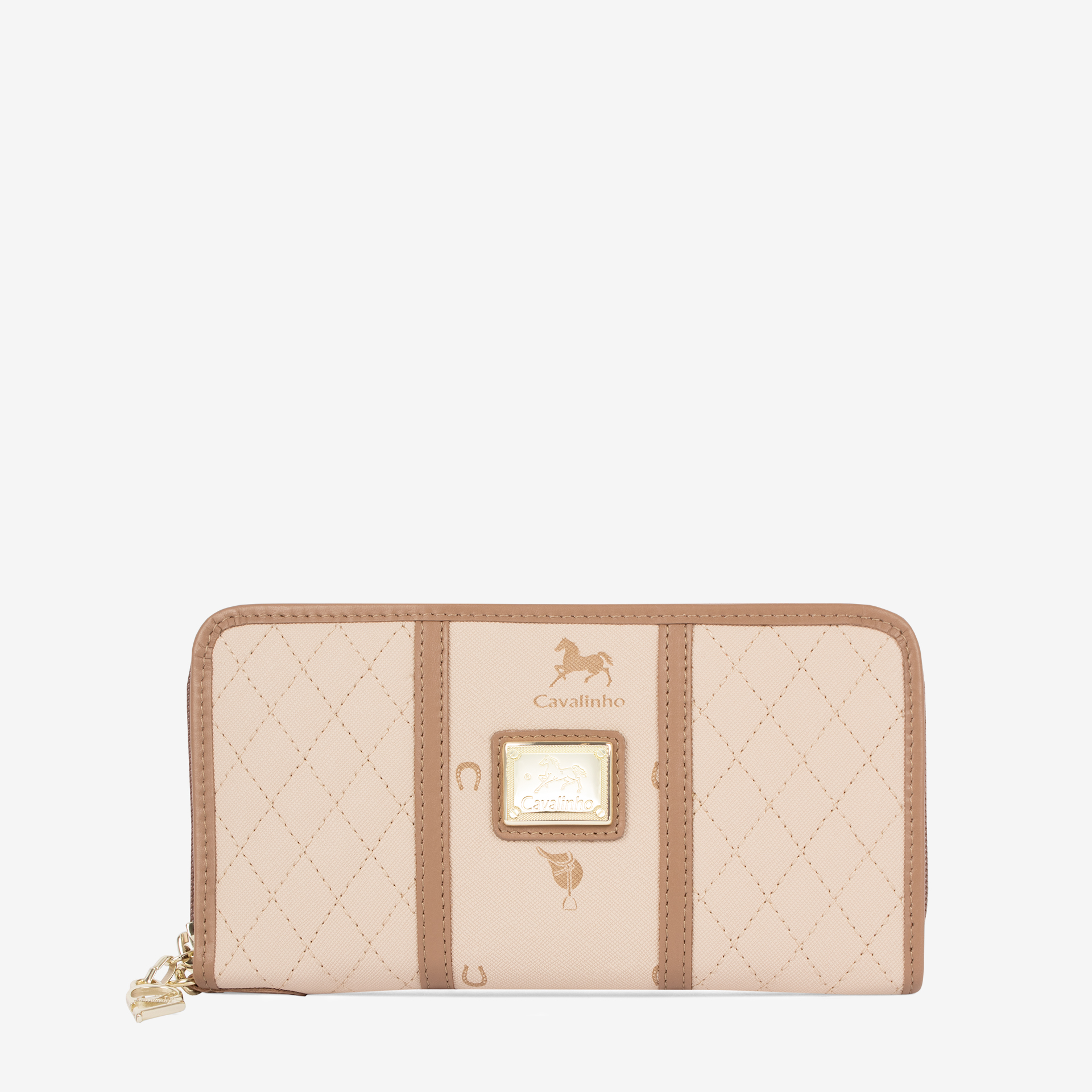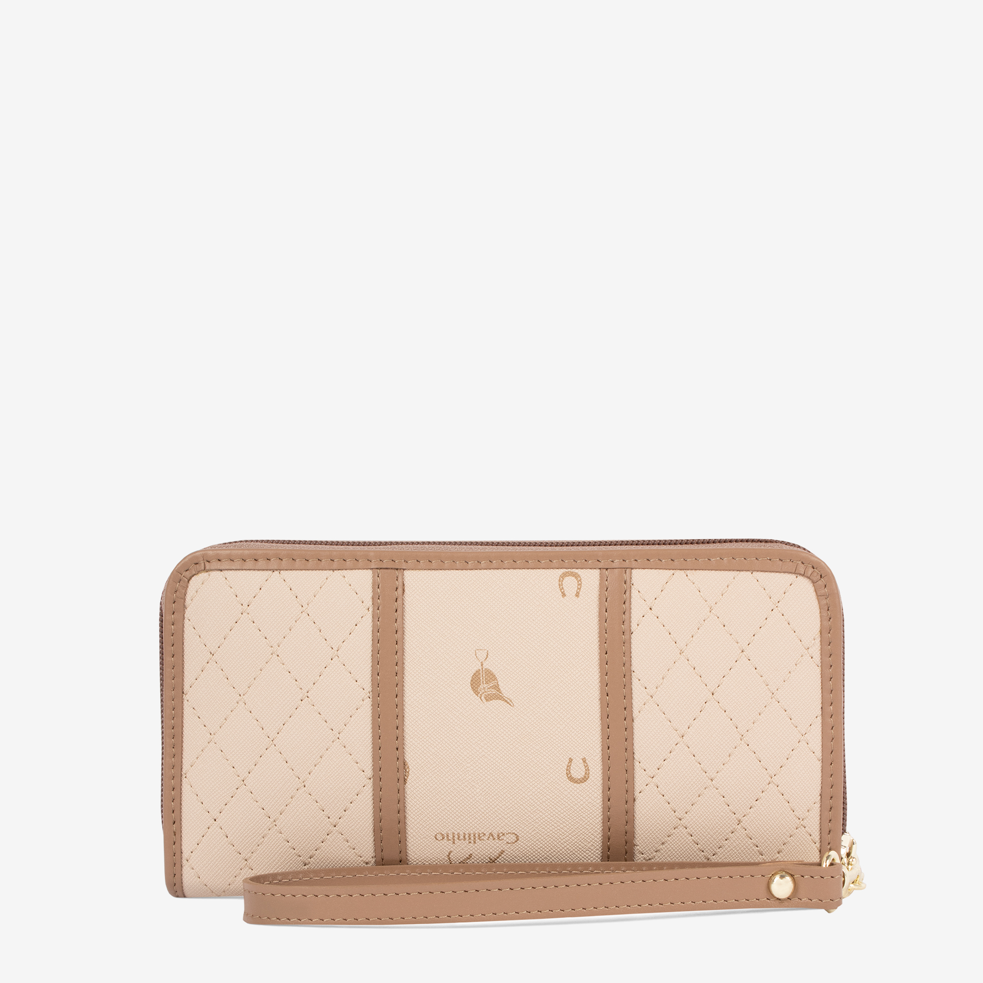 Carteira de documentos em tela com padrão losangular na cor bege. Divisória com forro em pele genuína e fecho de correr. Capacidade para doze cartões e três compartimentos livres. Integra um compartimento para moedas com fecho de correr. Alça de mão removível. Aplicações douradas.