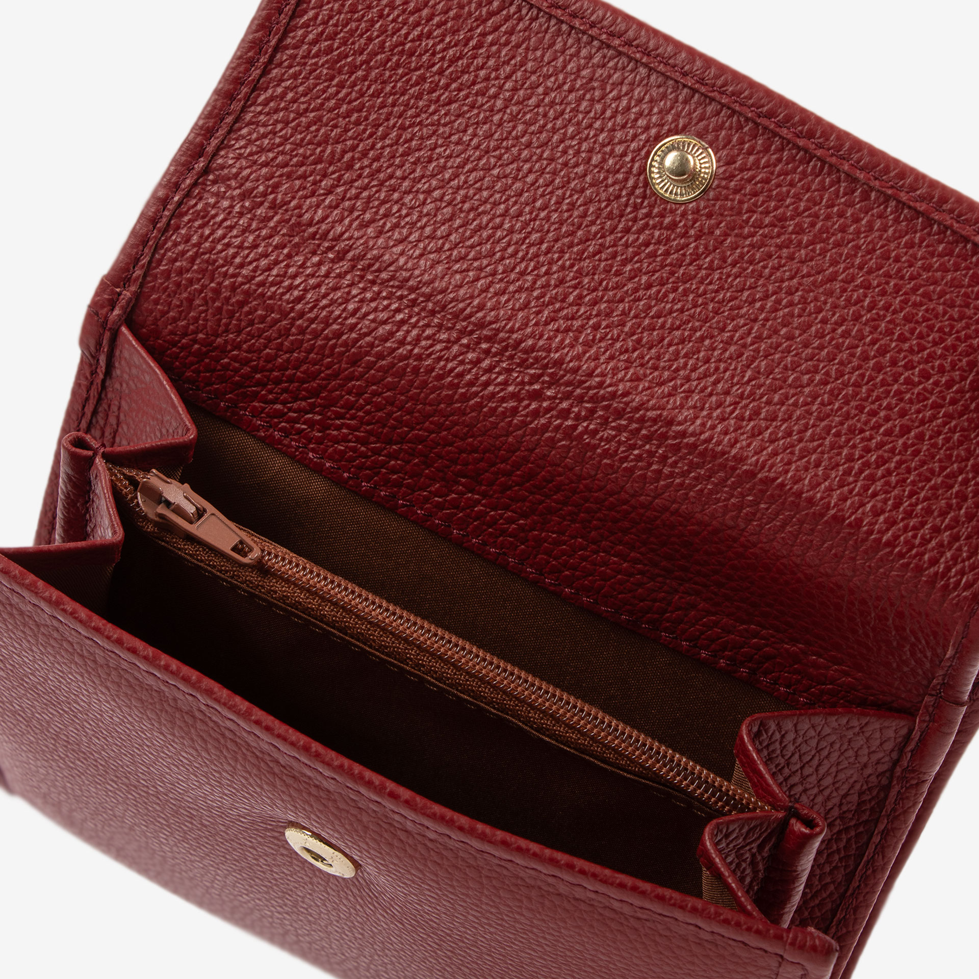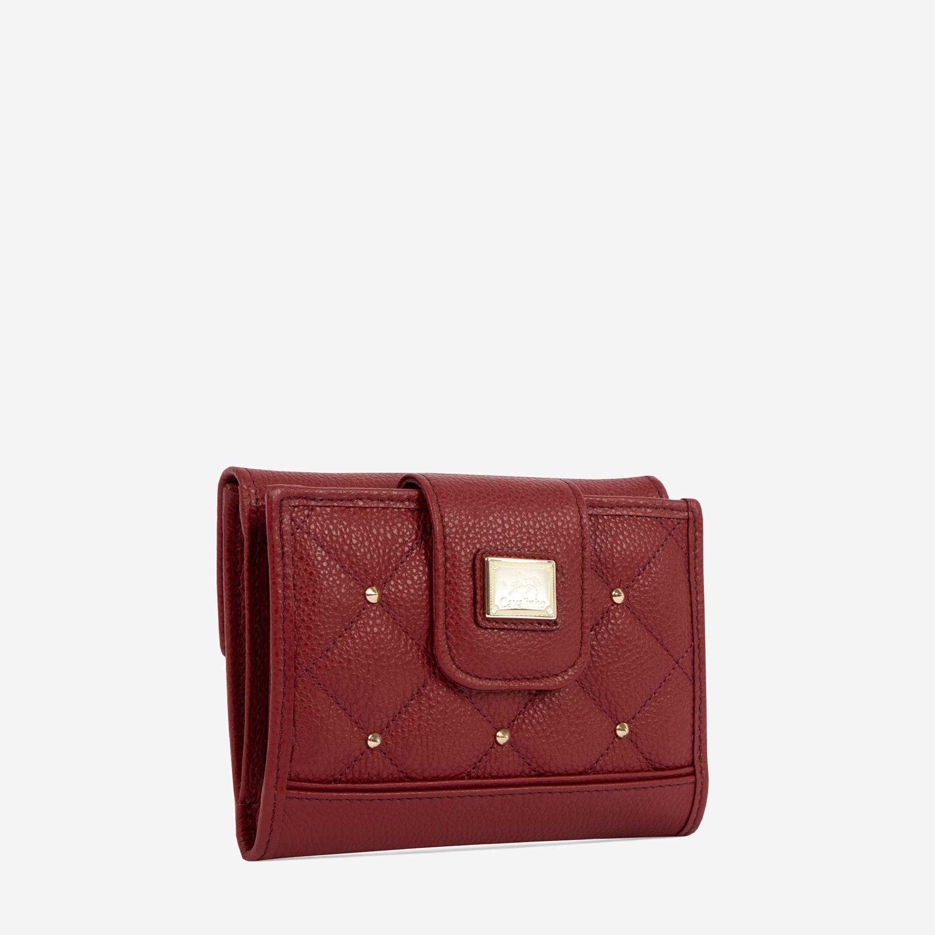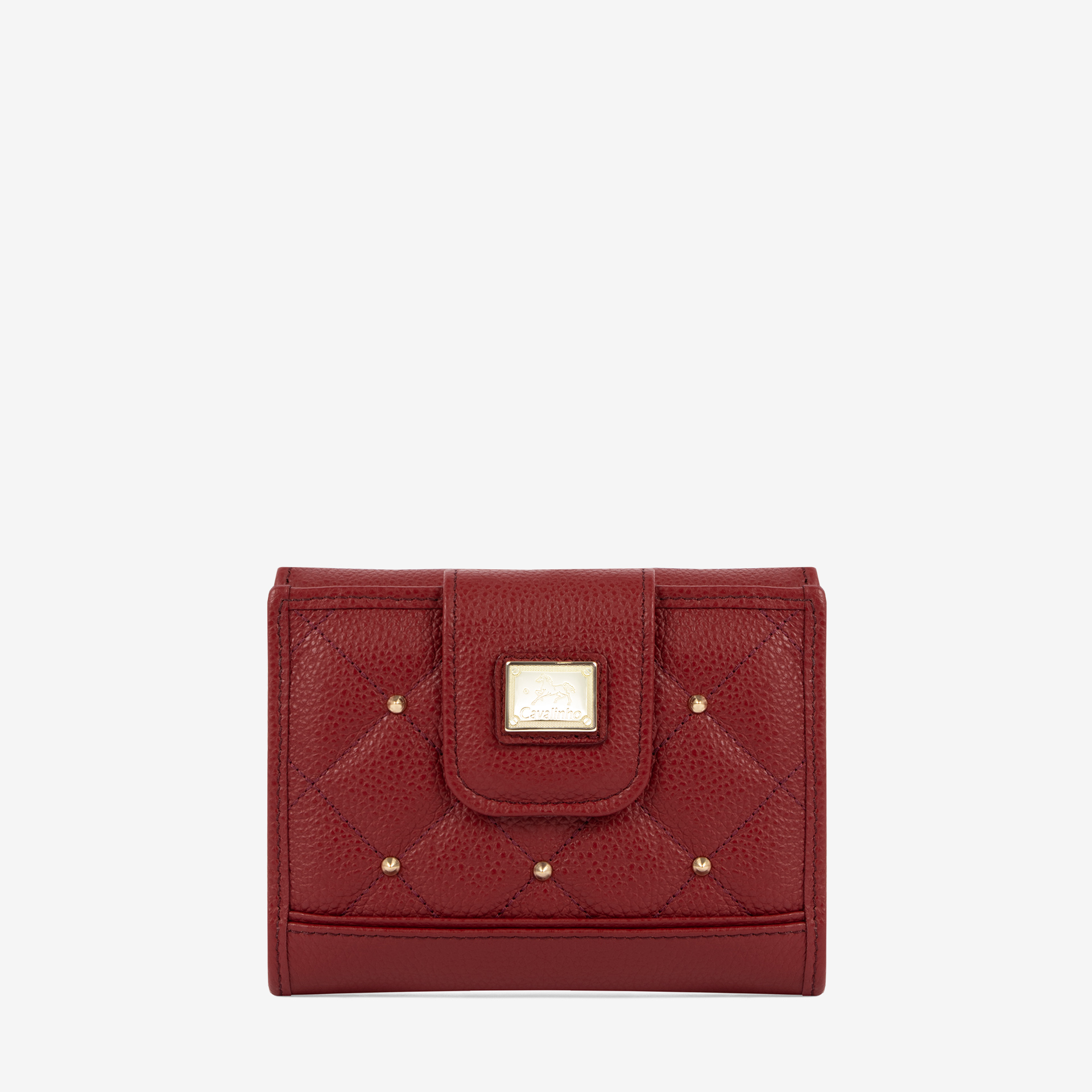 Carteira de documentos em pele genuína na cor bordô com tachas douradas. Duas divisórias: na frontal, dois compartimentos para notas, quatro bolsas transparentes e capacidade para doze cartões; na traseira, dois compartimentos livres e um com fecho de correr para moedas. Aplicações douradas.