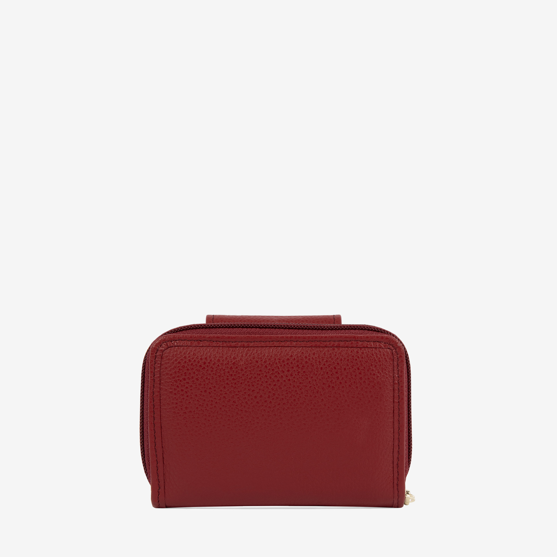 Carteira de documentos em pele genuína na cor bordô com tachas douradas. Duas divisões principais: na frontal, capacidade para dez cartões; na traseira, dois compartimentos livres para moedas com fecho de correr. Aplicações douradas.