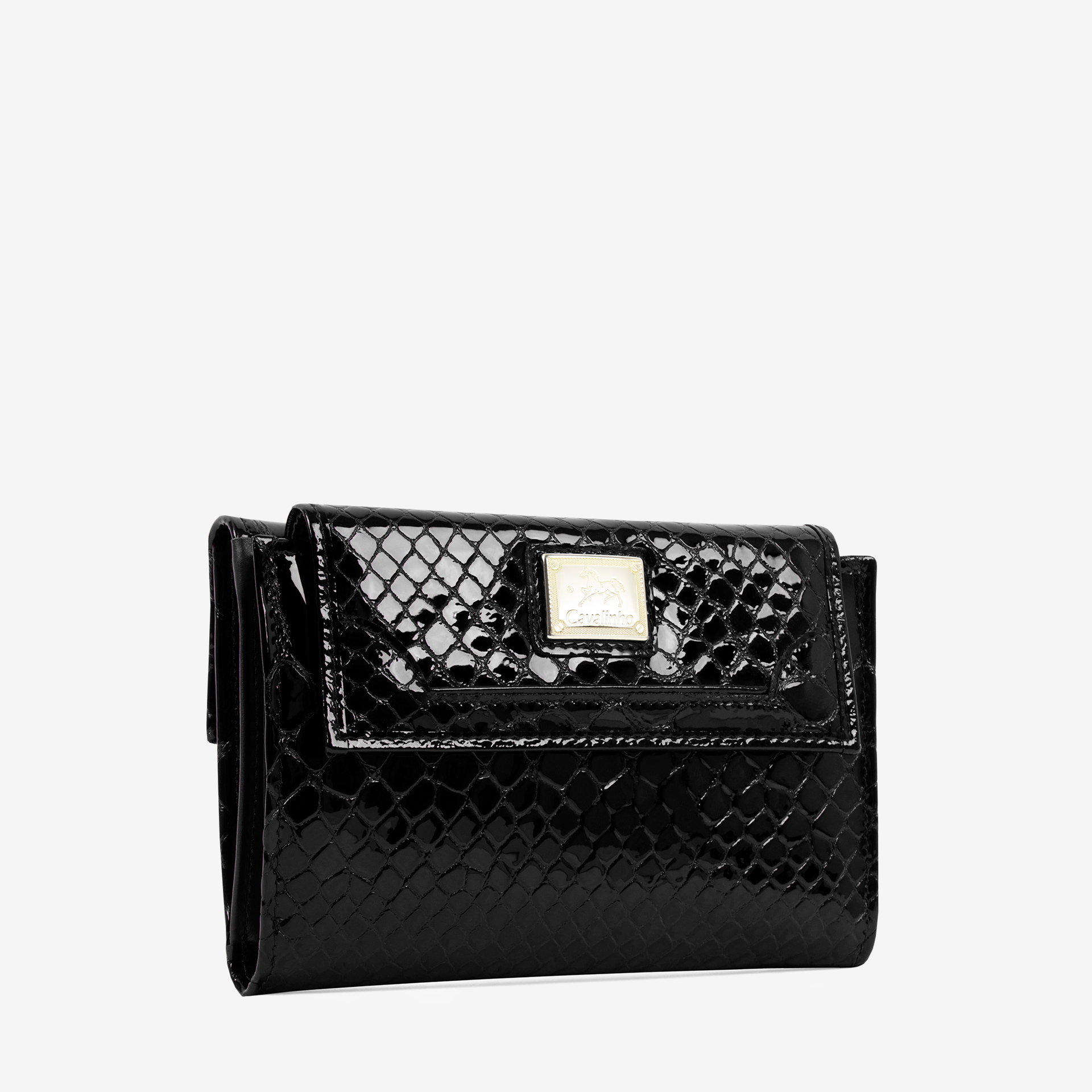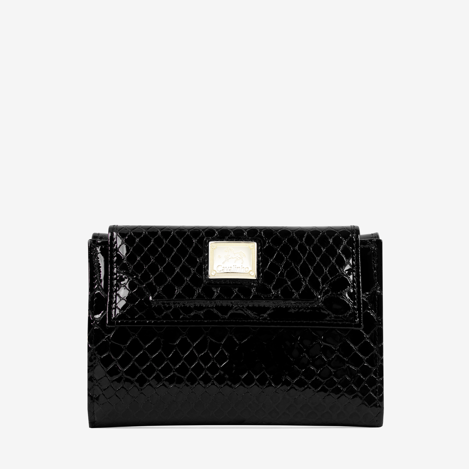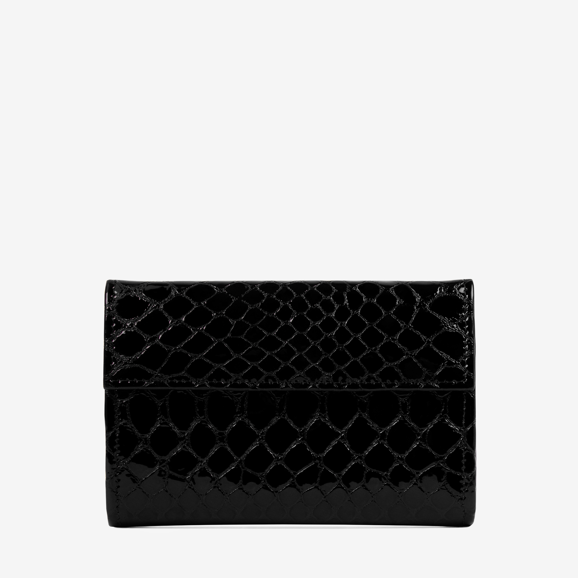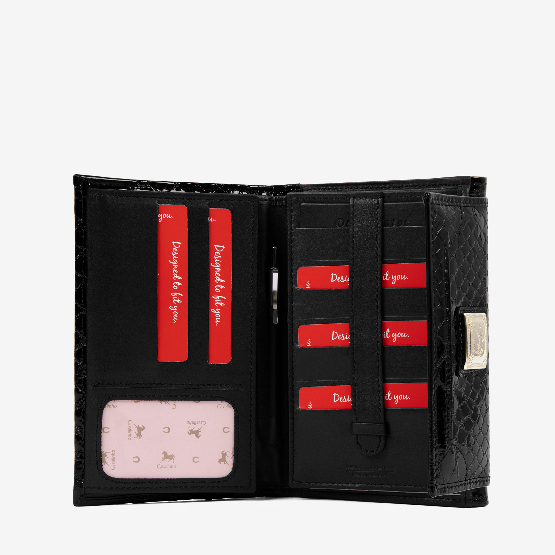 Carteira em pele envernizada com duas divisórias: na frontal, um compartimento com capacidade para dezassete cartões, um passe para documentos; um compartimento para notas e quatro bolsas transparentes; na traseira, três compartimentos, dois livres e um para moedas com fecho de correr. Inclui compartimento para caneta. Aplicações douradas.