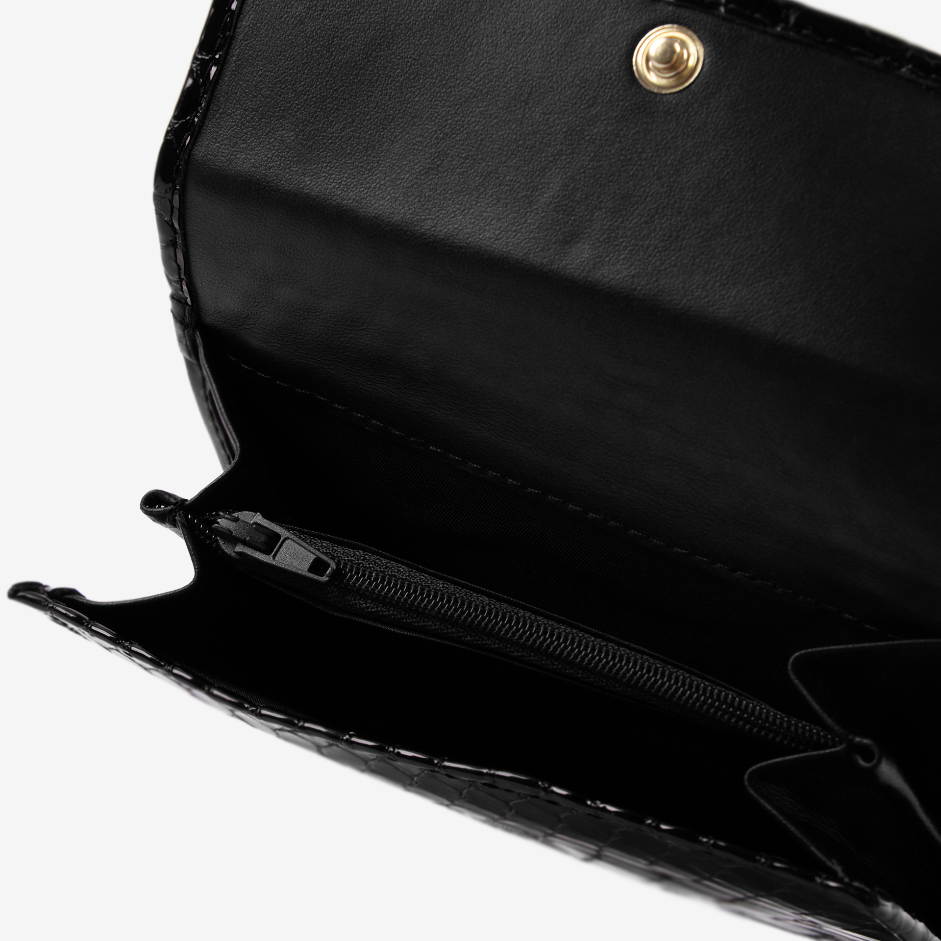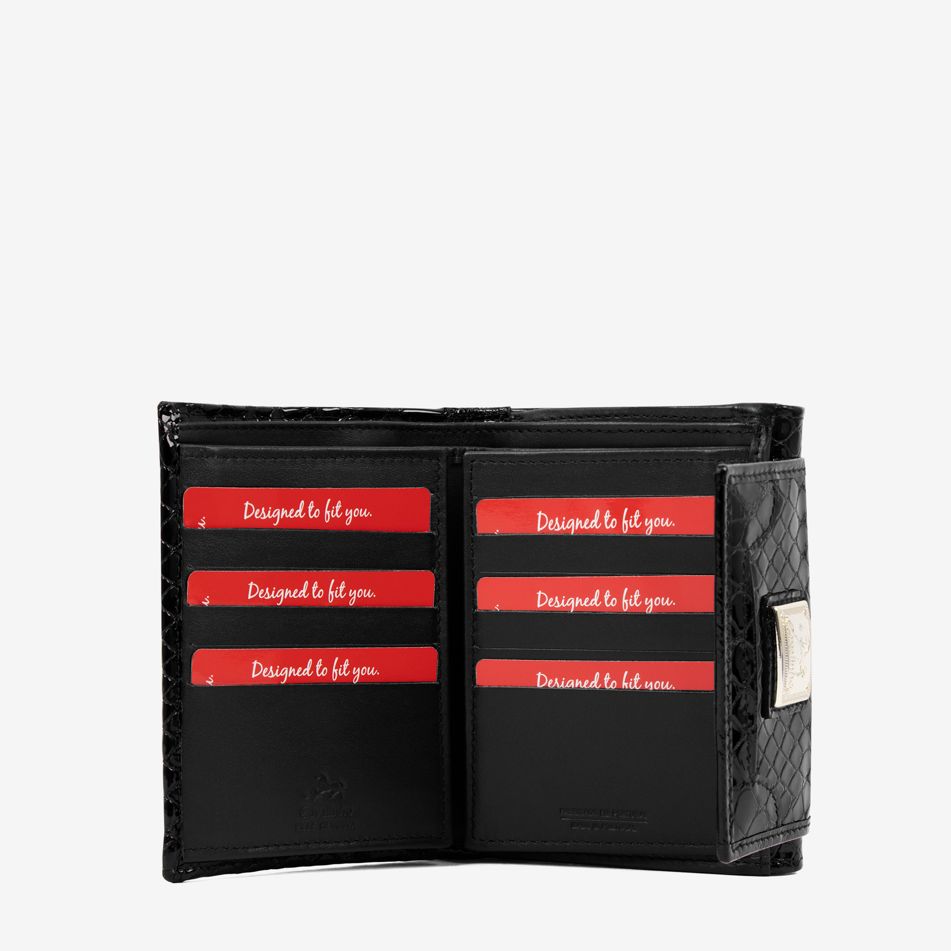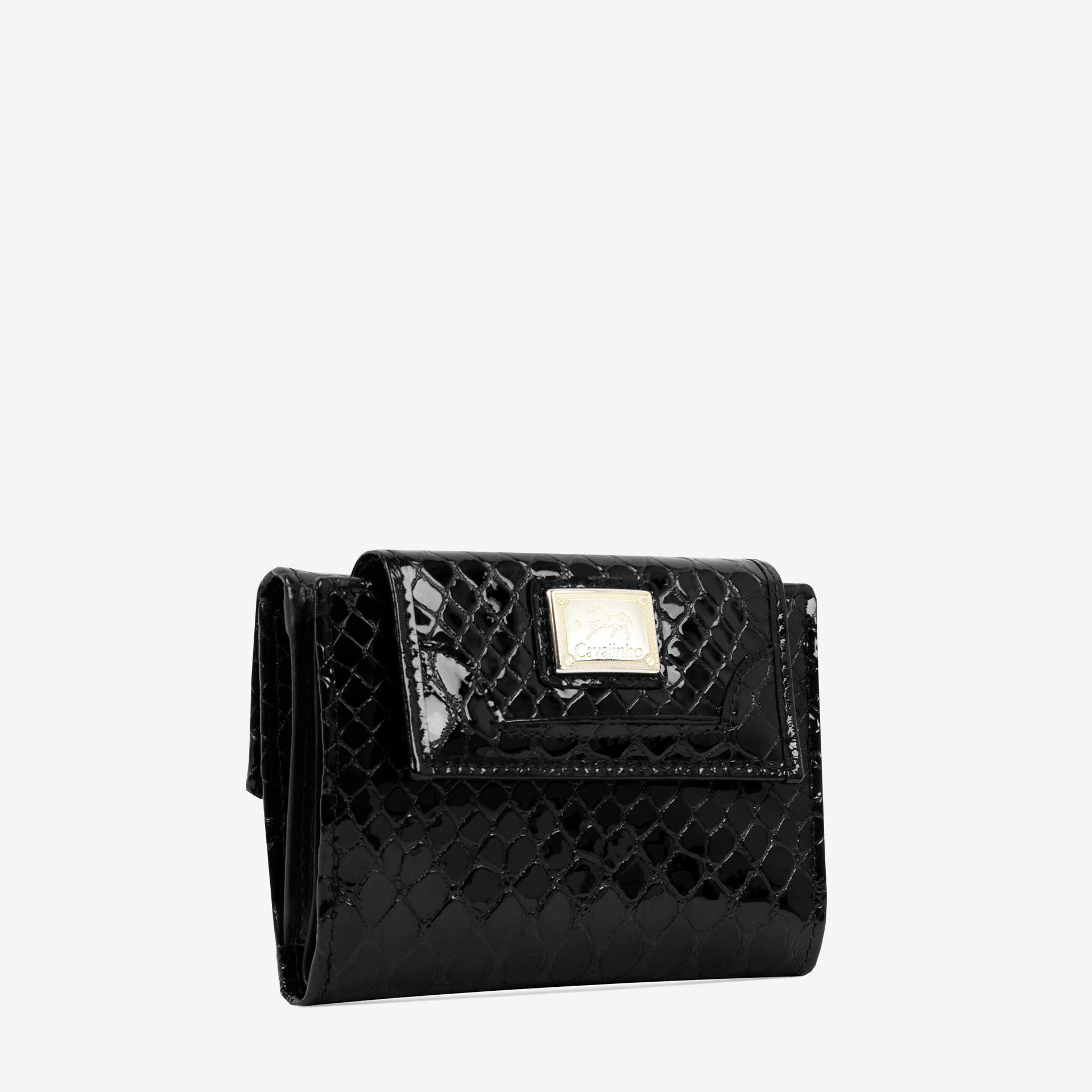 Carteira em pele envernizada com duas divisórias: na frontal, capacidade para doze cartões, dois compartimentos para notas e quatro bolsas transparentes; na traseira, dois compartimentos livres e um para moedas com fecho de correr. Aplicações douradas.