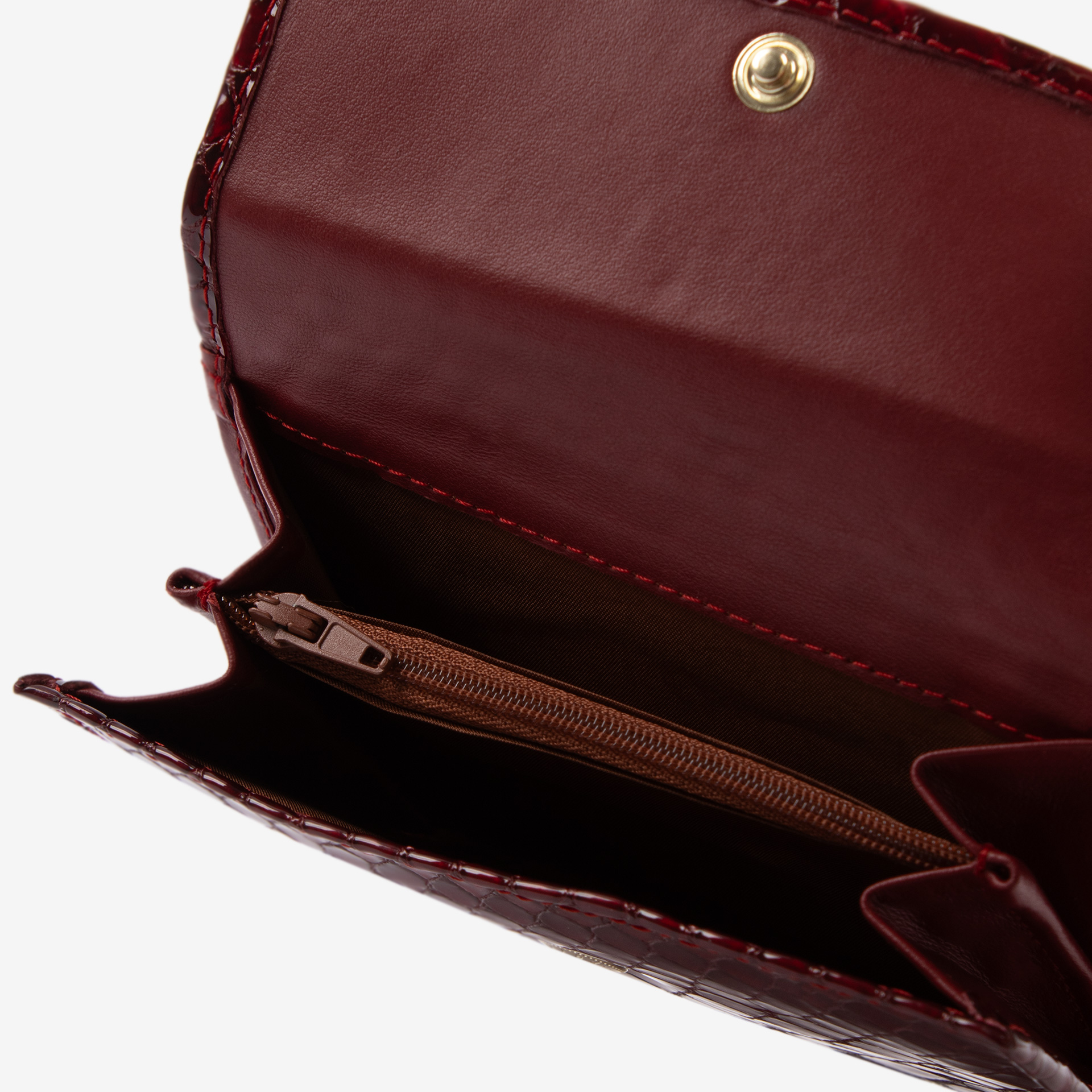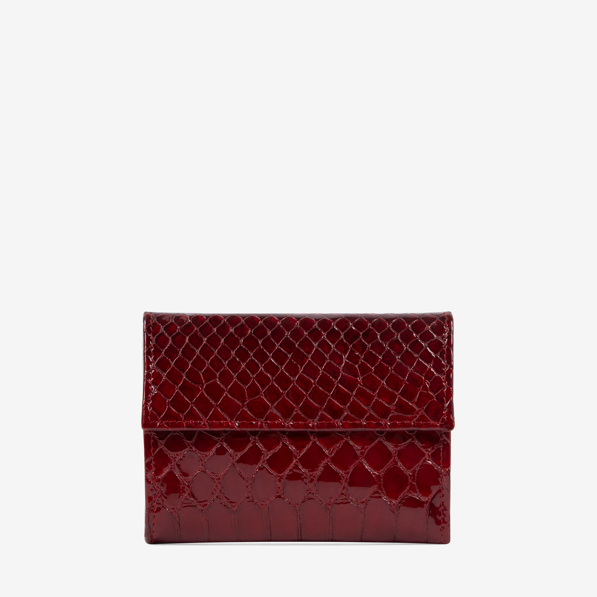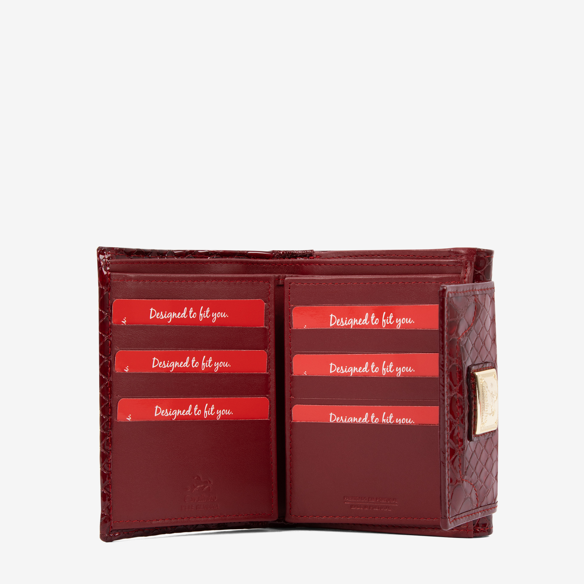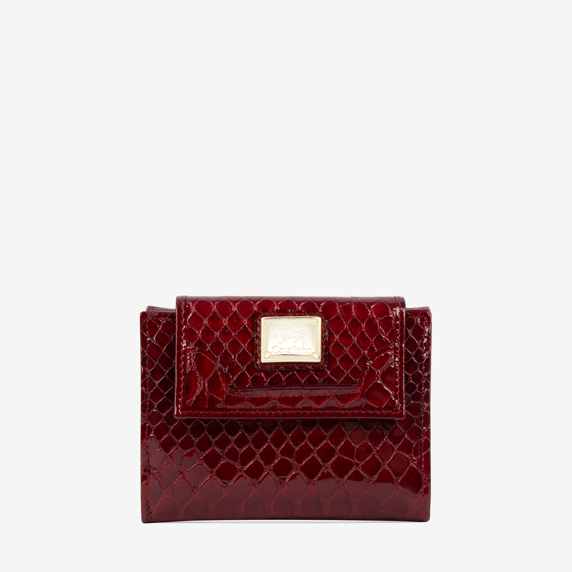 Carteira em pele envernizada com duas divisórias: na frontal, capacidade para doze cartões, dois compartimentos para notas e quatro bolsas transparentes; na traseira, dois compartimentos livres e um para moedas com fecho de correr. Aplicações douradas.