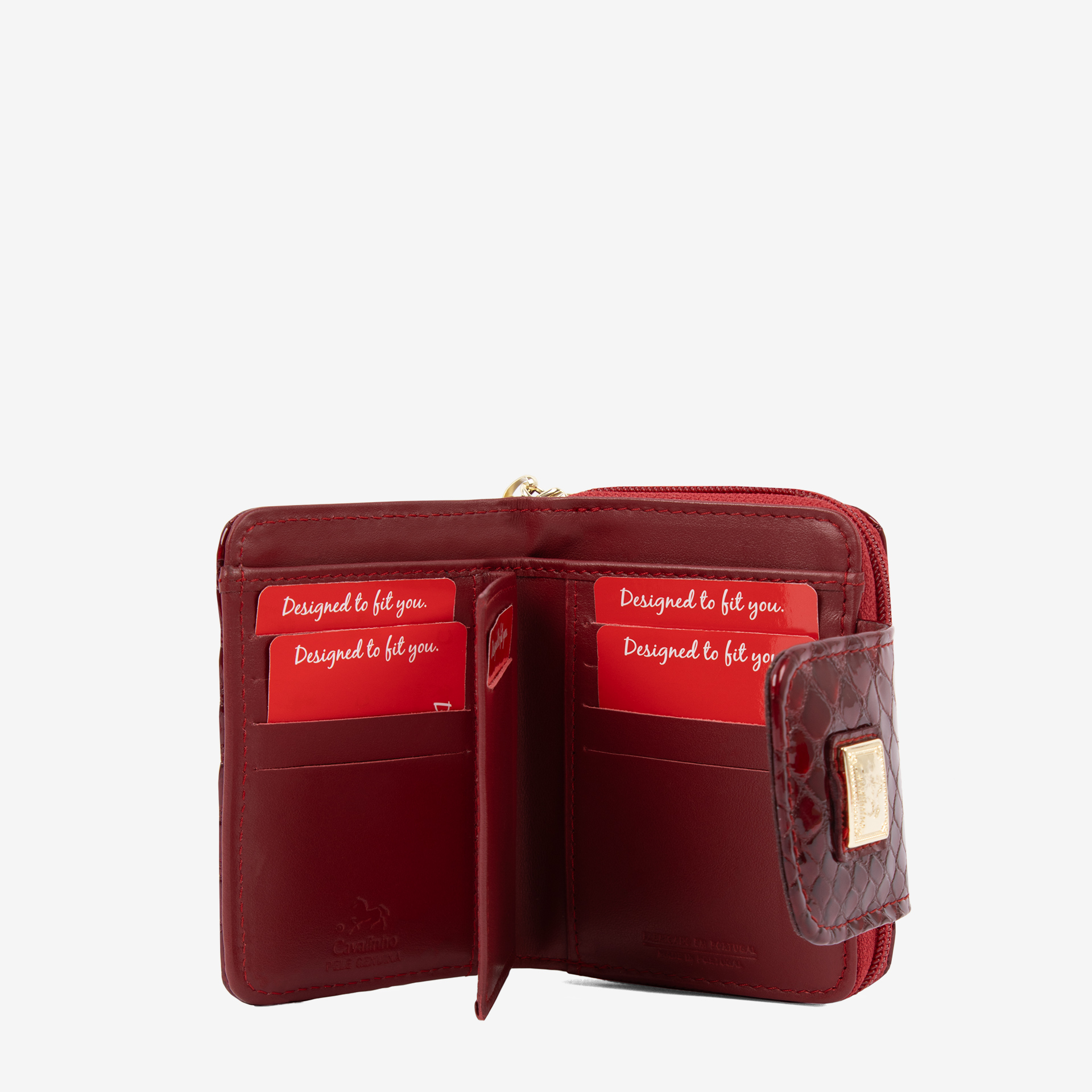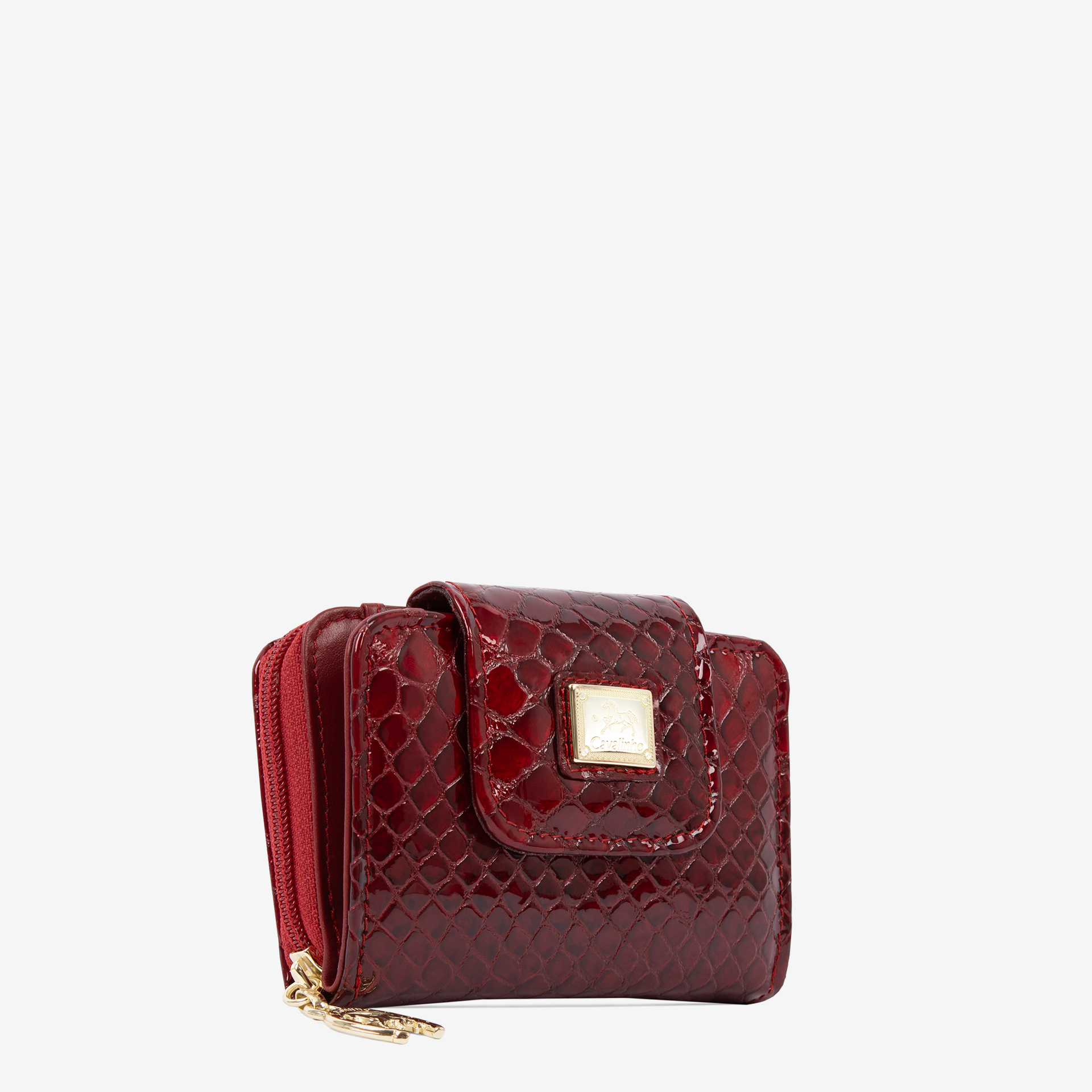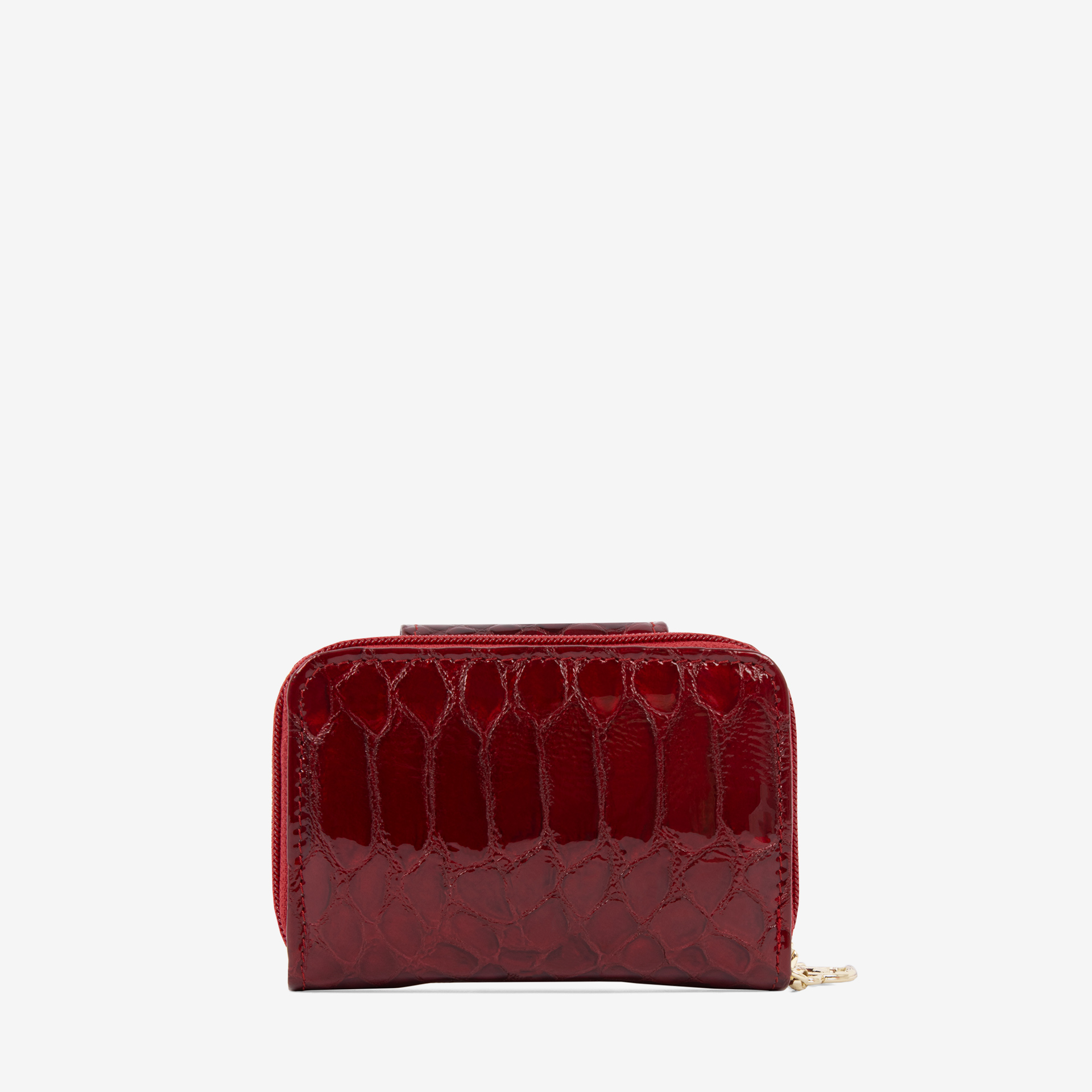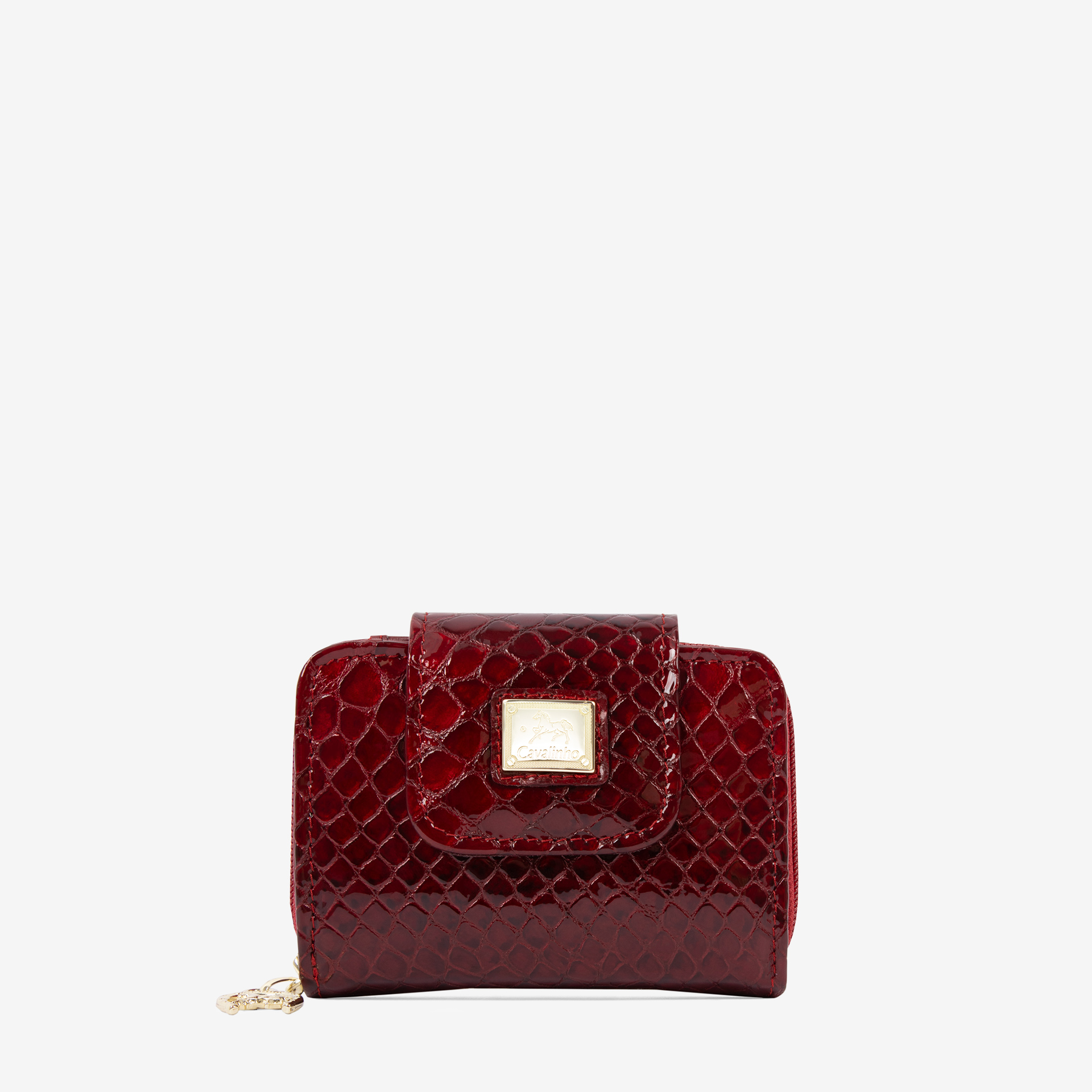Carteira em pele envernizada com duas divisões: na frontal, capacidade para dez cartões e fecho de aba com mola; na traseira, dois compartimentos livres para moedas com fecho de correr. Aplicações douradas.