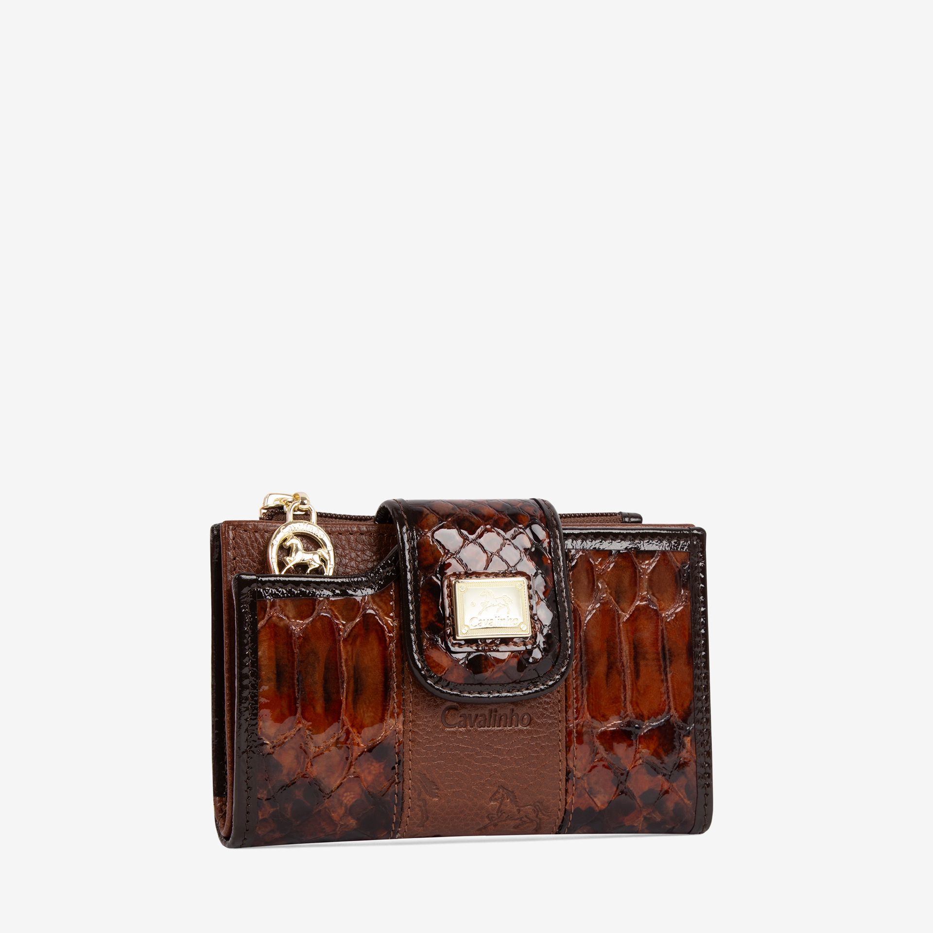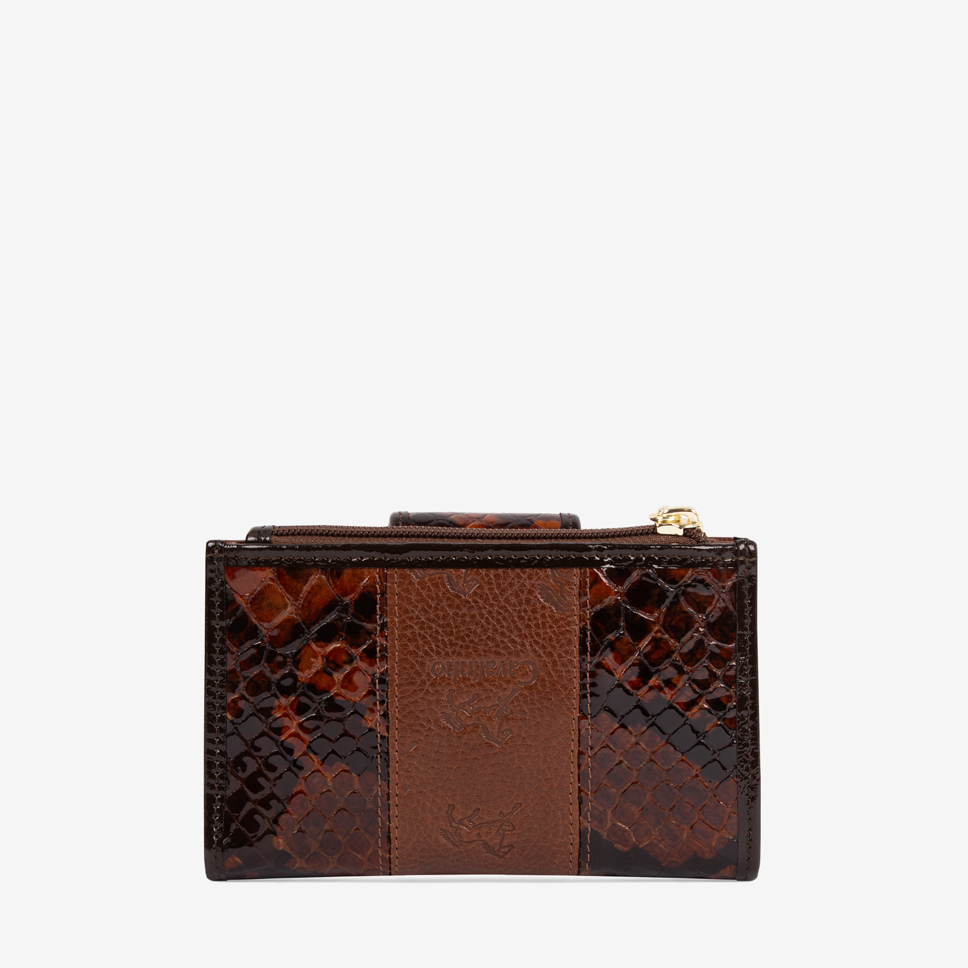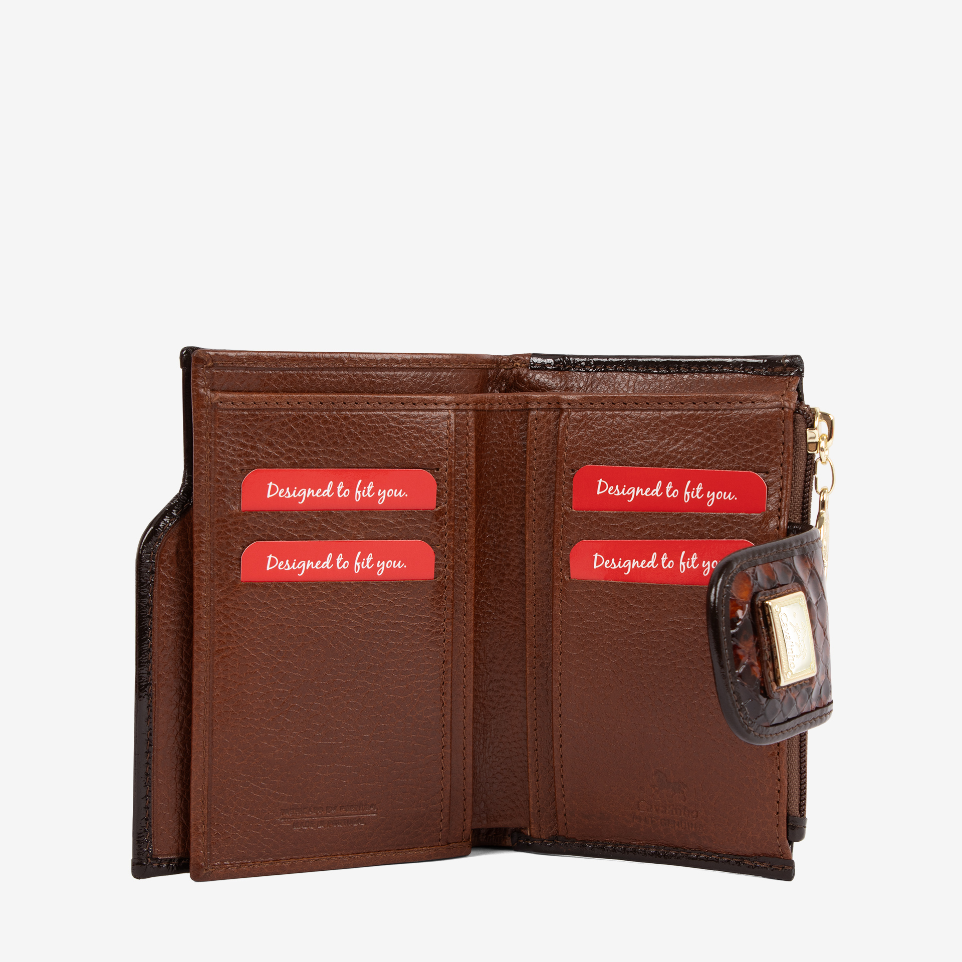 Carteira de documentos numa mistura de pele envernizada e genuína, na cor camel. Duas divisórias principais: na frontal, um compartimento para notas, duas bolsas transparentes e capacidade para catorze cartões; na traseira, um compartimento para moedas com fecho de correr. Aplicações douradas.