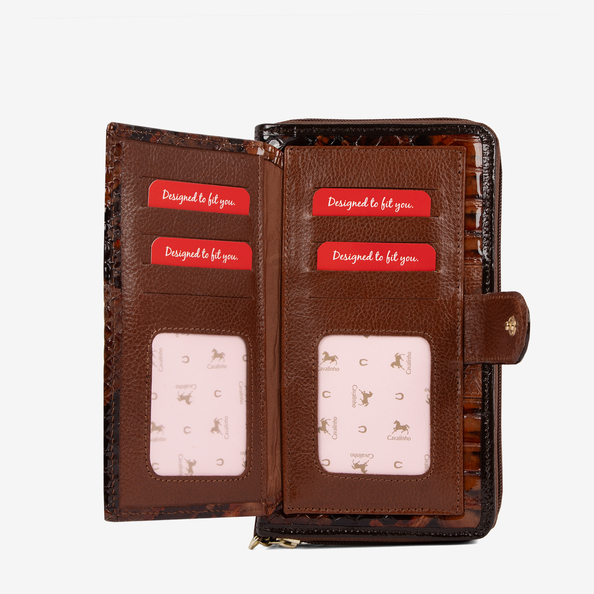 Carteira de documentos em pele envernizada e genuína, na cor camel. Duas divisórias: na frontal, dois compartimentos livres, um de moedas com fecho de correr, uma bolsa transparente e duas zonas com capacidade para doze cartões; na traseira, duas bolsas transparentes e capacidade para doze cartões. Pode ser utilizada como clutch, através da mini alça de mão. Aplicações douradas.