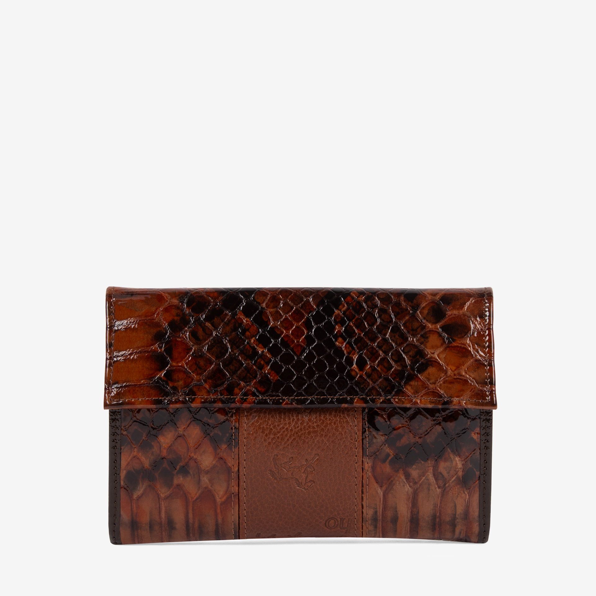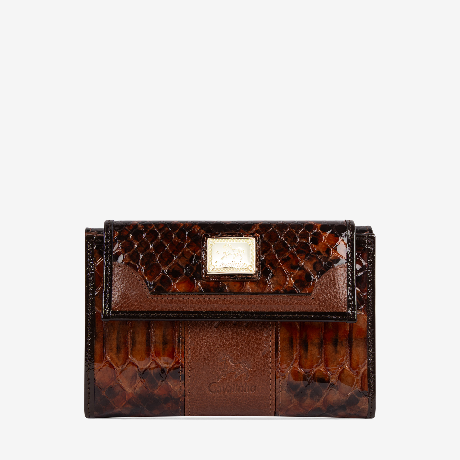 Carteira em pele envernizada e genuína, na cor camel, com duas divisórias: na frontal, uma compartimento para notas, quatro bolsas transparentes, uma divisão para caneta e capacidade para dezassete cartões e um passe para documentos; na traseira, três compartimentos, dois livres e um com fecho de correr para moedas. Aplicações douradas.