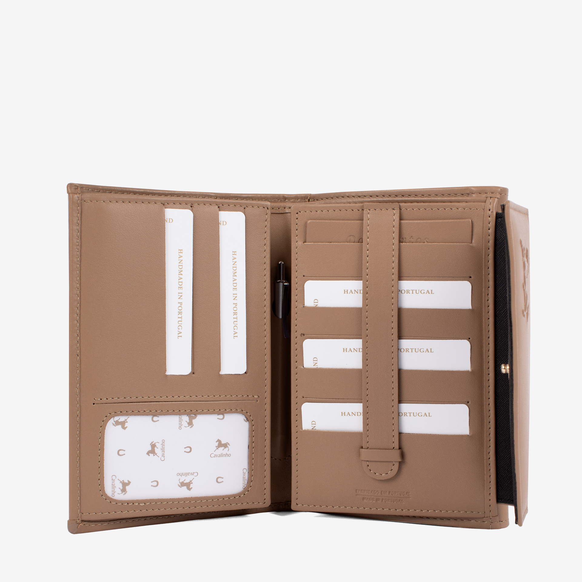 Carteira em tela . Integra duas divisórias: na frontal, uma compartimento para notas, quatro bolsas transparentes, uma divisão para caneta e capacidade para dezassete cartões e um passe para documentos; na traseira, três compartimentos, dois livres e um com fecho de correr para moedas. Detalhes em pele genuína.