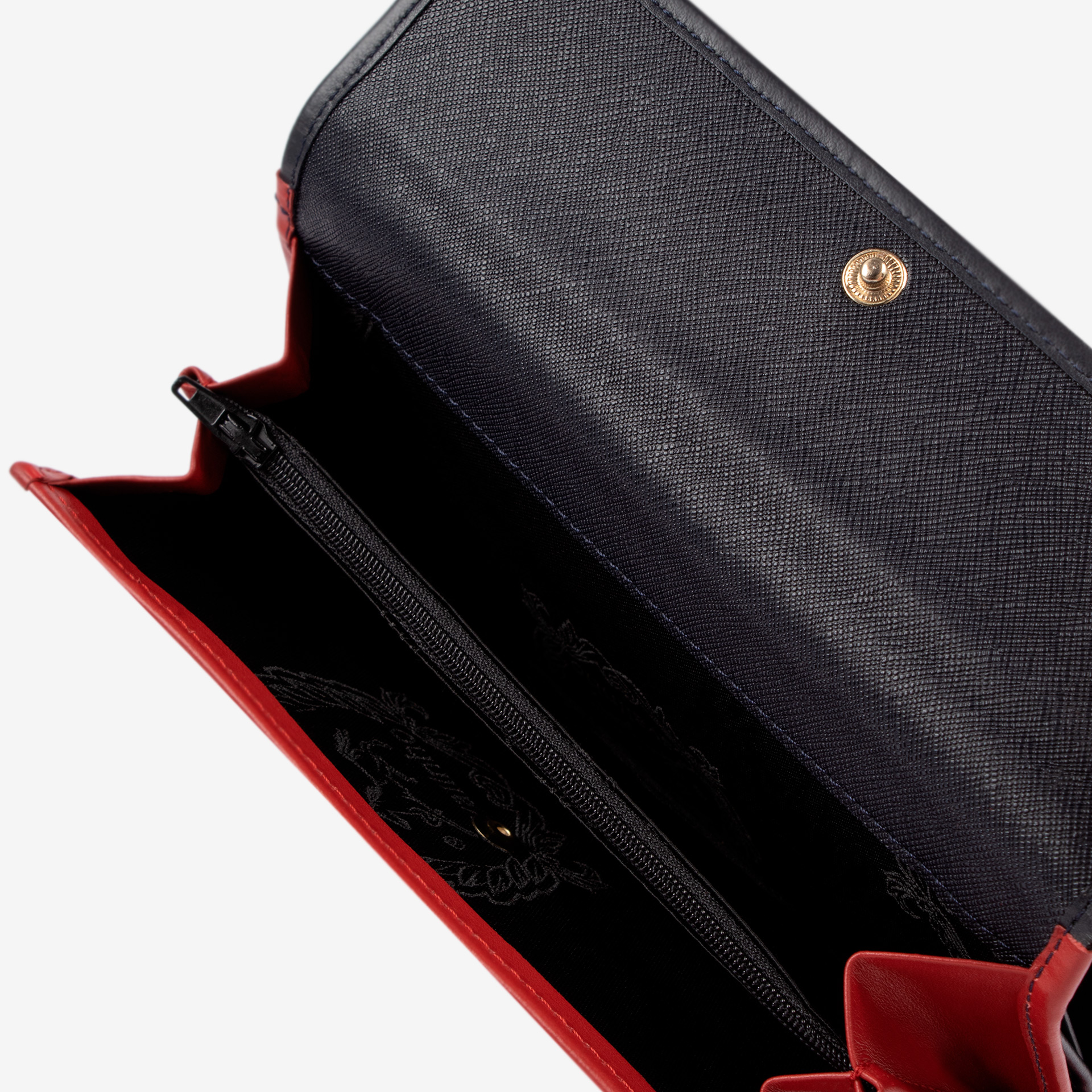 Carteira de documentos em telaazul,branca e vermelha com detalhes em pele genuína. Duas divisórias: na frontal, uma compartimento para notas, quatro bolsas transparentes, uma divisão para caneta e capacidade para dezassete cartões e um passe para documentos; na traseira, três compartimentos, dois livres e um com fecho de correr para moedas. Gravação de logótipo na pala.