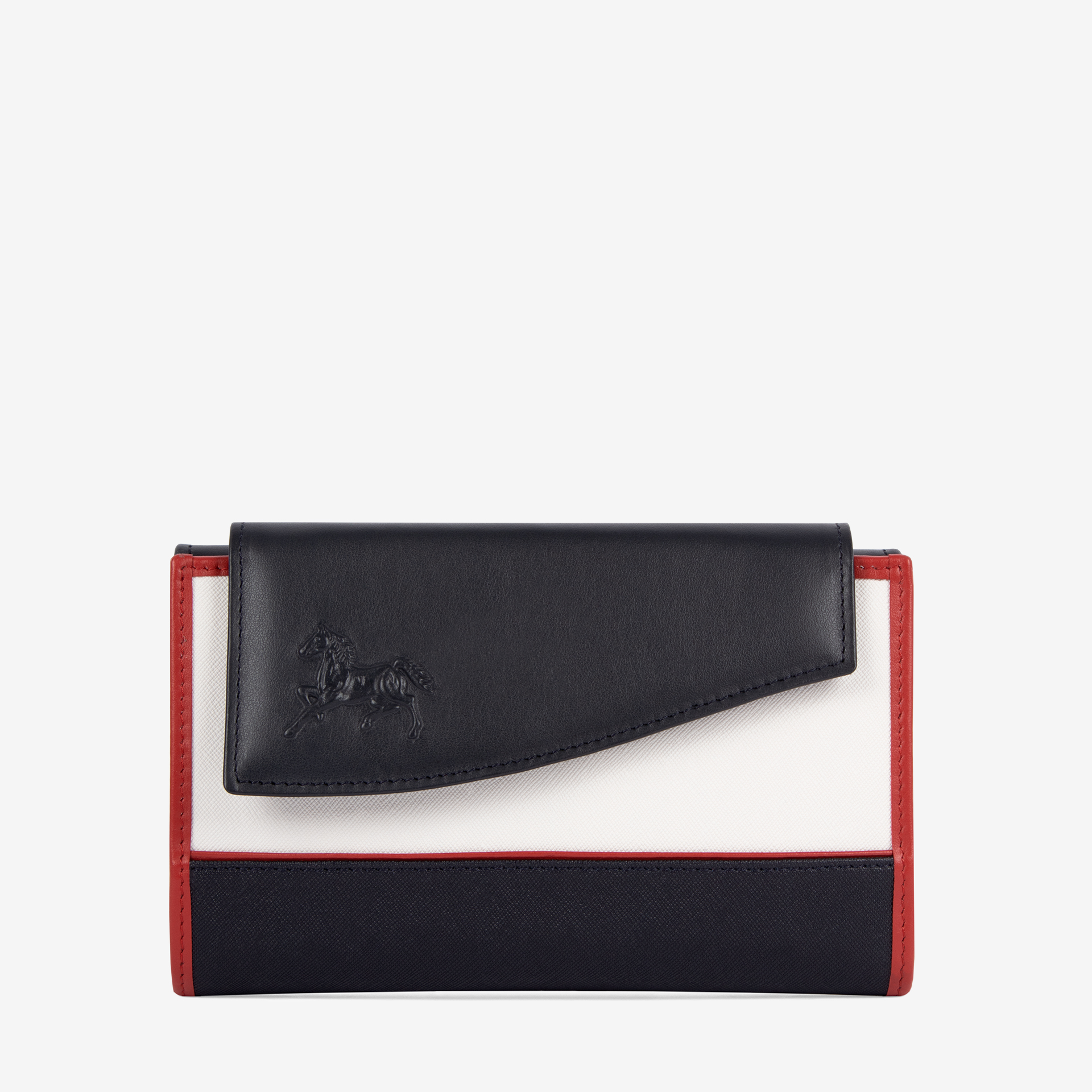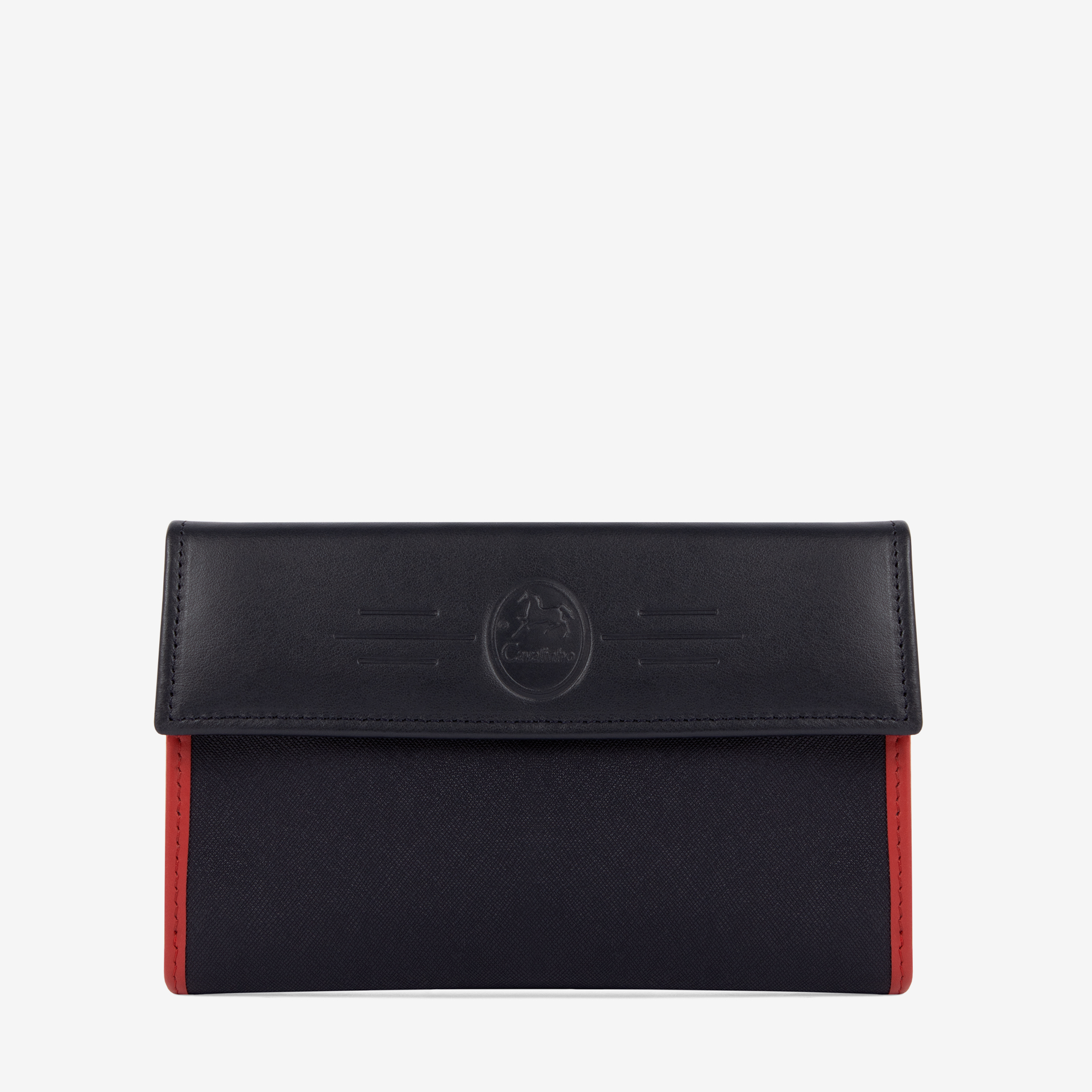 Carteira de documentos em tela azul,branca e vermelha com detalhes em pele genuína . Duas divisórias: na frontal, um compartimento para notas, três bolsas transparentes, uma divisão para caneta, capacidade para vinte e sete cartões, um passe para documentos e um bolso com fecho de correr; na traseira, três compartimentos, dois livres e um com fecho de correr para moedas. Gravação de logótipo na pala.