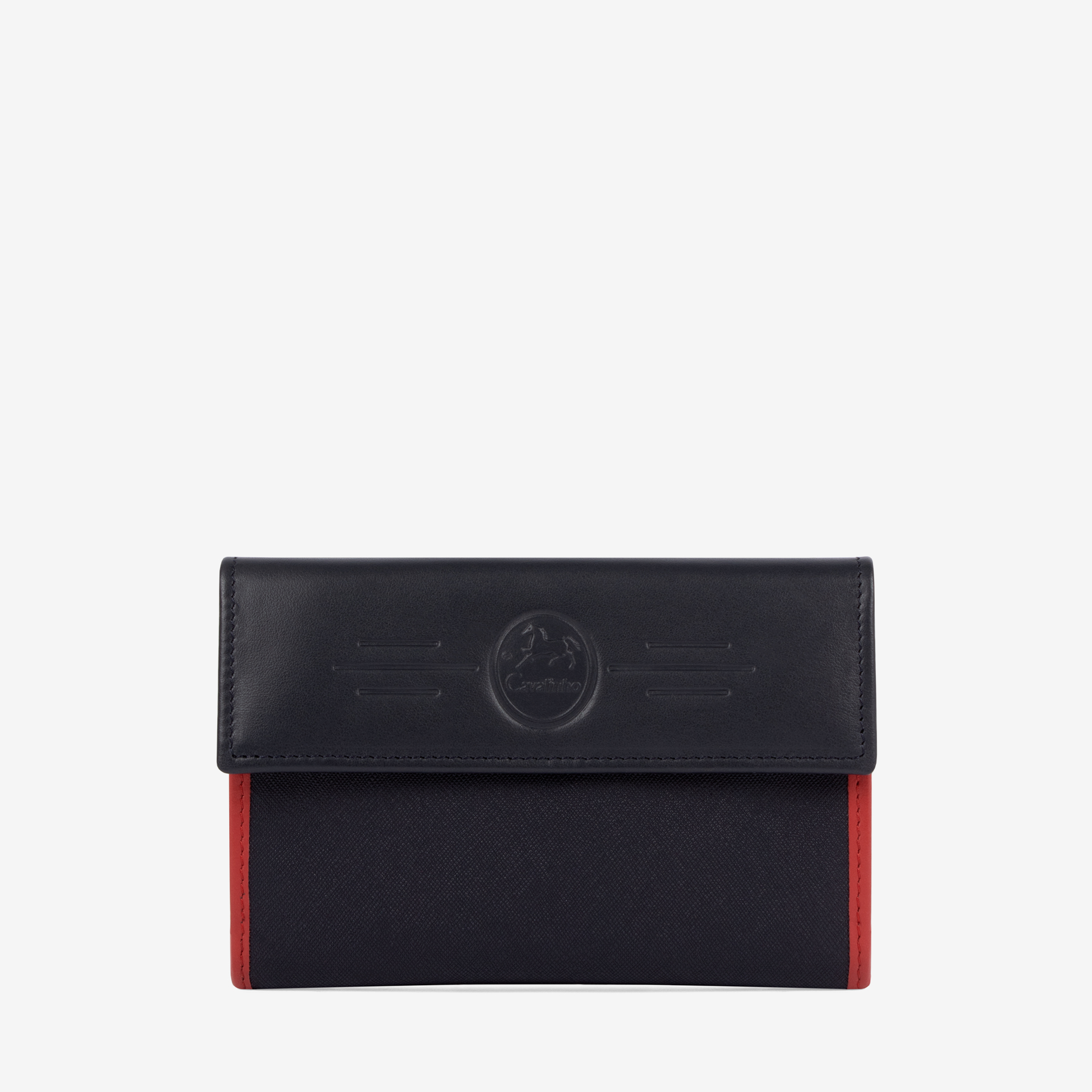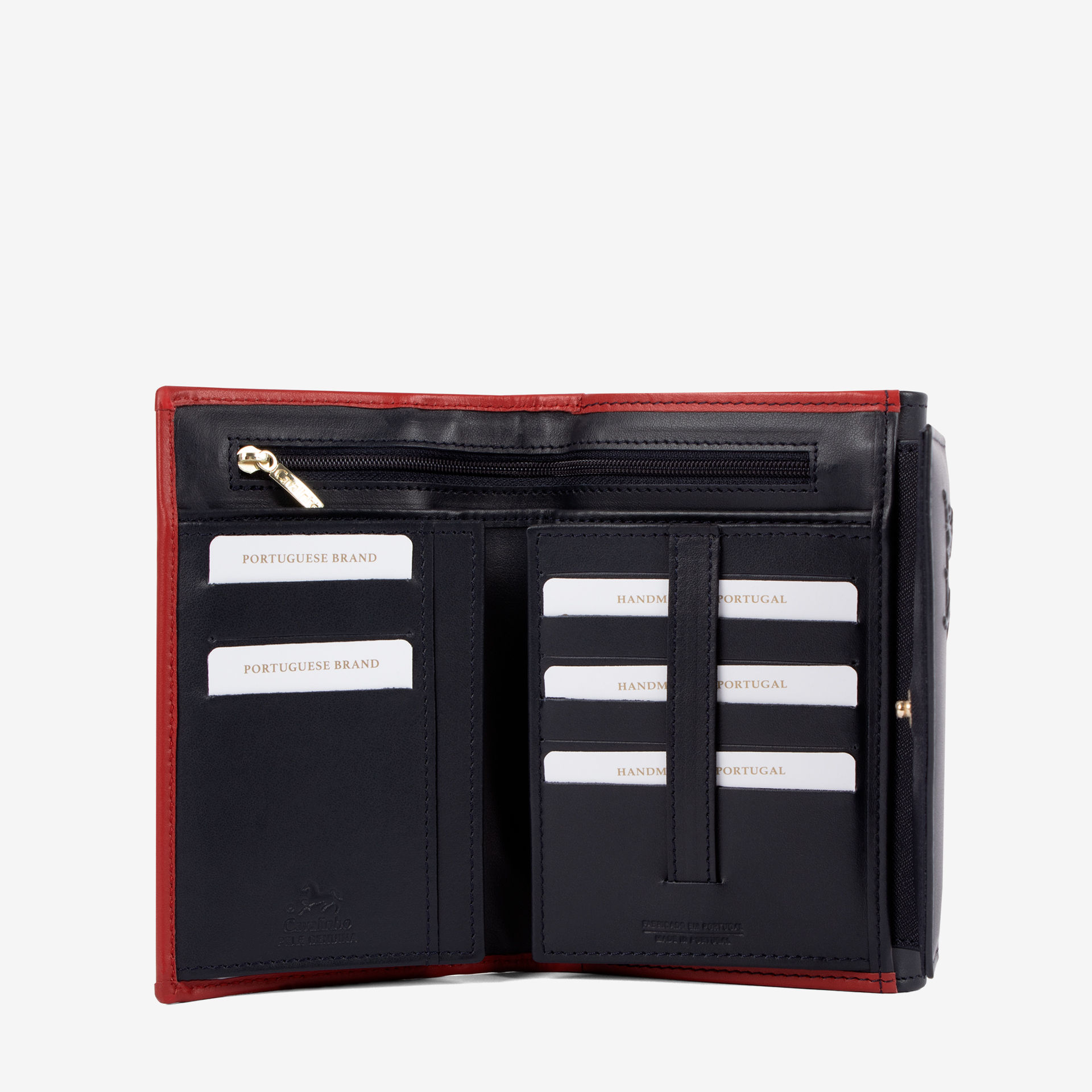 Carteira de documentos em tela azil,branca e vermelha com detalhes em pele genuína . Duas divisórias principais: na frontal, um compartimento para notas, três bolsas transparentes, um bolso com fecho de correr e três divisões com capacidade total para quinze cartões; na traseira, dois compartimentos livres e um com fecho de correr para moedas. Gravação de logótipo na pala.