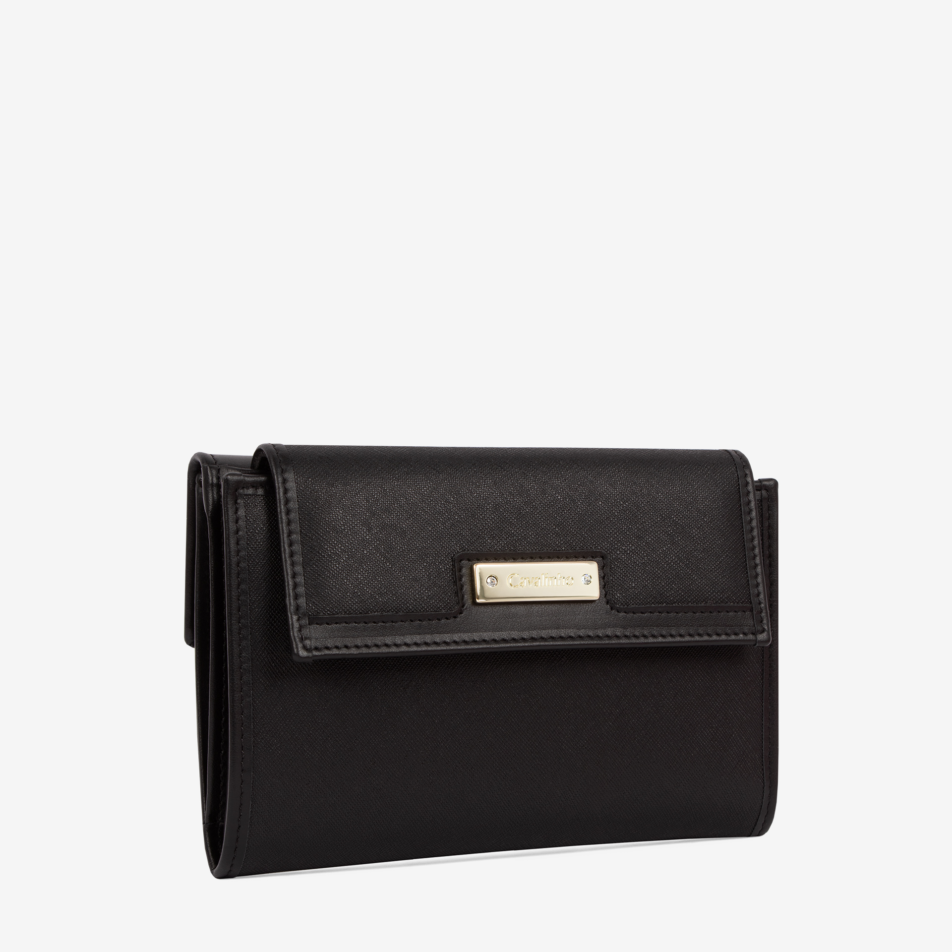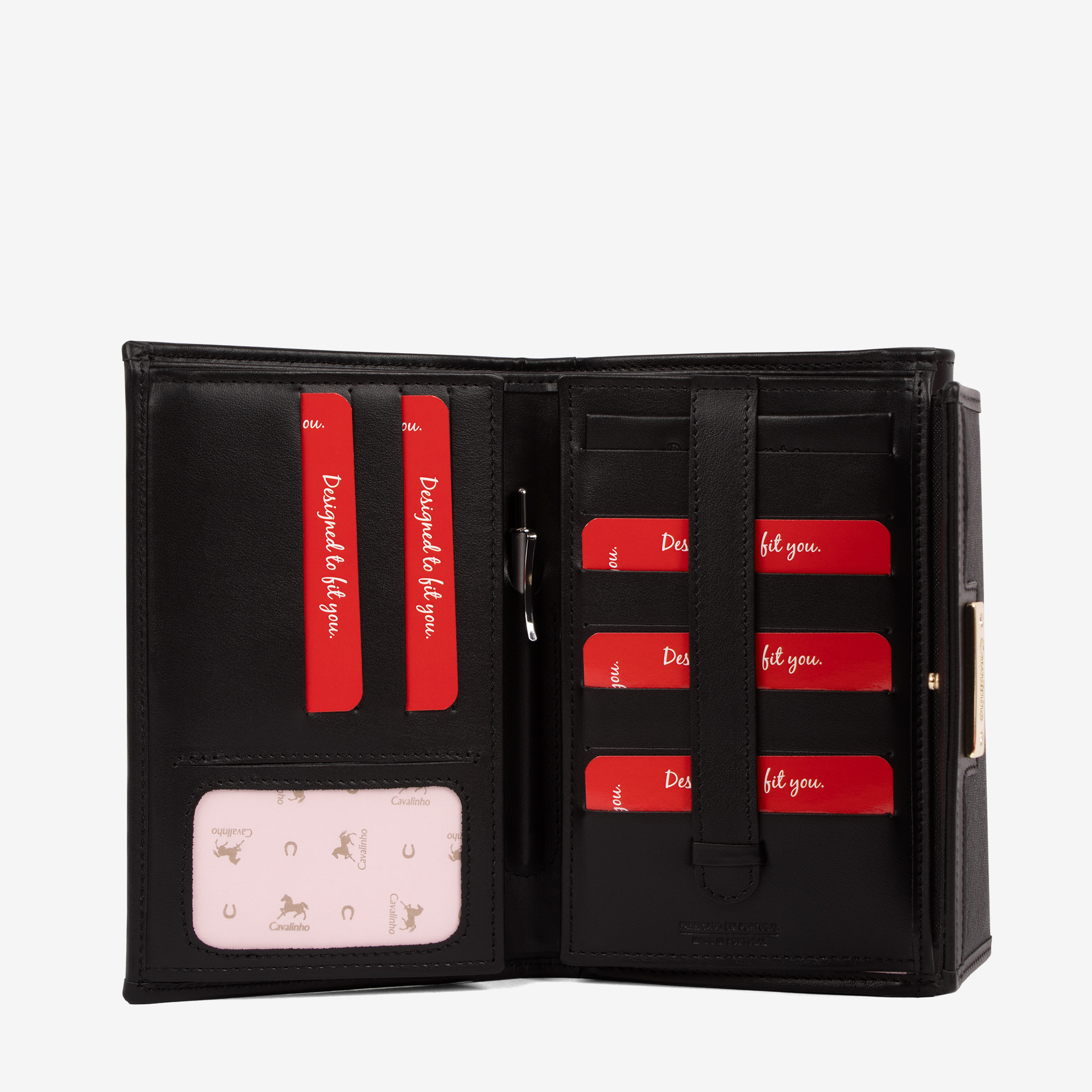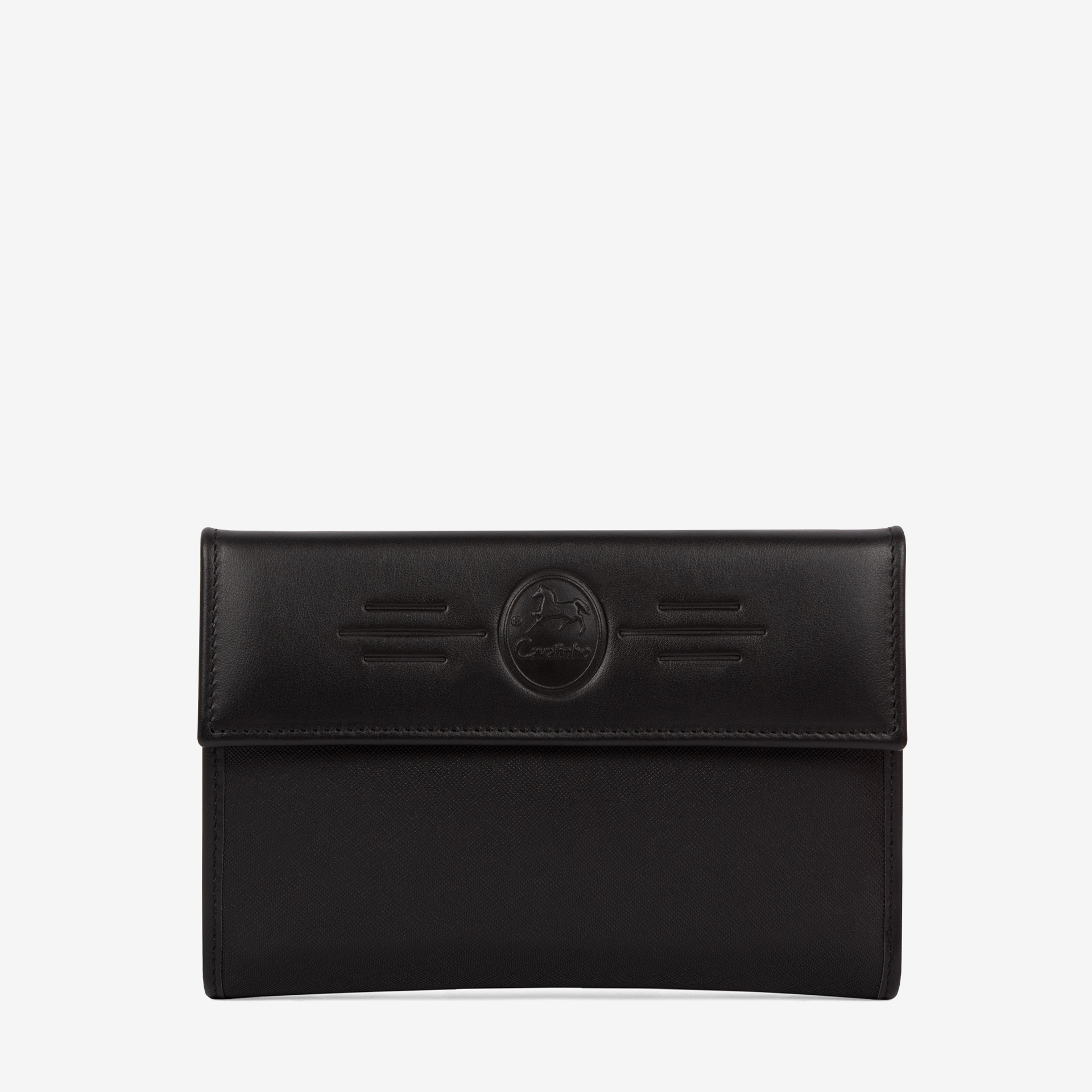 Carteira de documentos em tela e com pormenores em pele genuína, na cor preto. Duas divisórias: na frontal, uma compartimento para notas, quatro bolsas transparentes, uma divisão para caneta e capacidade para dezassete cartões e um passe para documentos; na traseira, três compartimentos, dois livres e um com fecho de correr para moedas. Aplicações douradas.
