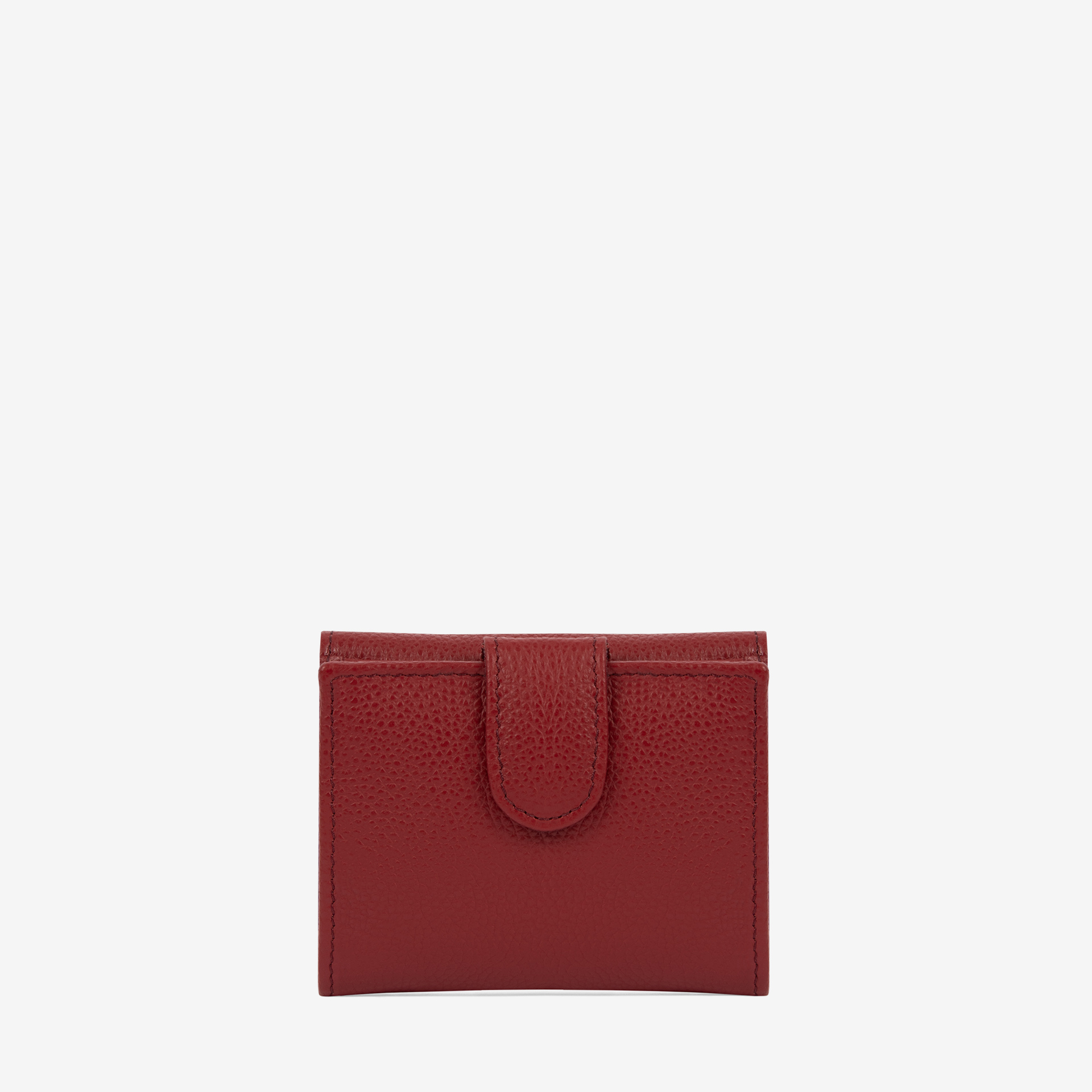 Carteira em pele genuína na cor bordô. Uma divisória com fecho de mola, capacidade para nove cartões, uma bolsa transparente e um compartimento para notas e, uma segunda divisória, livre, para moedas, também com fecho de mola.