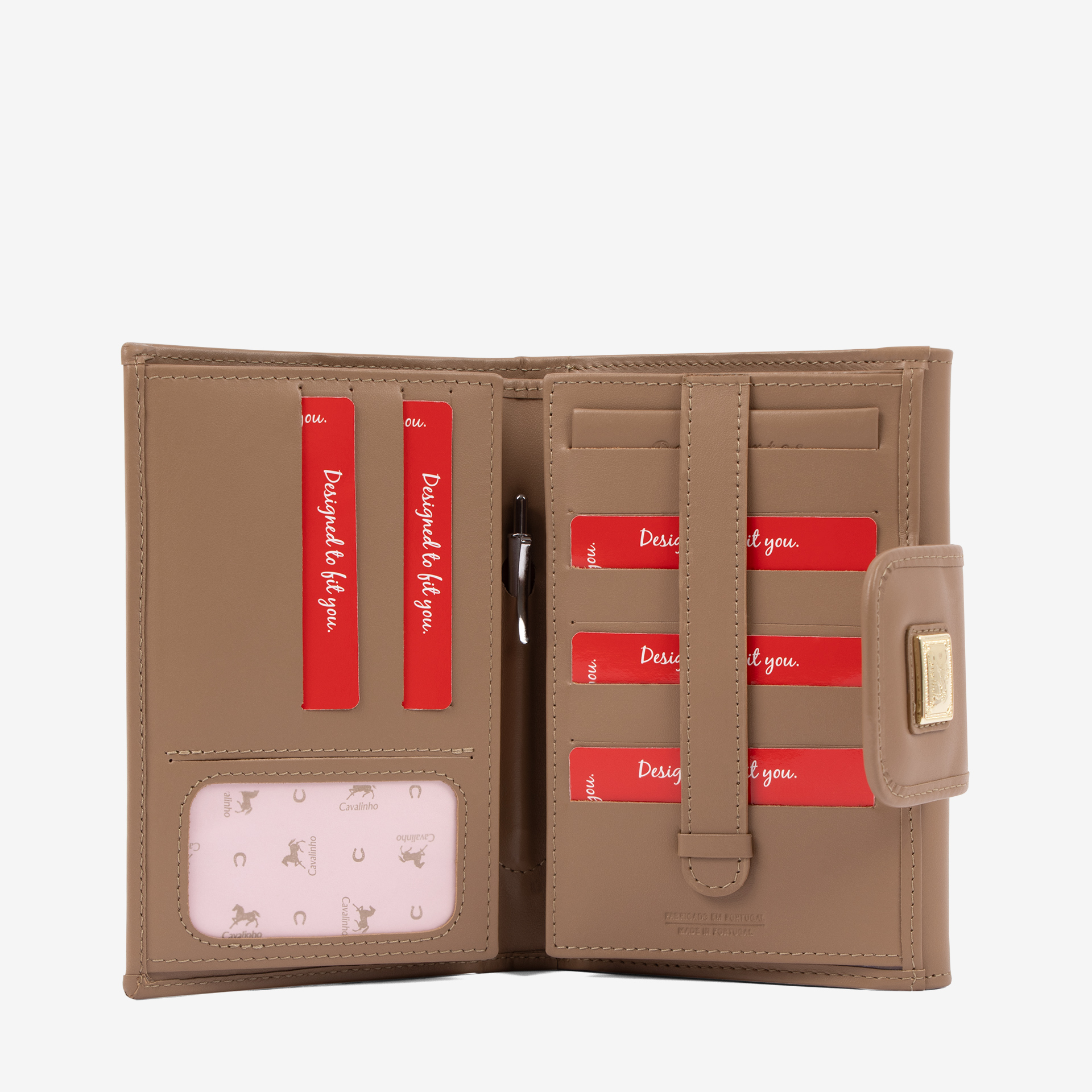 Carteira em tela castanha com detalhes em pele genuína na cor bege e duas divisórias: na frontal, uma compartimento para notas, quatro bolsas transparentes, uma divisão para caneta e capacidade para dezassete cartões e um passe para documentos; na traseira, três compartimentos, dois livres e um com fecho de correr para moedas. Pormenor branding em tecido na frente e aplicações douradas.