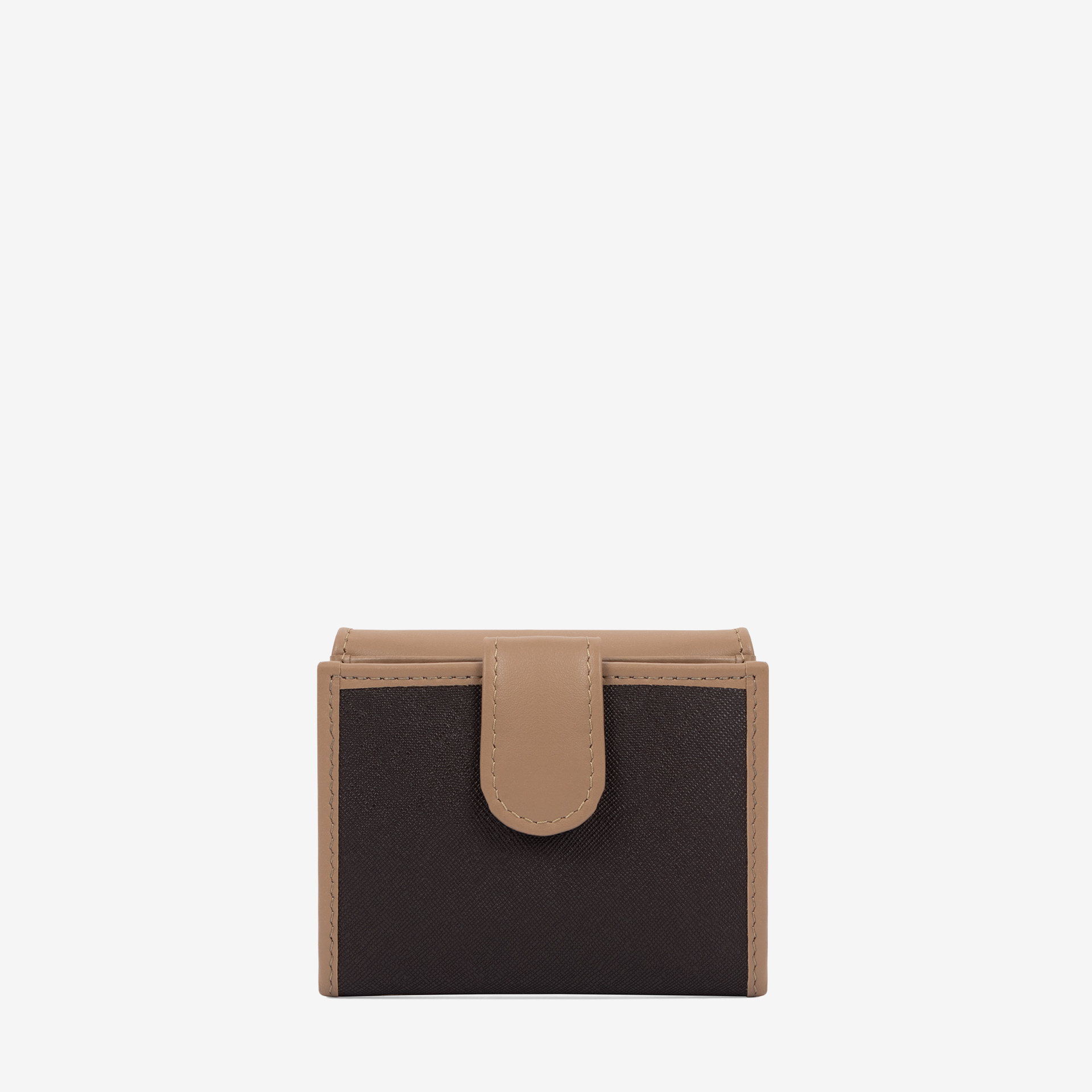 Carteira em tela castanha com detalhes em pele genuína na cor bege. Divisória com fecho de mola, capacidade para nove cartões, uma bolsa transparente e um compartimento para notas e, uma segunda divisória, livre, para moedas, também com fecho de mola. Aplicações douradas.