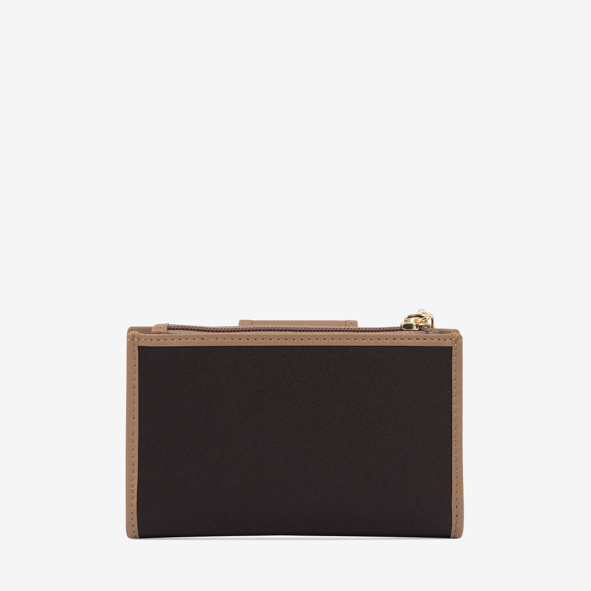 Carteira em tela castanha com detalhes em pele genuína na cor bege e duas divisórias: na frontal, um compartimento para notas, duas bolsas transparentes e capacidade para catorze cartões; na traseira, um compartimento para moedas com fecho de correr. Aplicações douradas.