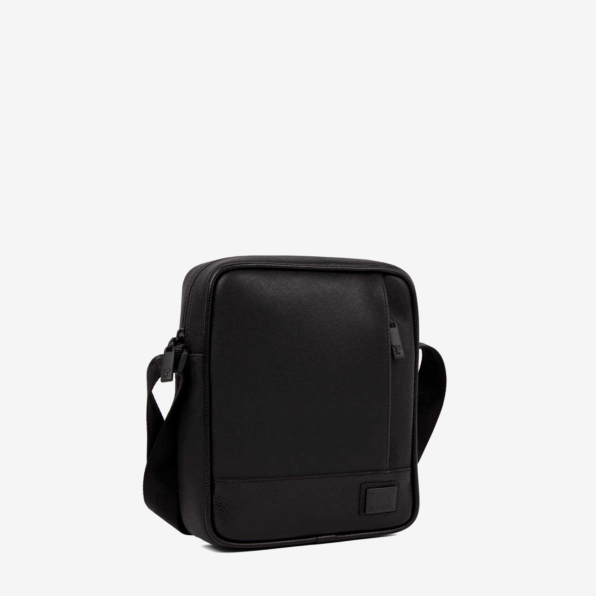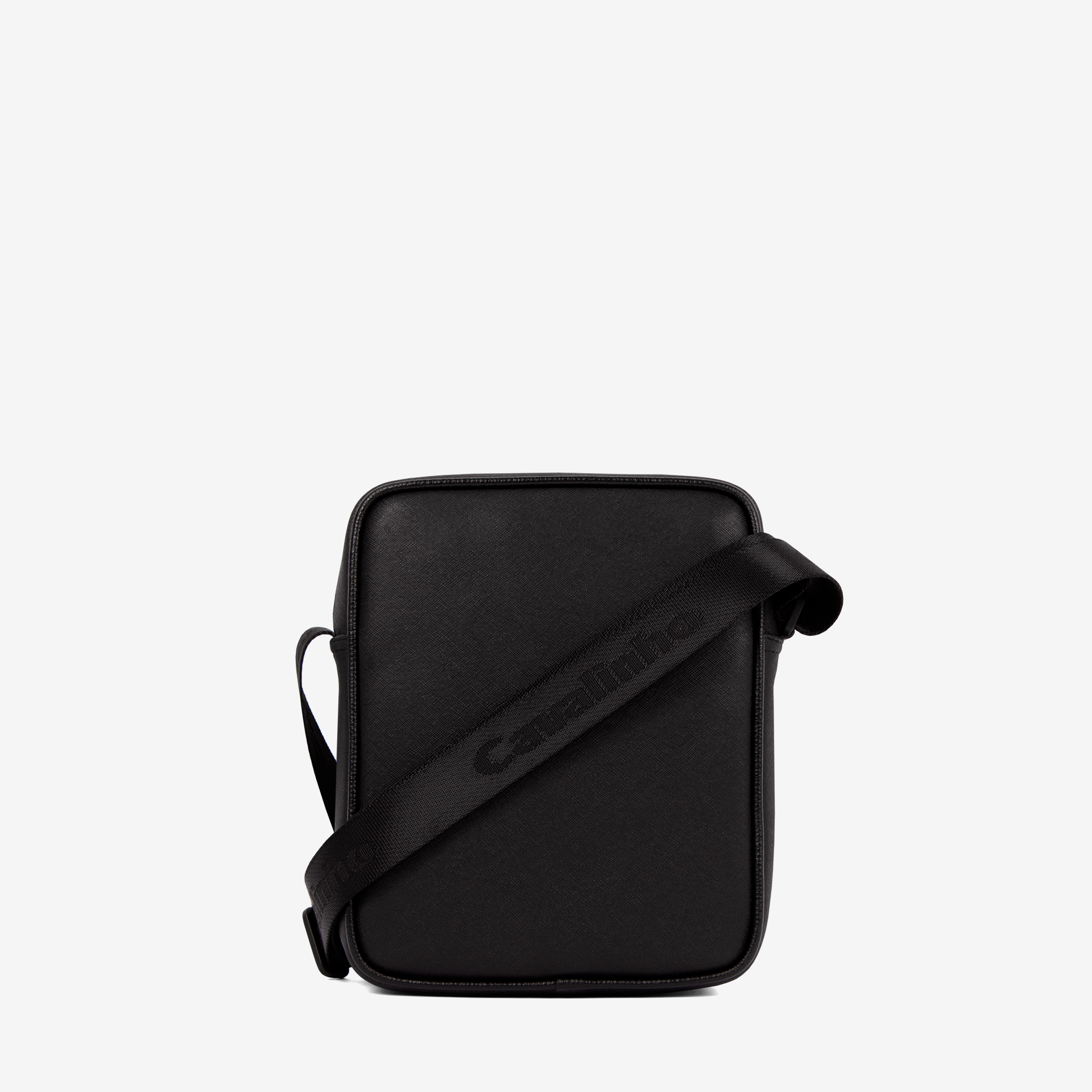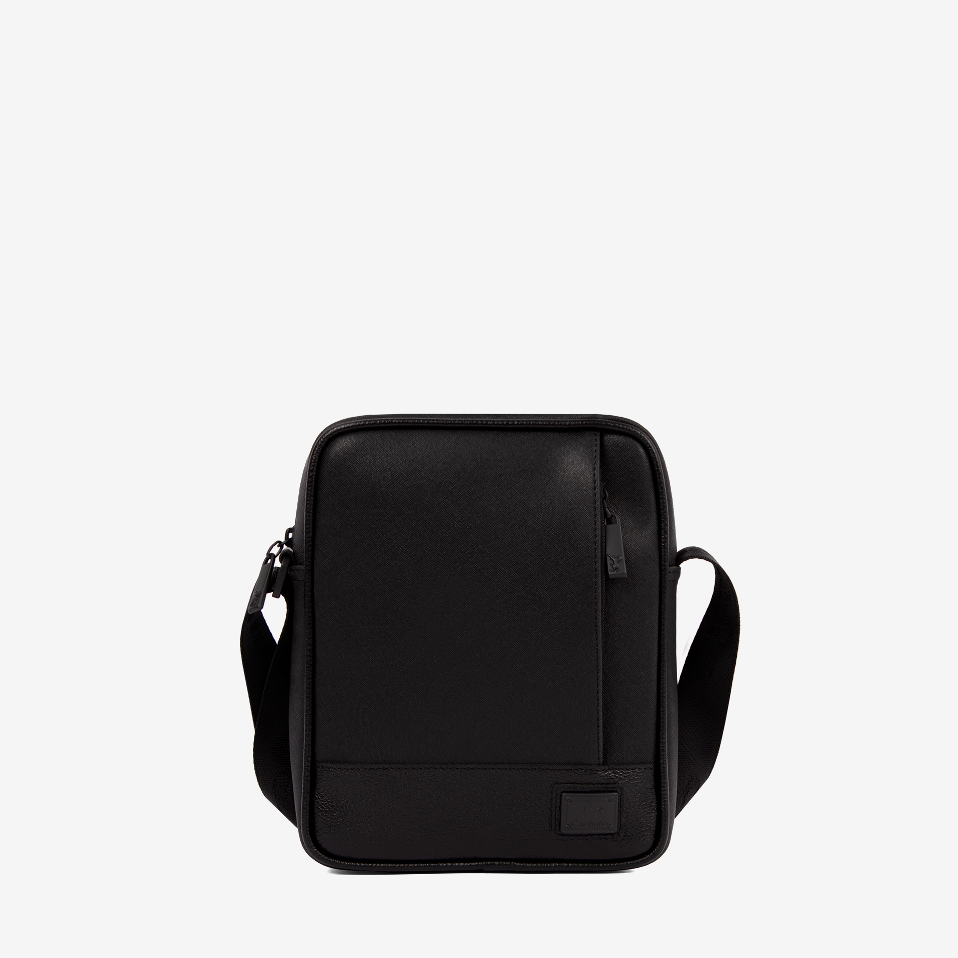 Bolsa de tiracolo em tela com detalhes em pele genuína. Divisória principal com forro em tecido e fecho de correr. Bolso pequeno na frente com fecho de correr vertical. Alça ajustável em tecido. Aplicações em preto.
