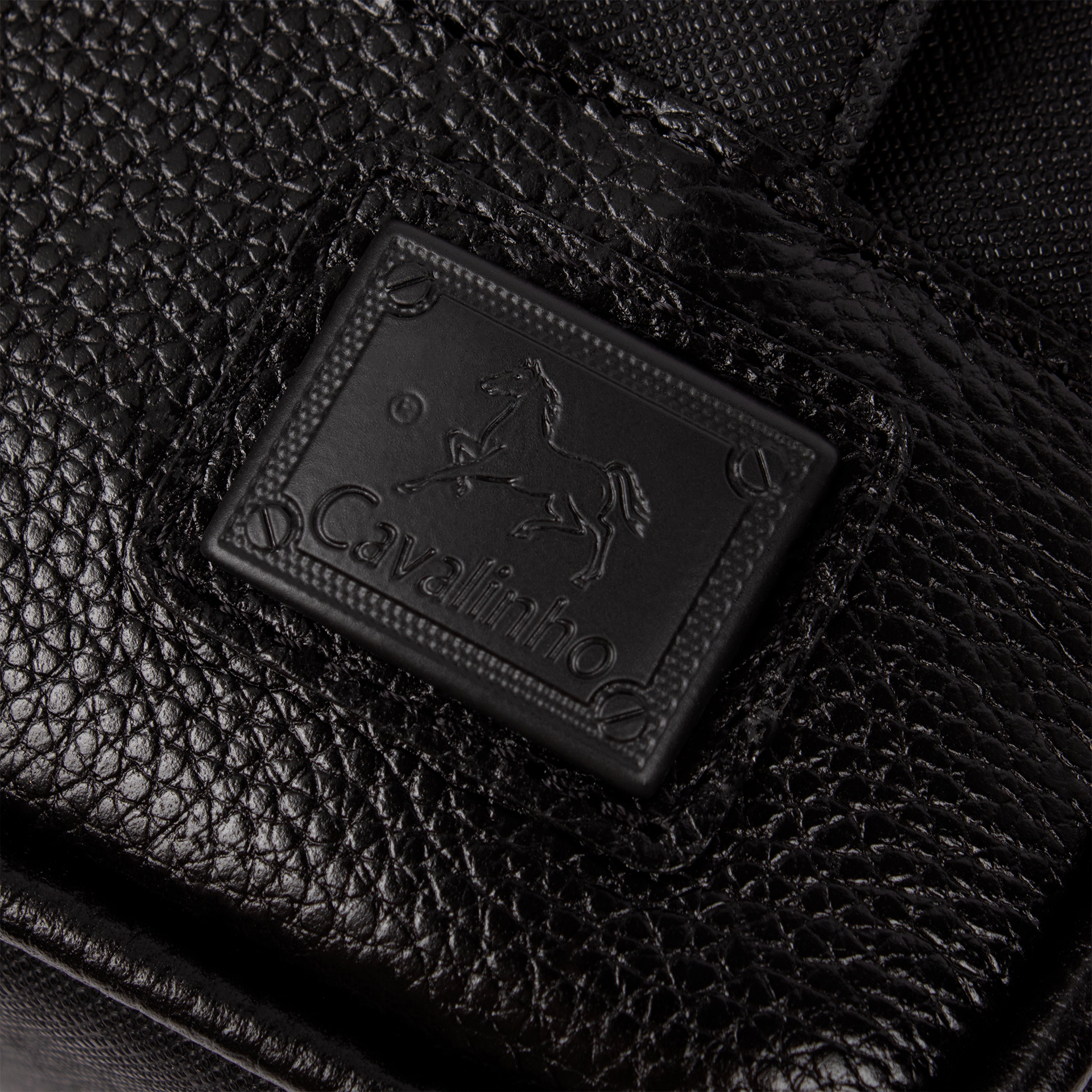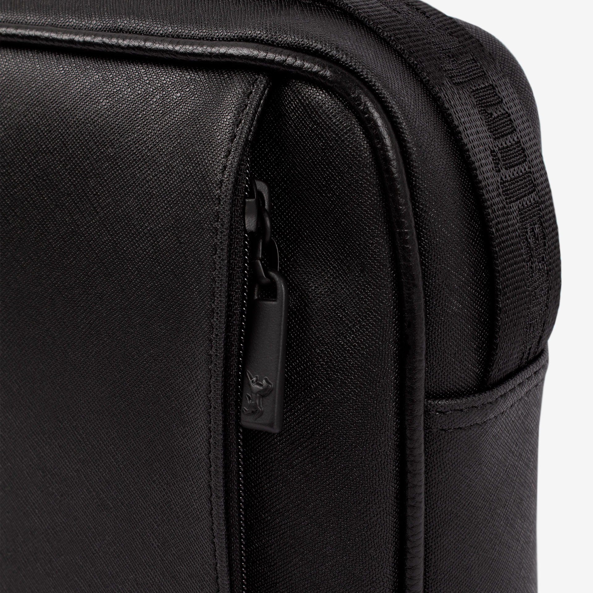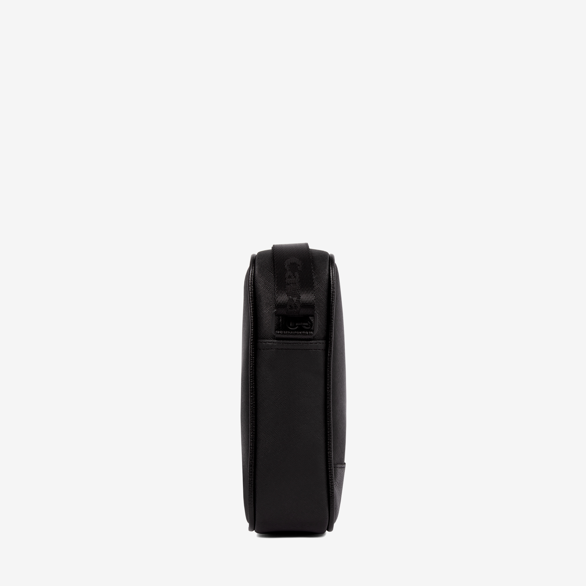 Bolsa de tiracolo em tela com detalhes em pele genuína. Divisória principal com forro em tecido e fecho de correr. Bolso pequeno na frente com fecho de correr vertical. Alça ajustável em tecido. Aplicações em preto.