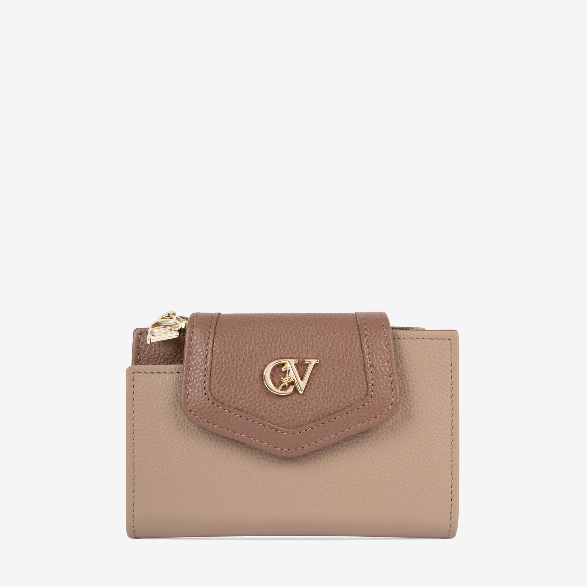Carteira em pele genuina multi-bege com duas divisórias: na frontal, um compartimento para notas, duas bolsas transparentes e capacidade para catorze cartões; na traseira, um compartimento para moedas com fecho de correr. Pormenor branding no tecido. Aplicação dourada CV.