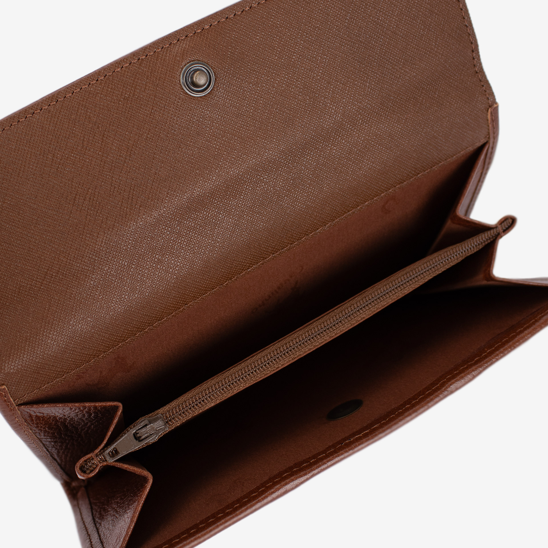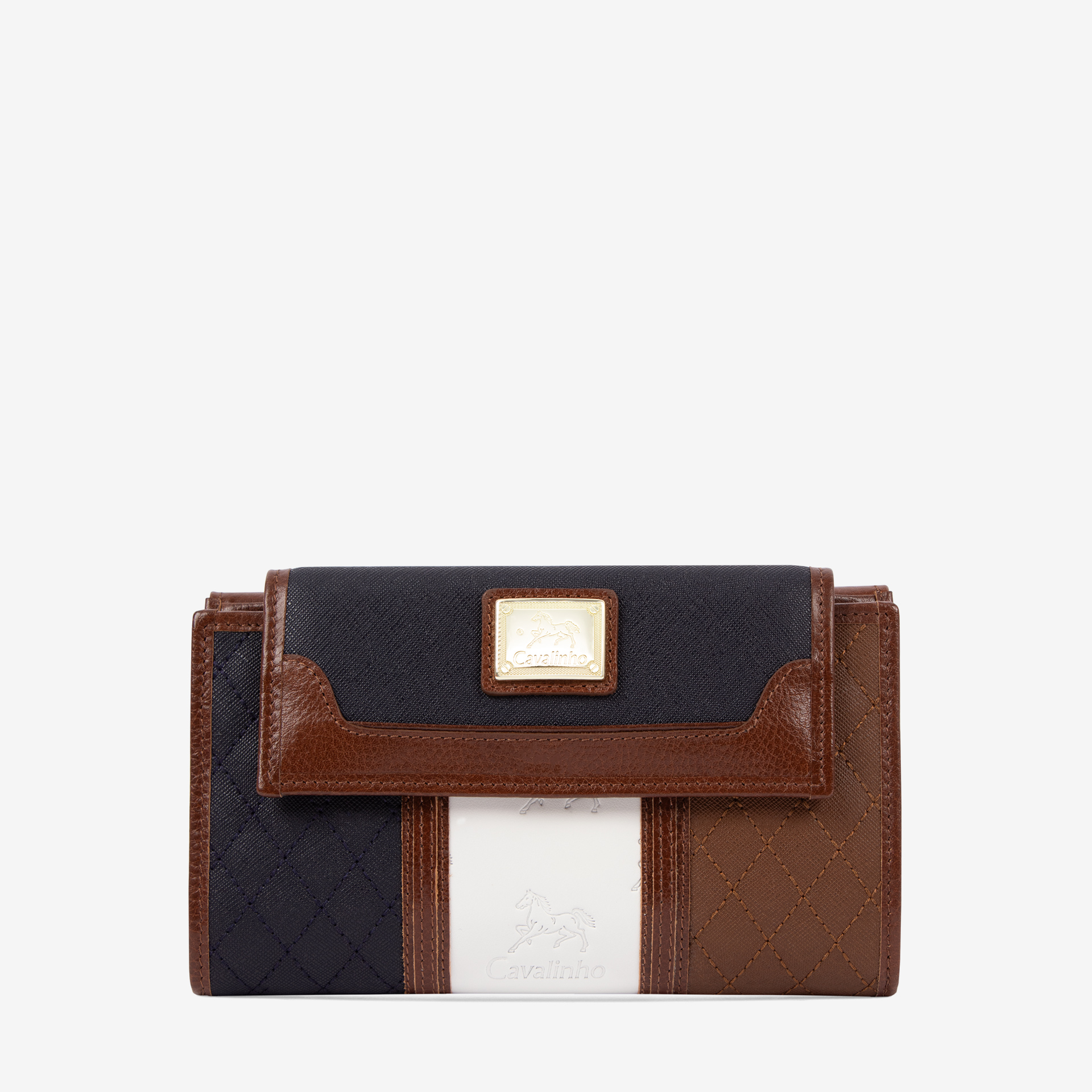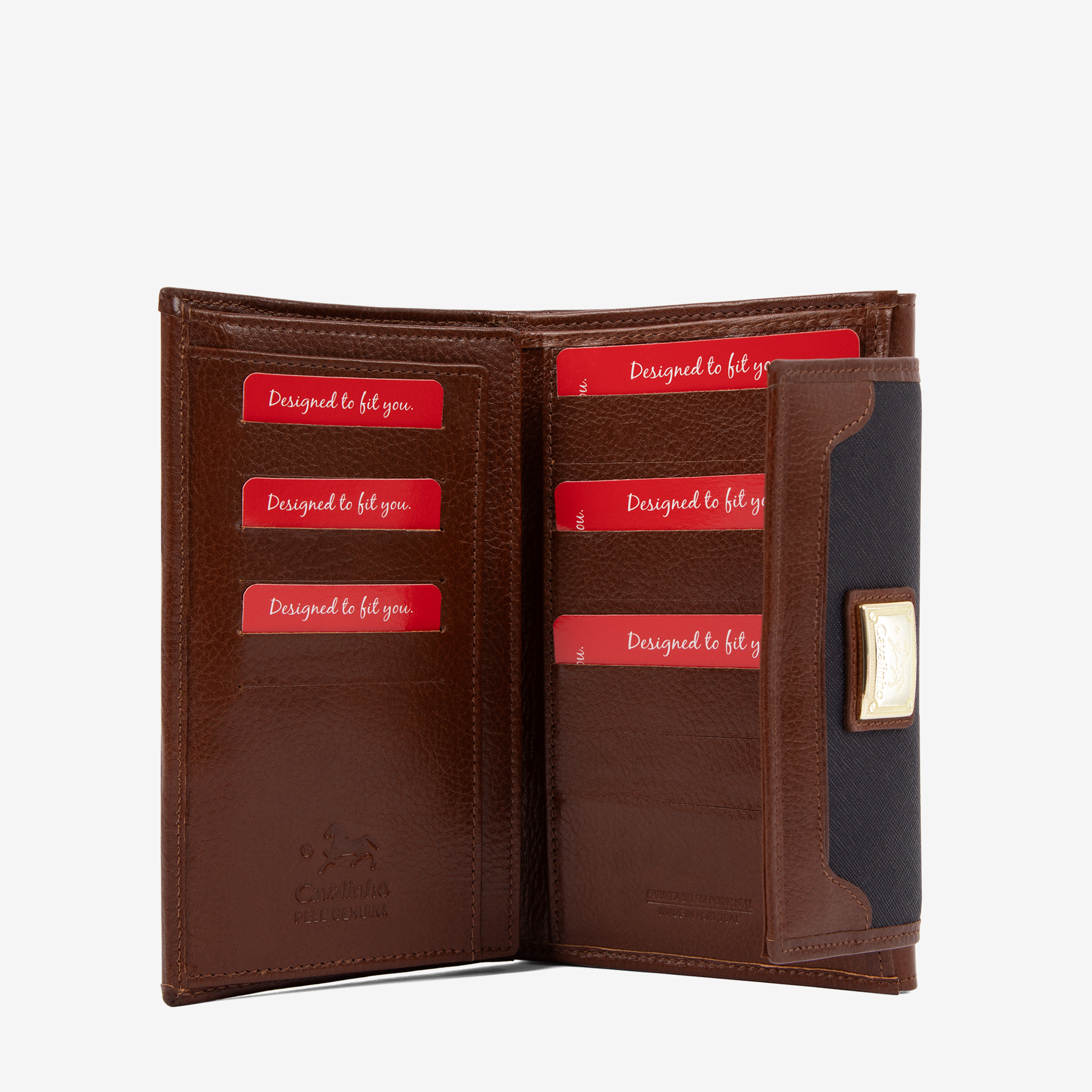 Carteira em tela padronizada à mão com detalhes em pele genuína. Duas divisórias: na frontal, um compartimento notas, um para caneta e capacidade para dezassete cartões; na traseira, dois compartimentos livres e um compartimento para moedas com fecho de correr. Aplicações douradas.