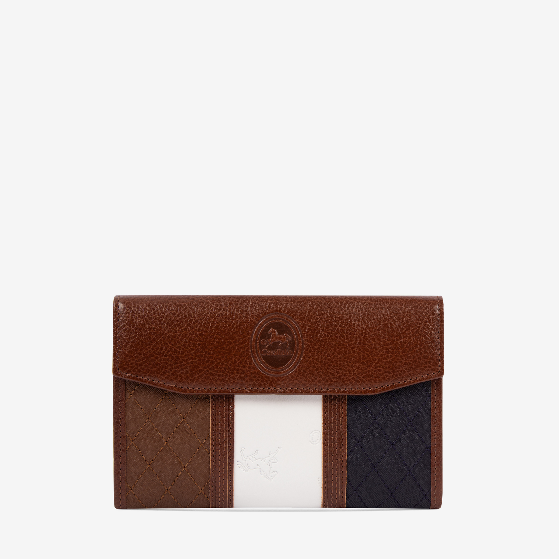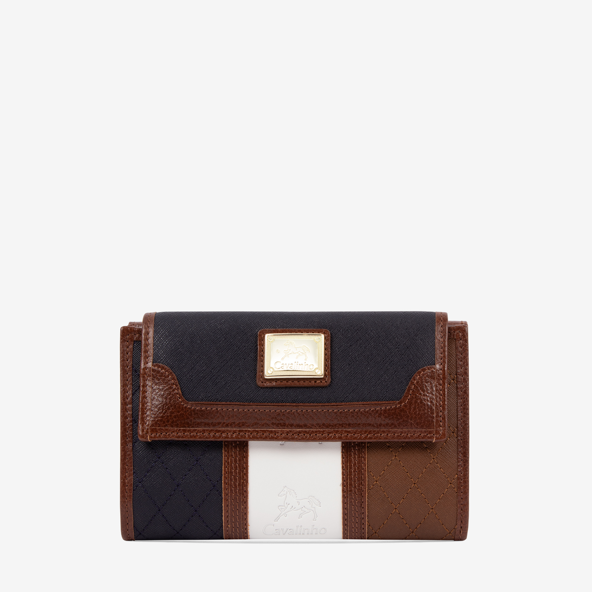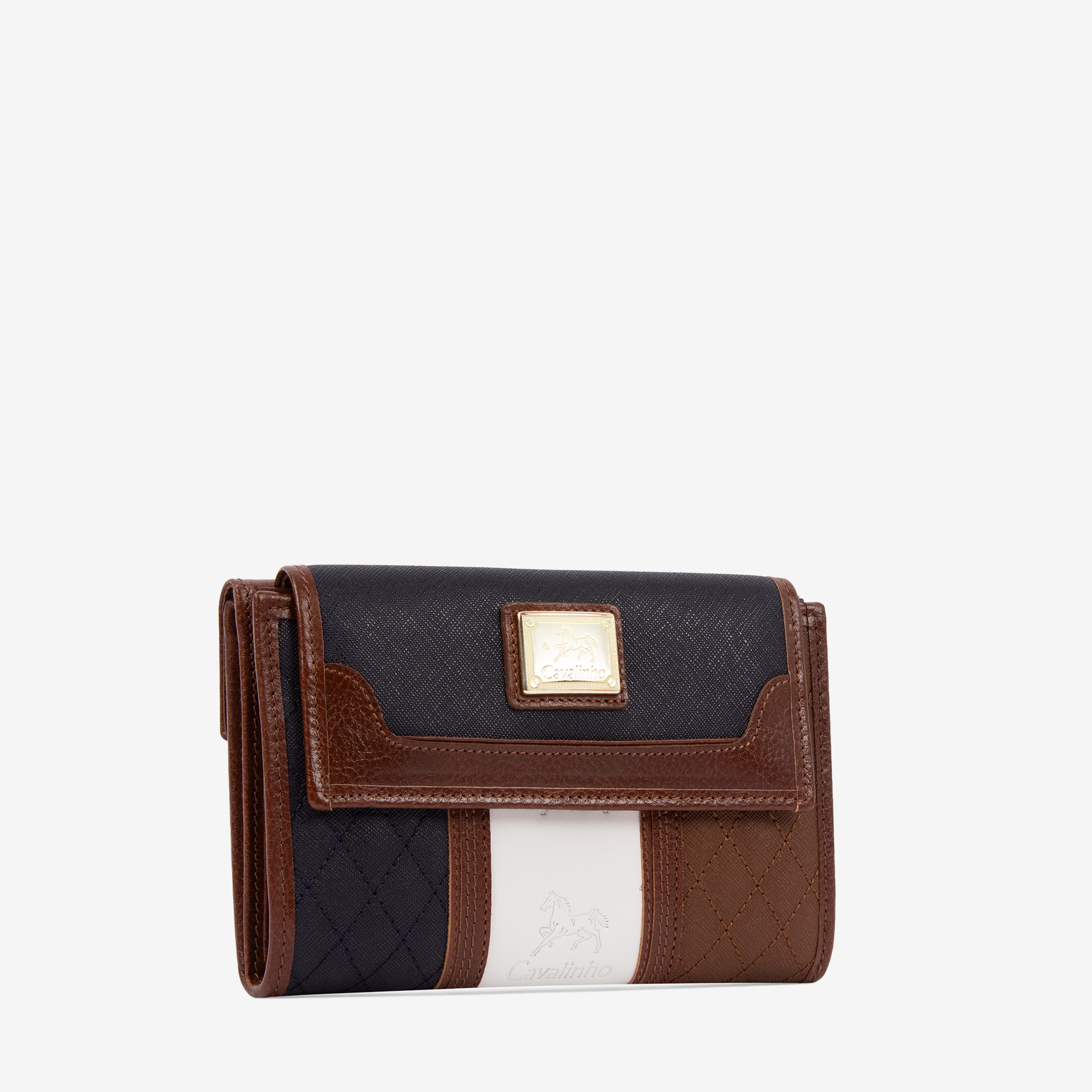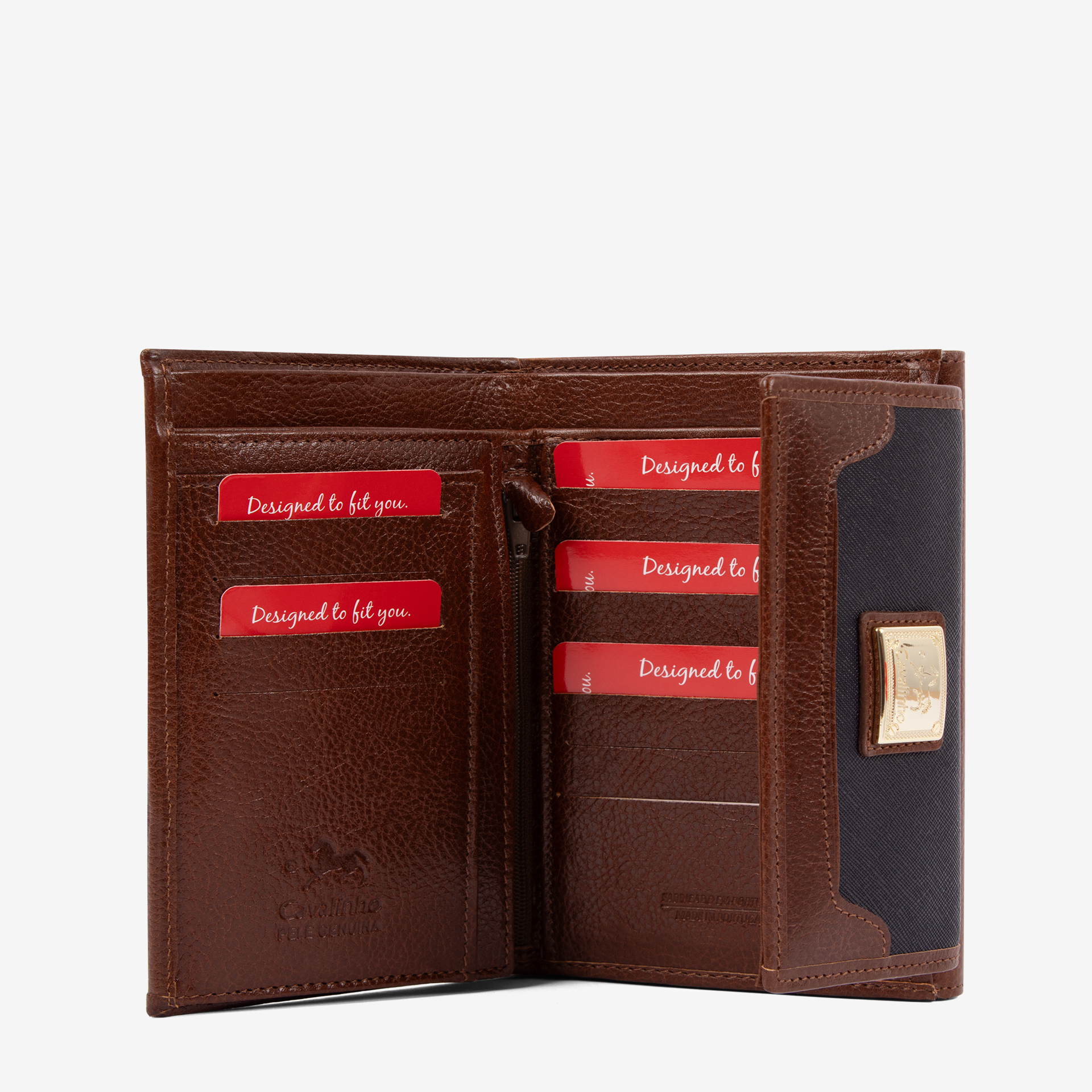 Carteira em tela padronizada à mão com detalhes em pele genuína. Duas divisórias: na frontal, dois compartimentos para notas, um para documentos, duas bolsas transparentes, uma divisão com fecho de correr e capacidade para dez cartões; na traseira, dois compartimentos livres e um com fecho de correr para moedas. Aplicações douradas.