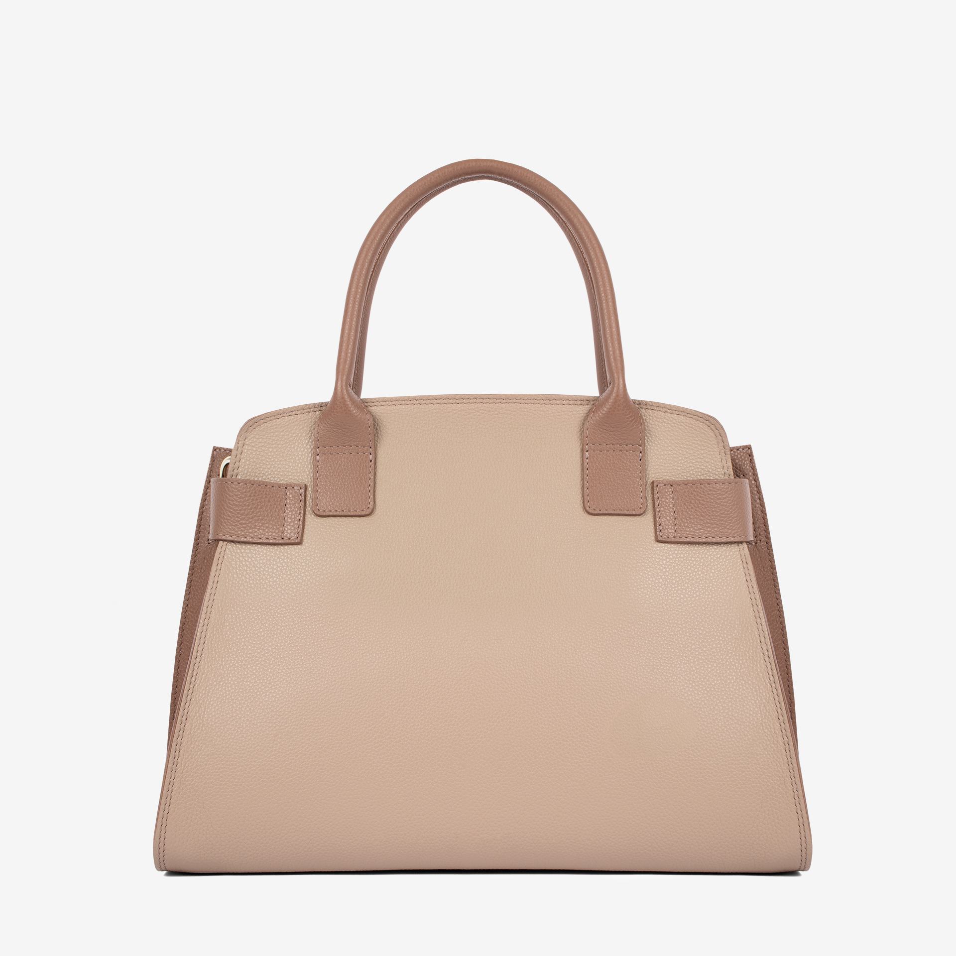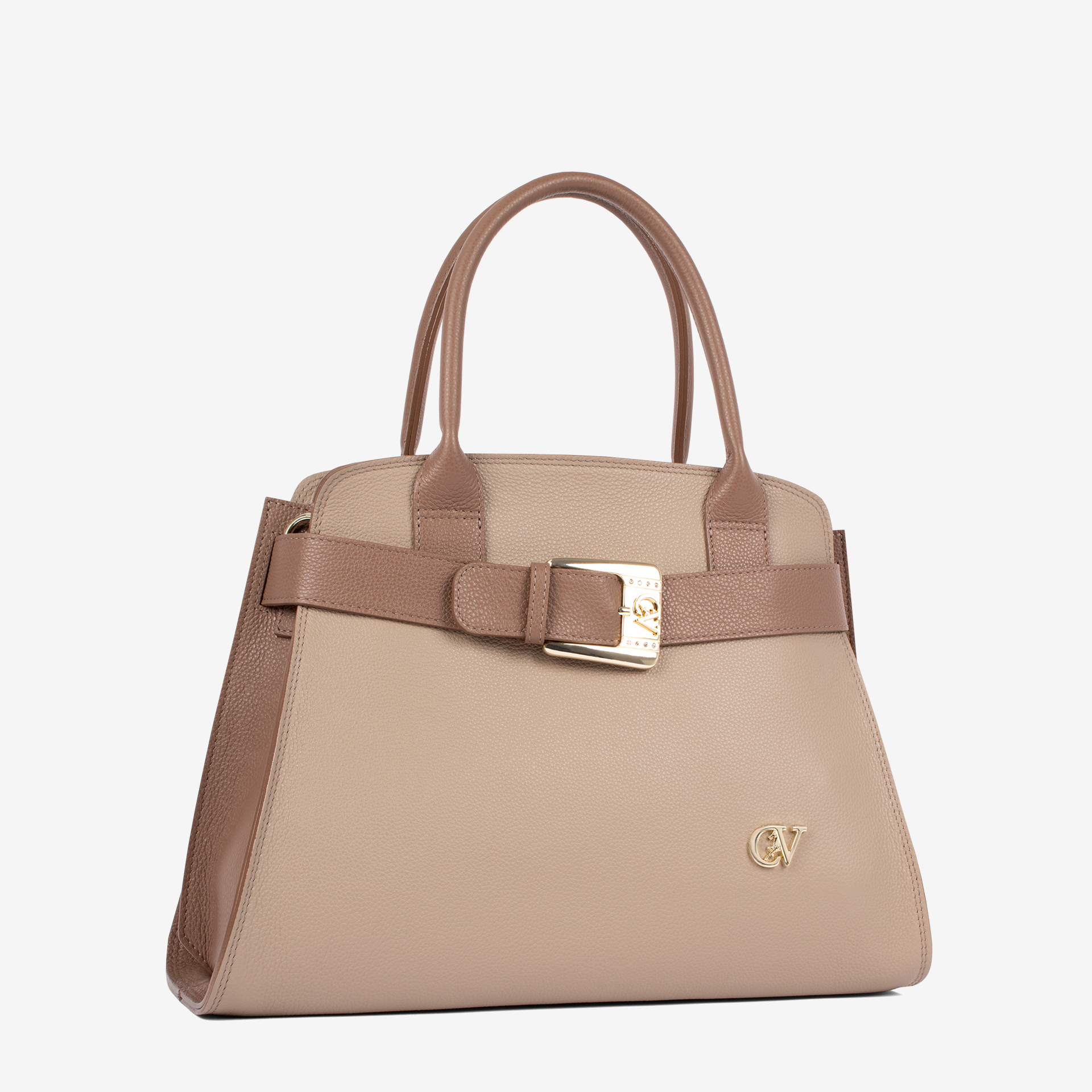 Mala de mão, na cor areia e bege, com uma divisória e fecho de correr. Forro em pele. Asa dupla de mão e alça de tiracolo, ajustável e removível, ambas em pele genuína. Detalhe de cinto com fivela dourada.