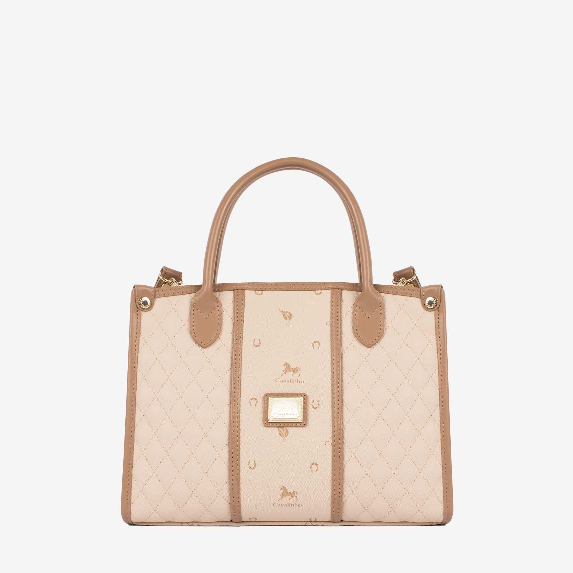 Mala de mão em tela com padrão losangular na cor bege. Divisória principal com fecho de correr, forro em tecido e dois bolsos pequenos. Asa dupla de mão e alça tiracolo, ajustável e removível, ambas em pele genuína na cor bege. Aplicações douradas.