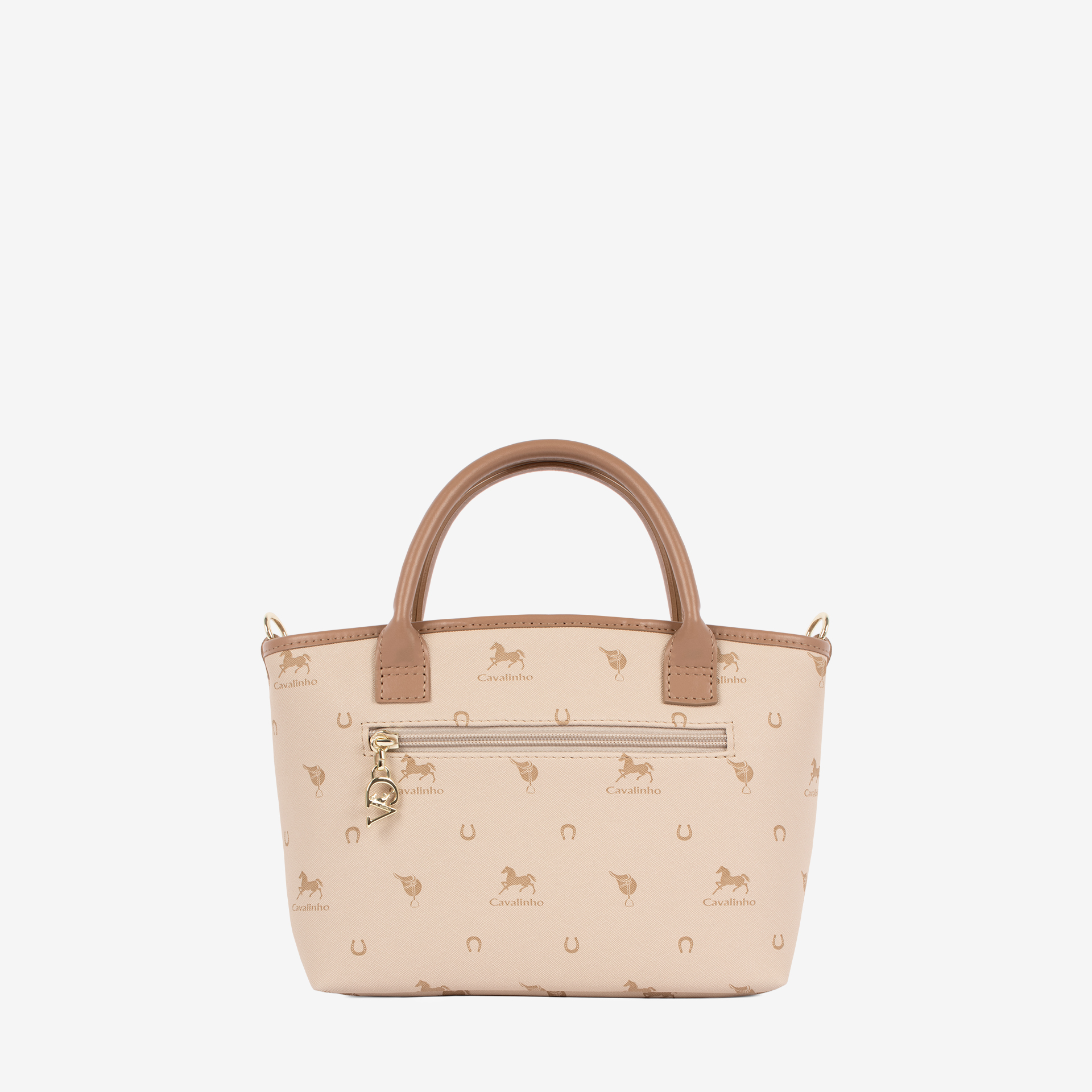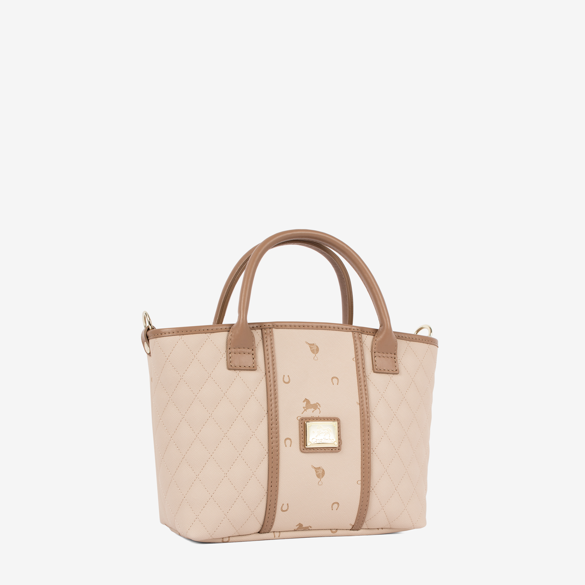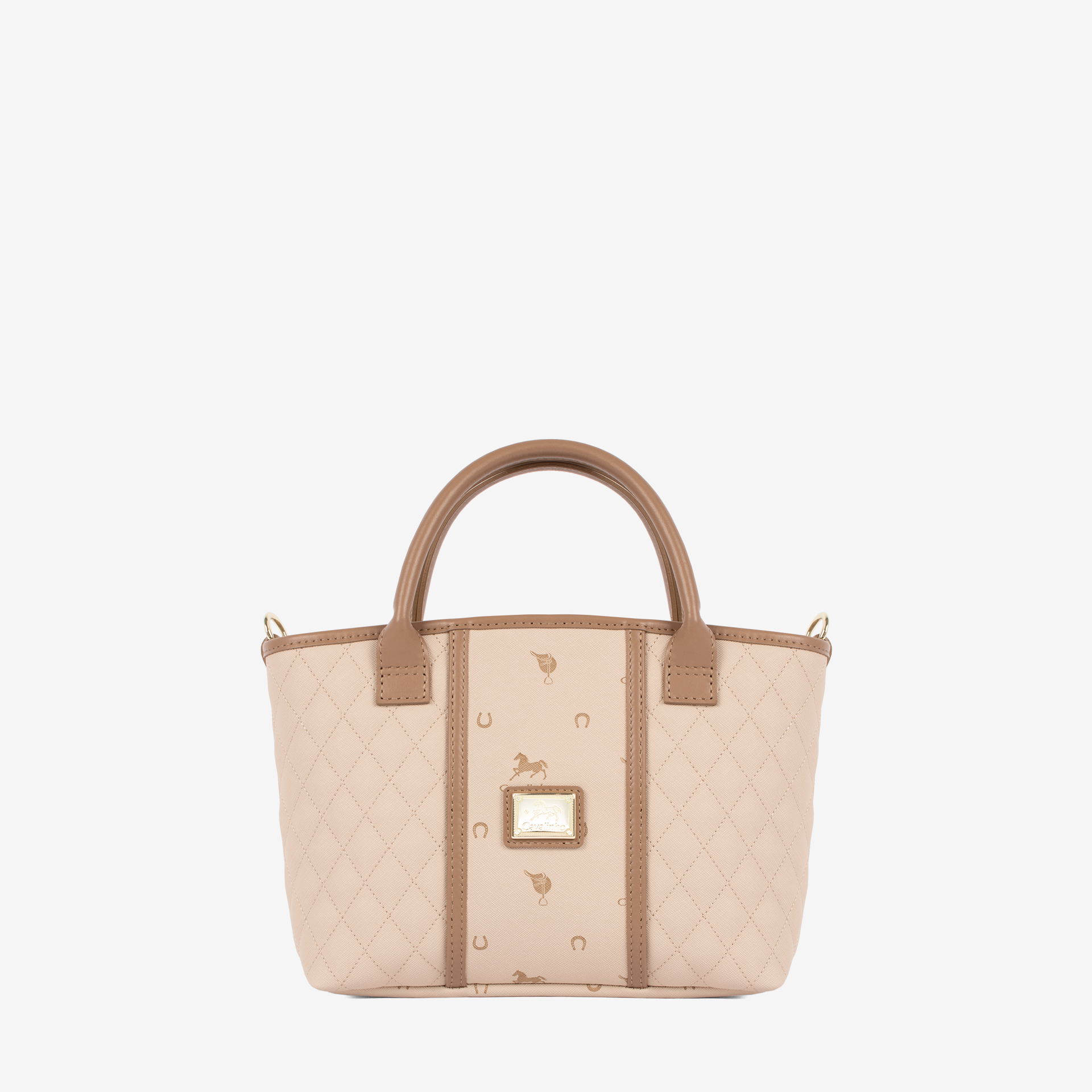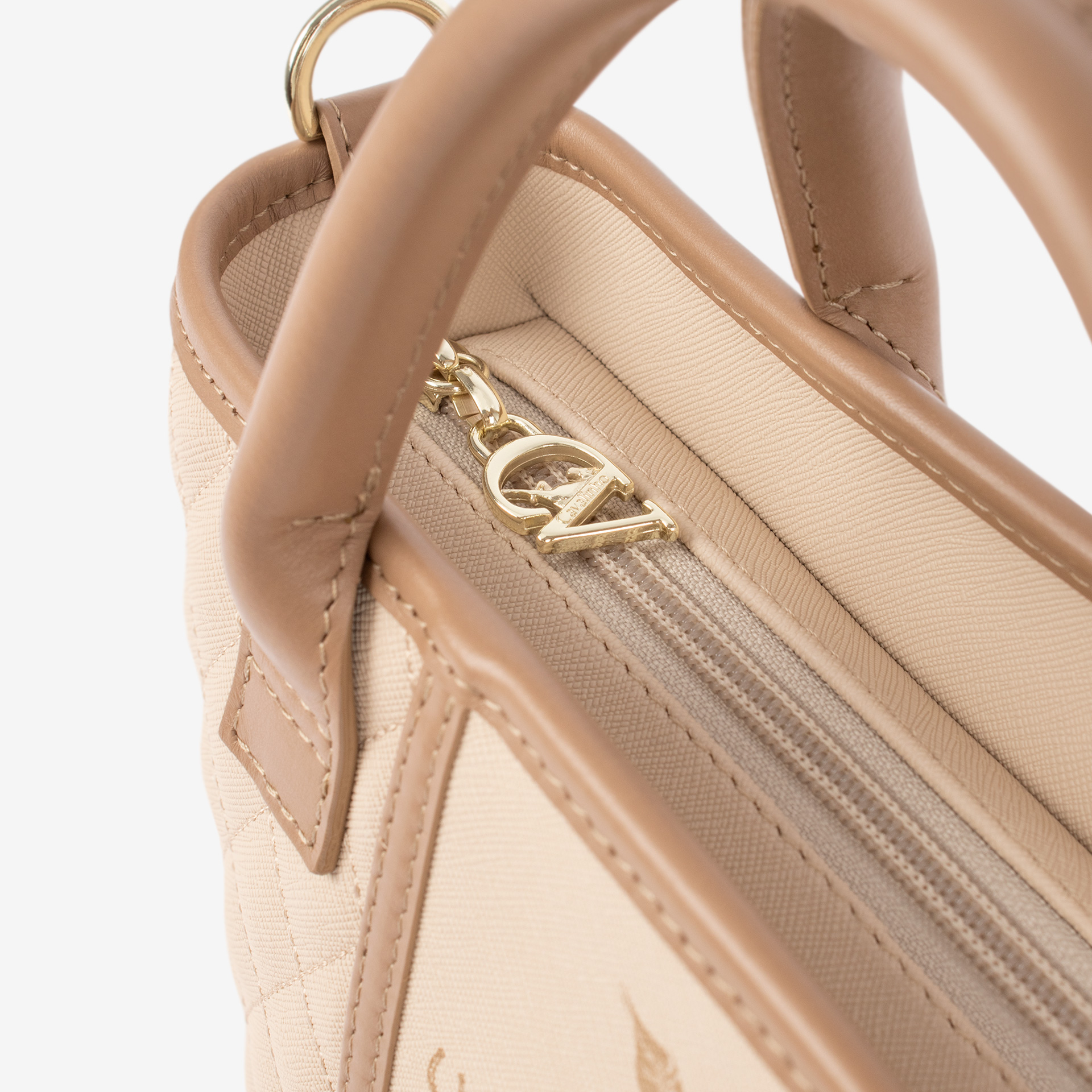 Mala média em tela com padrão losangular na cor bege. Divisória principal com forro em tecido, dois bolsos interiores pequenos e fecho de correr. Bolso com fecho de correr na parte da trás da mala. Asa dupla de mão e alça de tiracolo ajustável e removível, ambas em pele bege. Aplicações douradas.