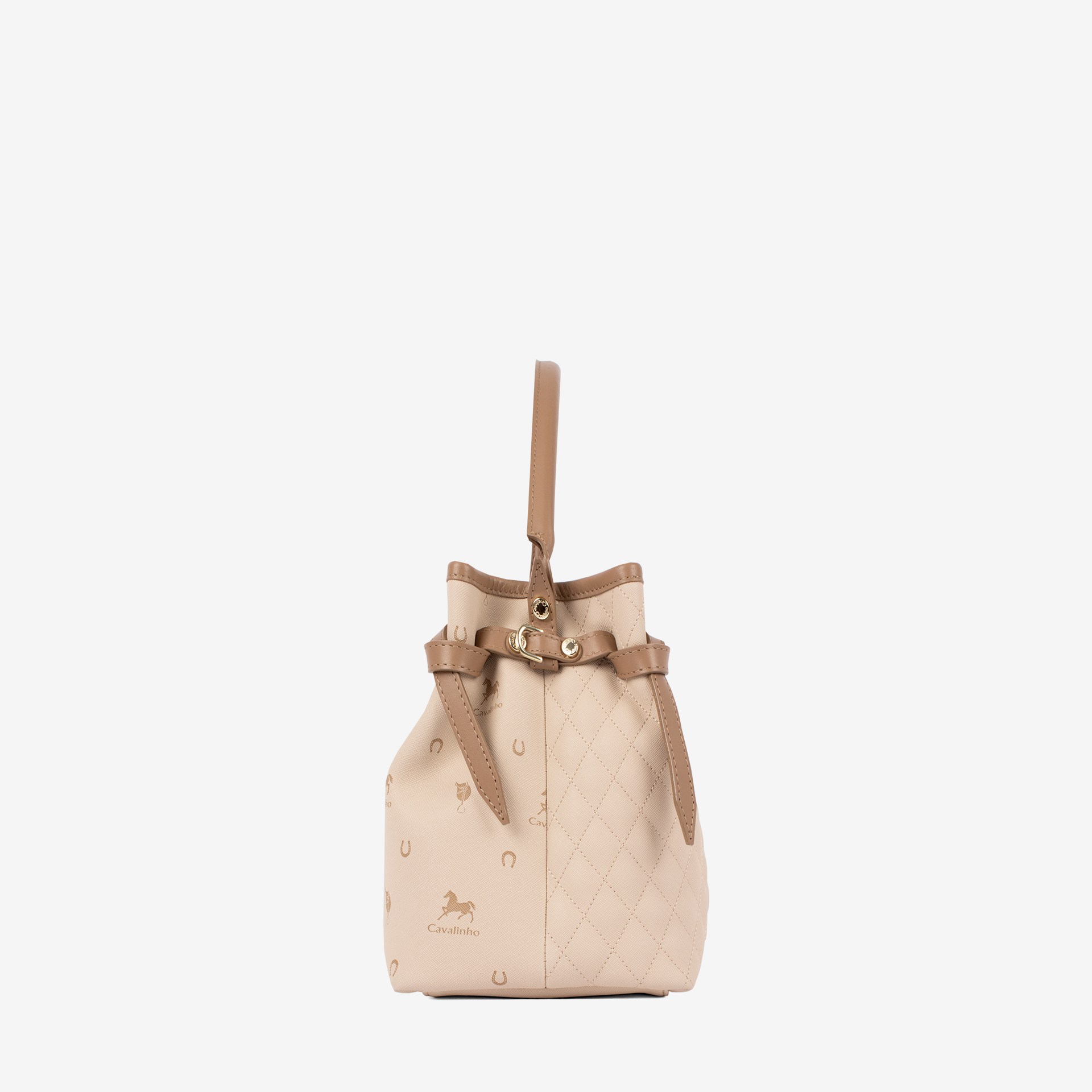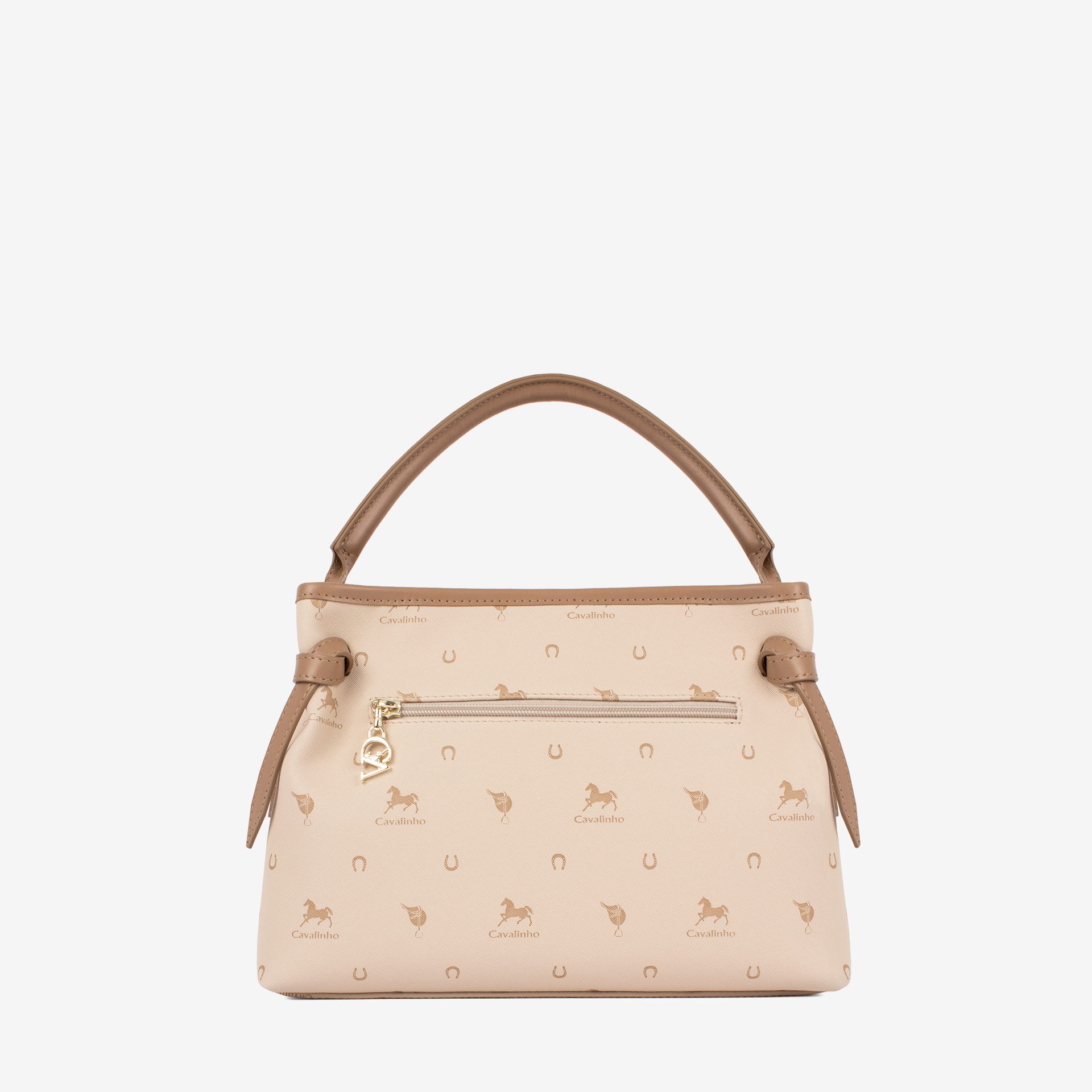Mala de mão em tela com padrão losangular na cor bege. Divisória com forro em tecido, dois bolsos interiores e fecho de correr. Bolso com fecho de correr na parte de trás da mala. Asa mão em pele genuína na cor bege. Aplicações douradas.