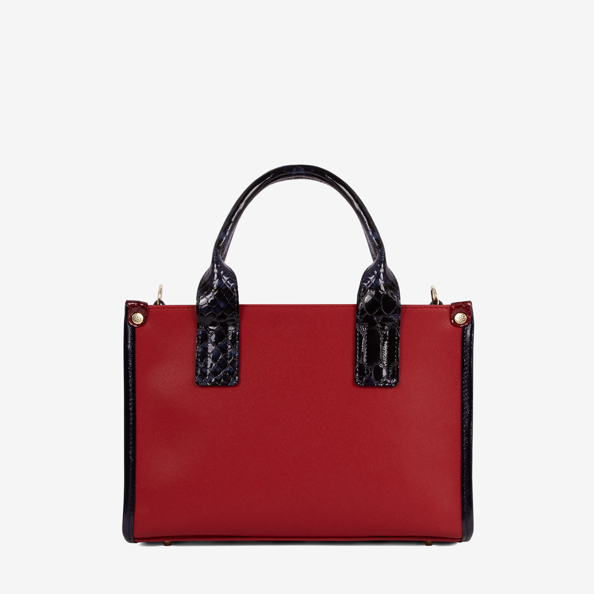 Mala de mão média numa mistura de pele envernizada e genuína, na cor azul, vermelho e bege. Divisória principal com fecho de correr, forro em tecido e dois bolsos pequenos. Asa dupla de mão e alça de tiracolo, amovível e ajustável - ambas na cor de azul. Aplicações douradas.