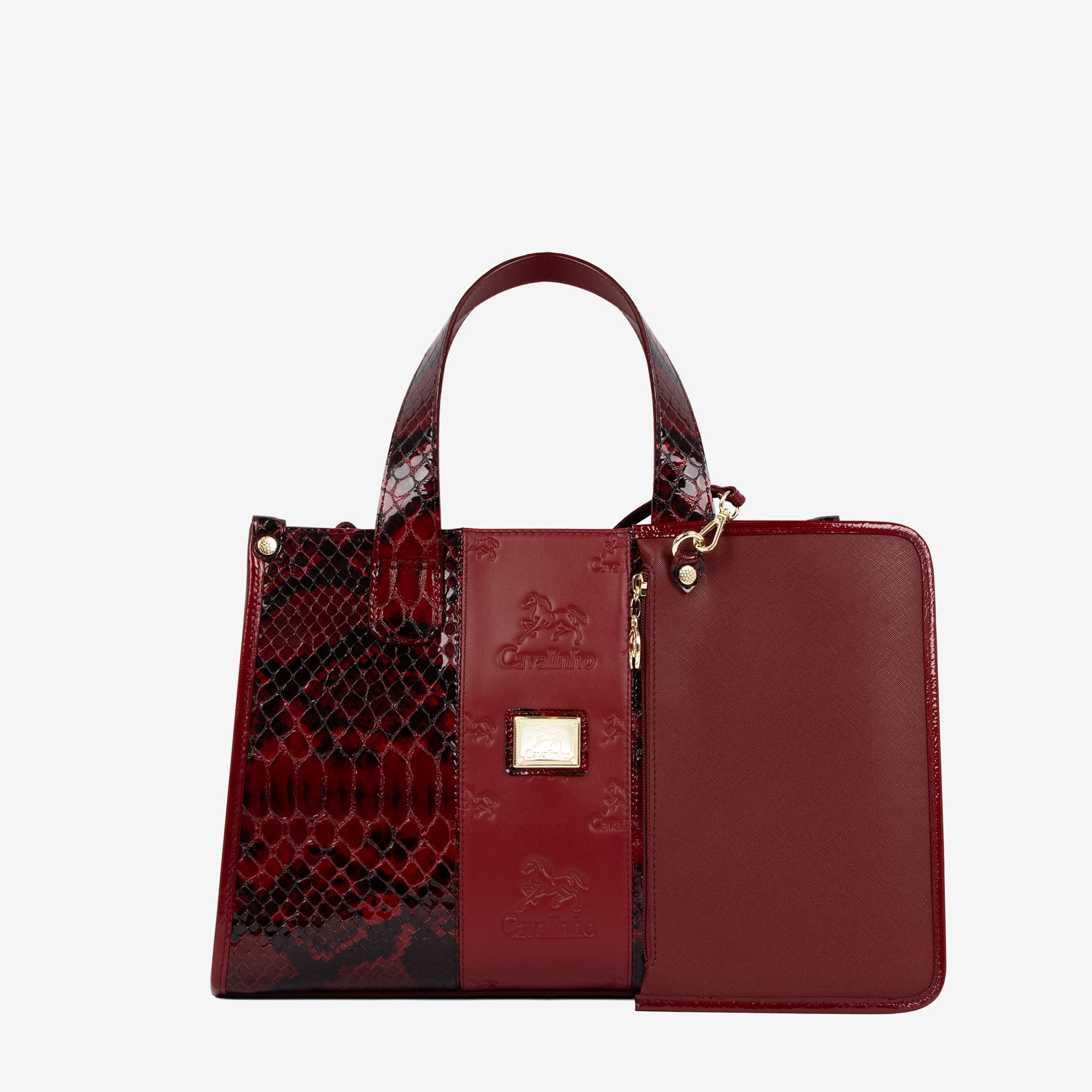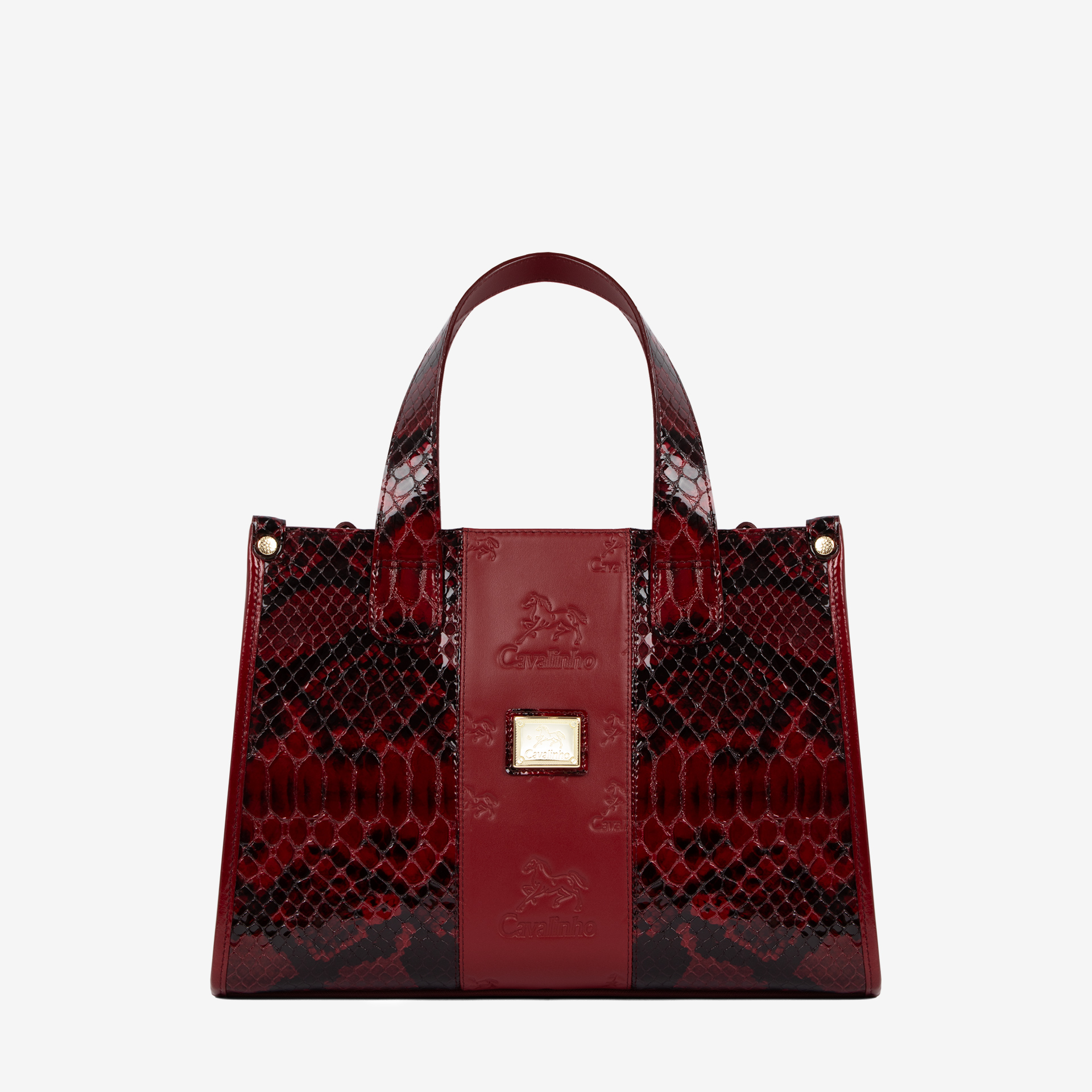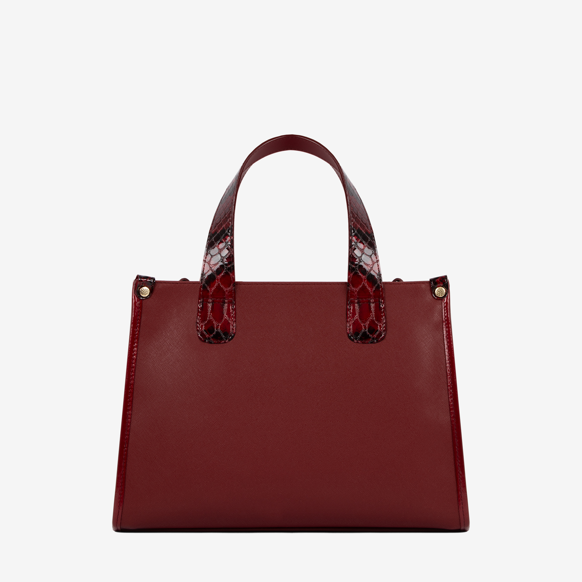 Mala de mão grande numa mistura de pele envernizada e genuína, na cor bordô. Divisória principal com forro em tecido, dois bolsos pequenos no interior e fecho de correr. Asa de mão larga dupla e alça de tiracolo removível. Idealmente utilizada na mão. Aplicações douradas.