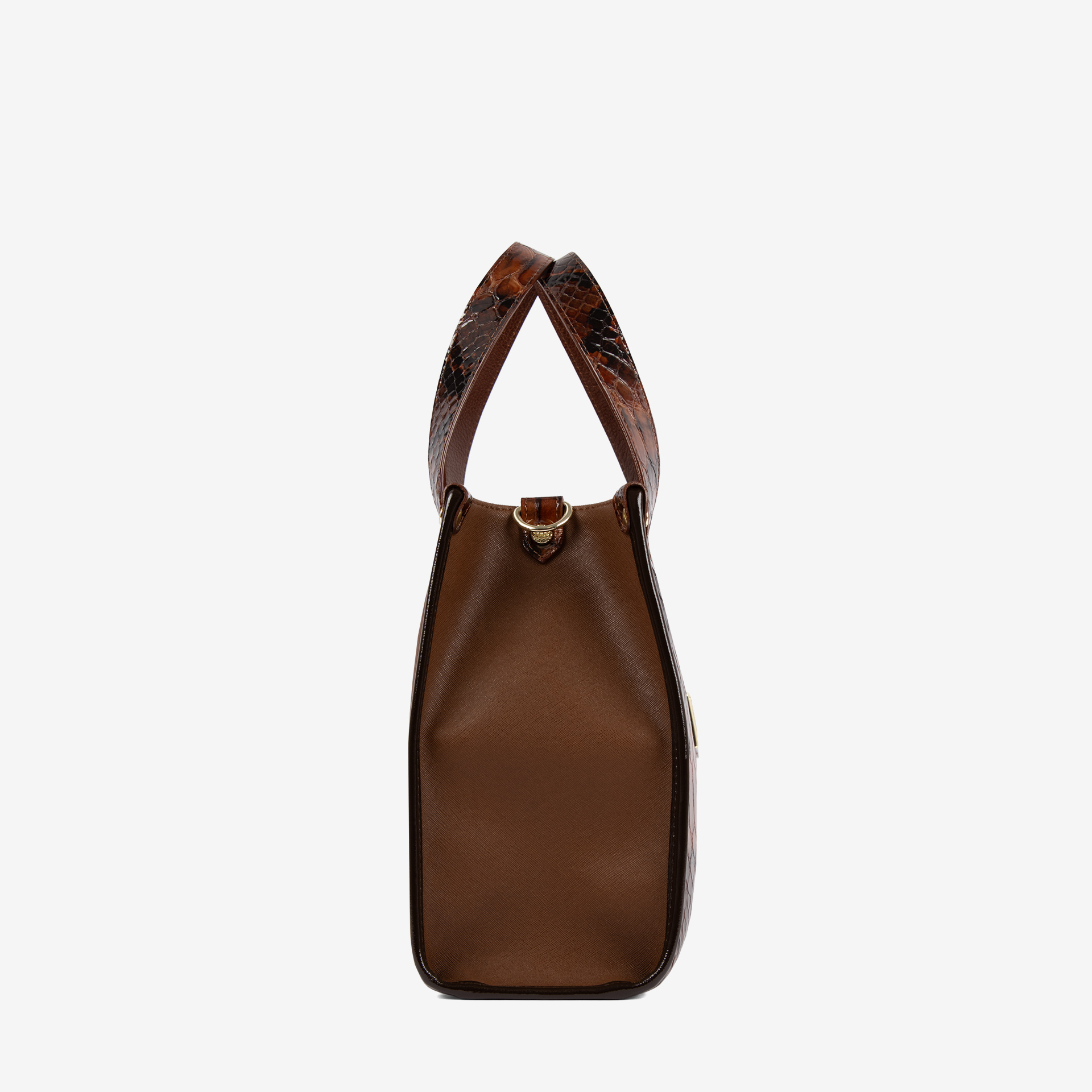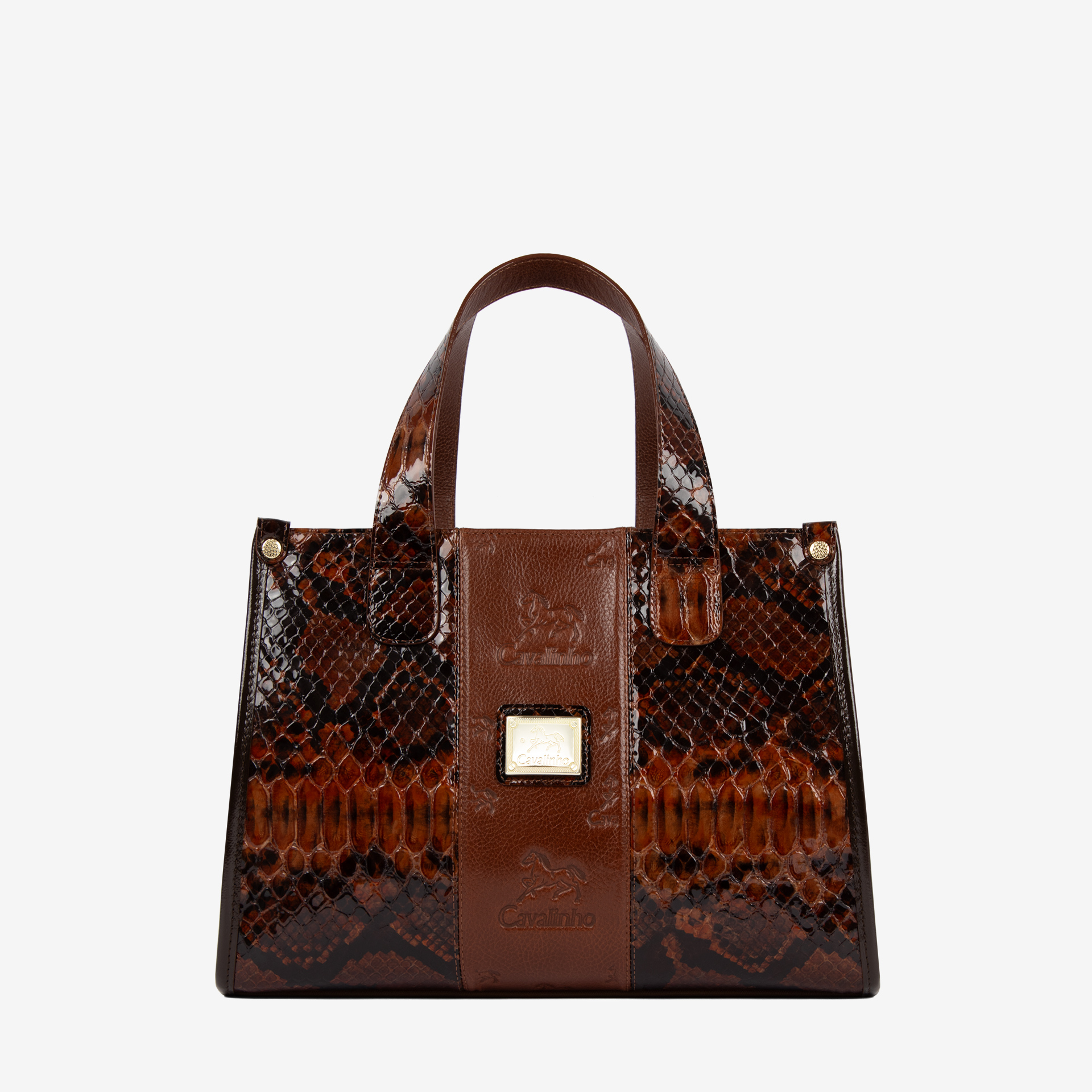Mala de mão grande numa mistura de pele envernizada e genuína, na cor camel. Divisória principal com forro em tecido, dois bolsos pequenos no interior e fecho de correr. Asa de mão larga dupla e alça de tiracolo removível. Idealmente utilizada na mão. Aplicações douradas.