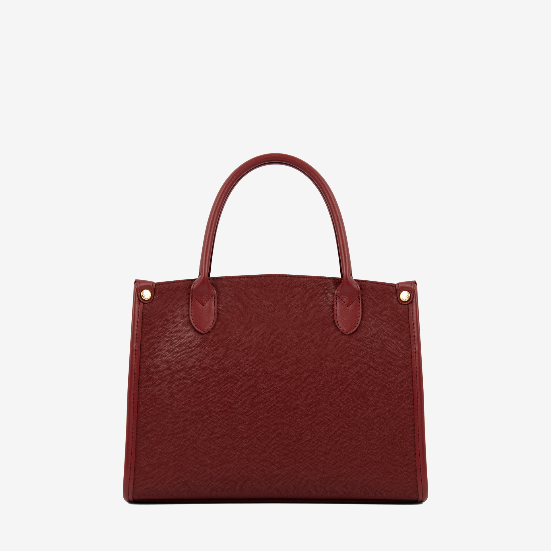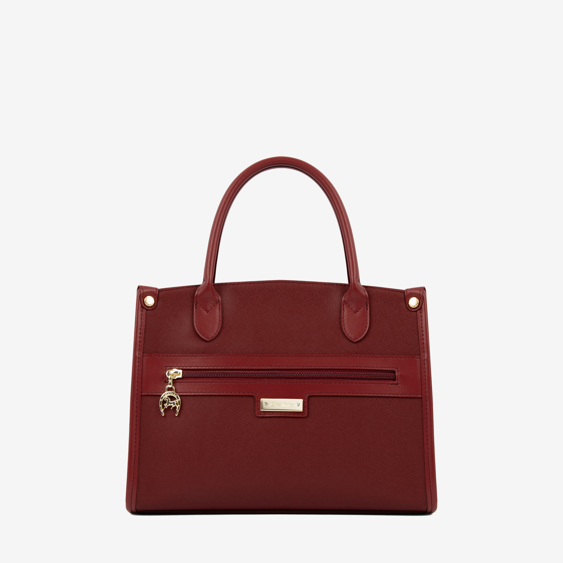Mala média em tela bordô. Asa dupla de mão e alça de tiracolo ajustável e removível. Divisória principal com forro em tecido, dois bolsos pequenos e fecho de correr. Bolso exterior pequeno com fecho de correr na parte da frente da mala. Aplicações douradas.