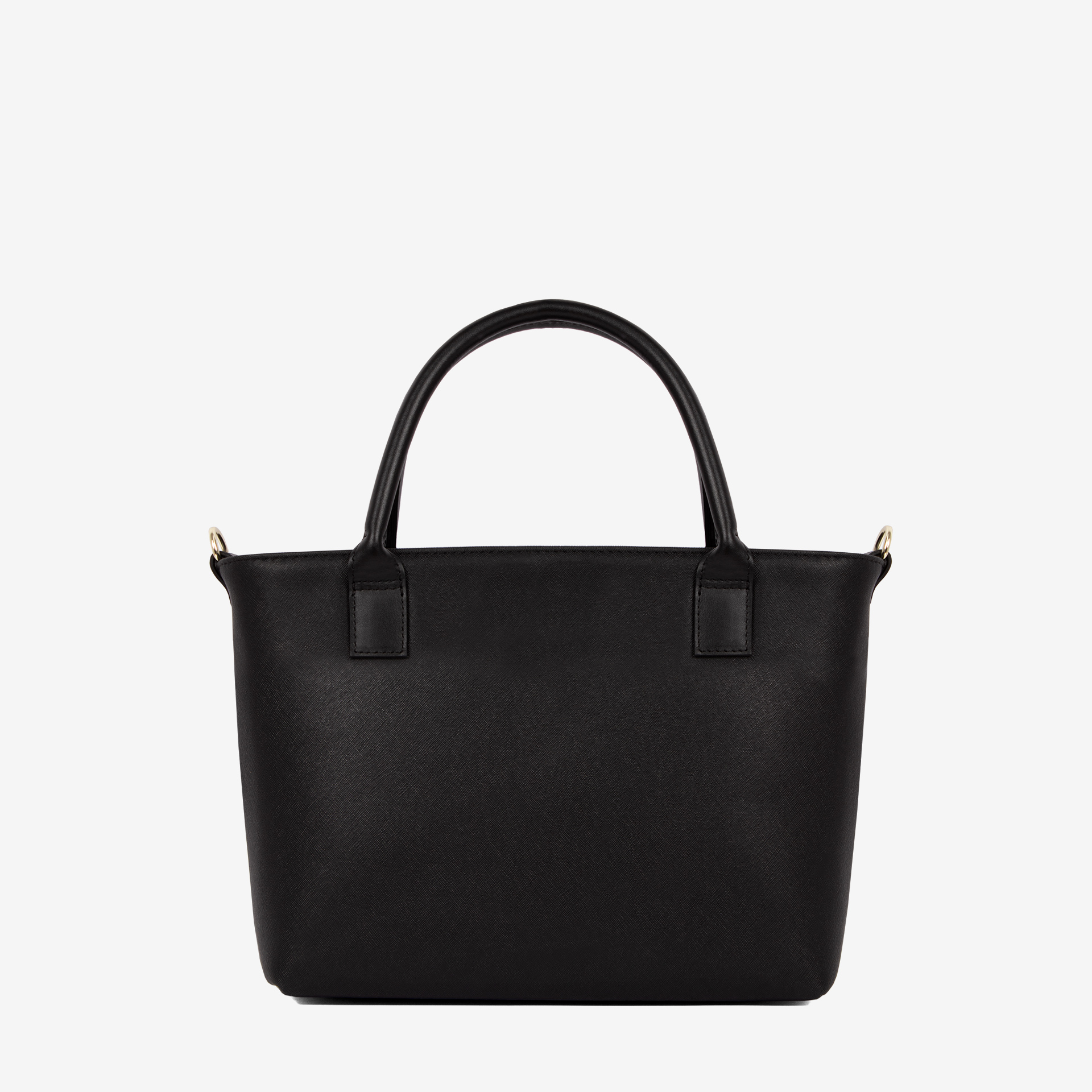 Mala de mão em tela preta, com detalhes em pele genuína. Divisória principal com forro em tecido, dois bolsos pequenos e fecho de correr. Bolso exterior com fecho de correr na parte da frente mala. Asa dupla de mão em pele e alça de tiracolo, ajustável e removível. Detalhe de cantos reforçados em pele. Aplicações douradas.