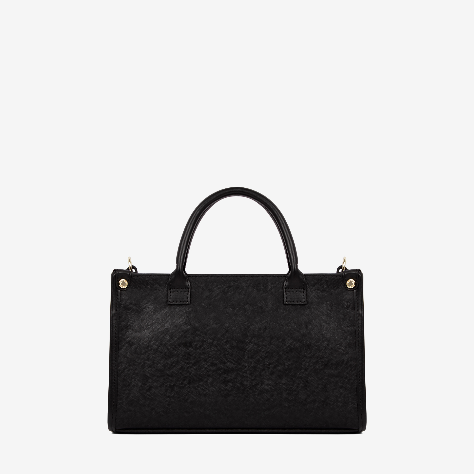 Mala de mão média em tela com detalhes em pele genuína, na cor preto. Divisória principal com forro em tecido, dois bolsos pequenos e fecho de correr. Bolso pequeno com fecho de correr na parte da frente da mala. Asa dupla de mão em pele genuína e alça de tiracolo, ajustável e removível, em tecido. Aplicações douradas.