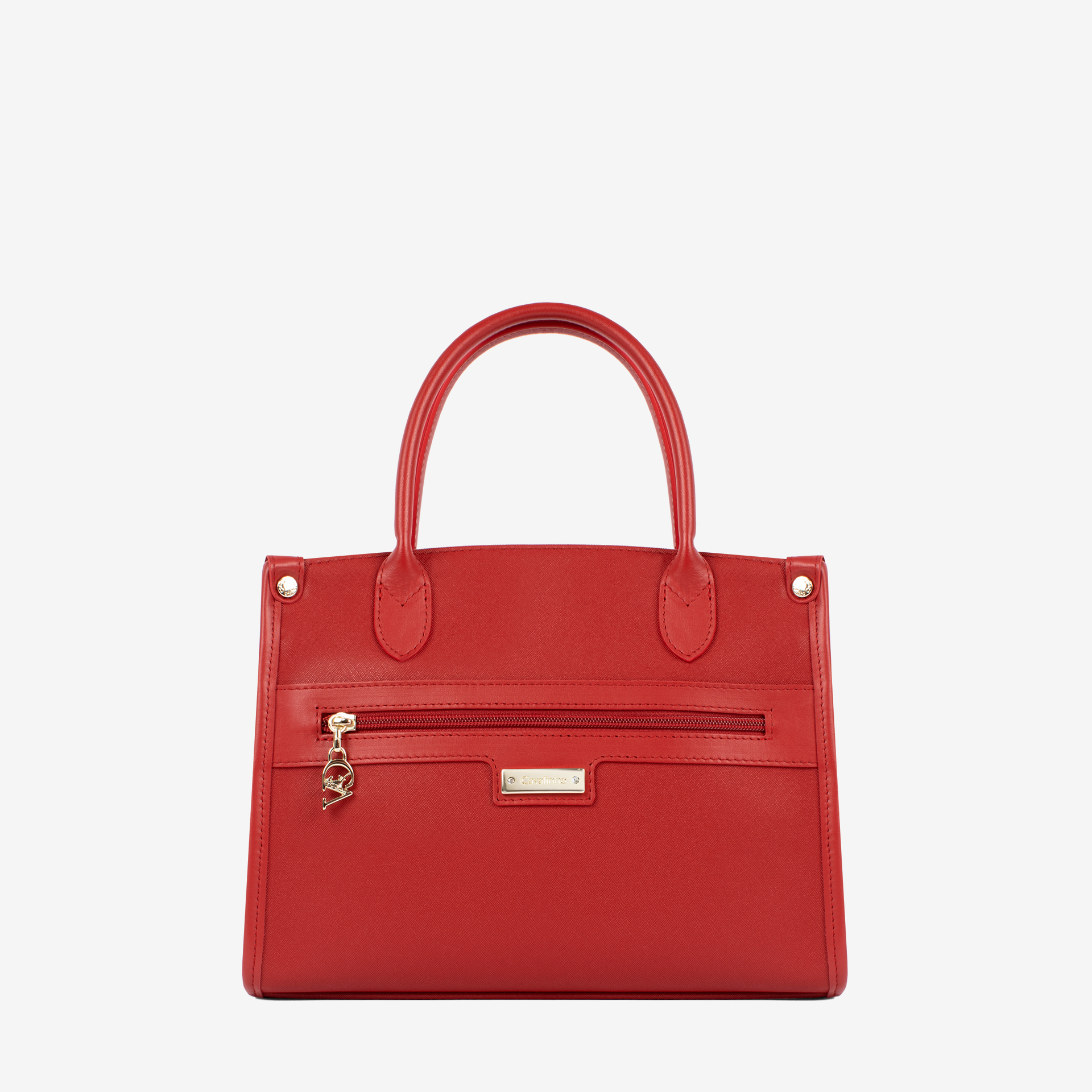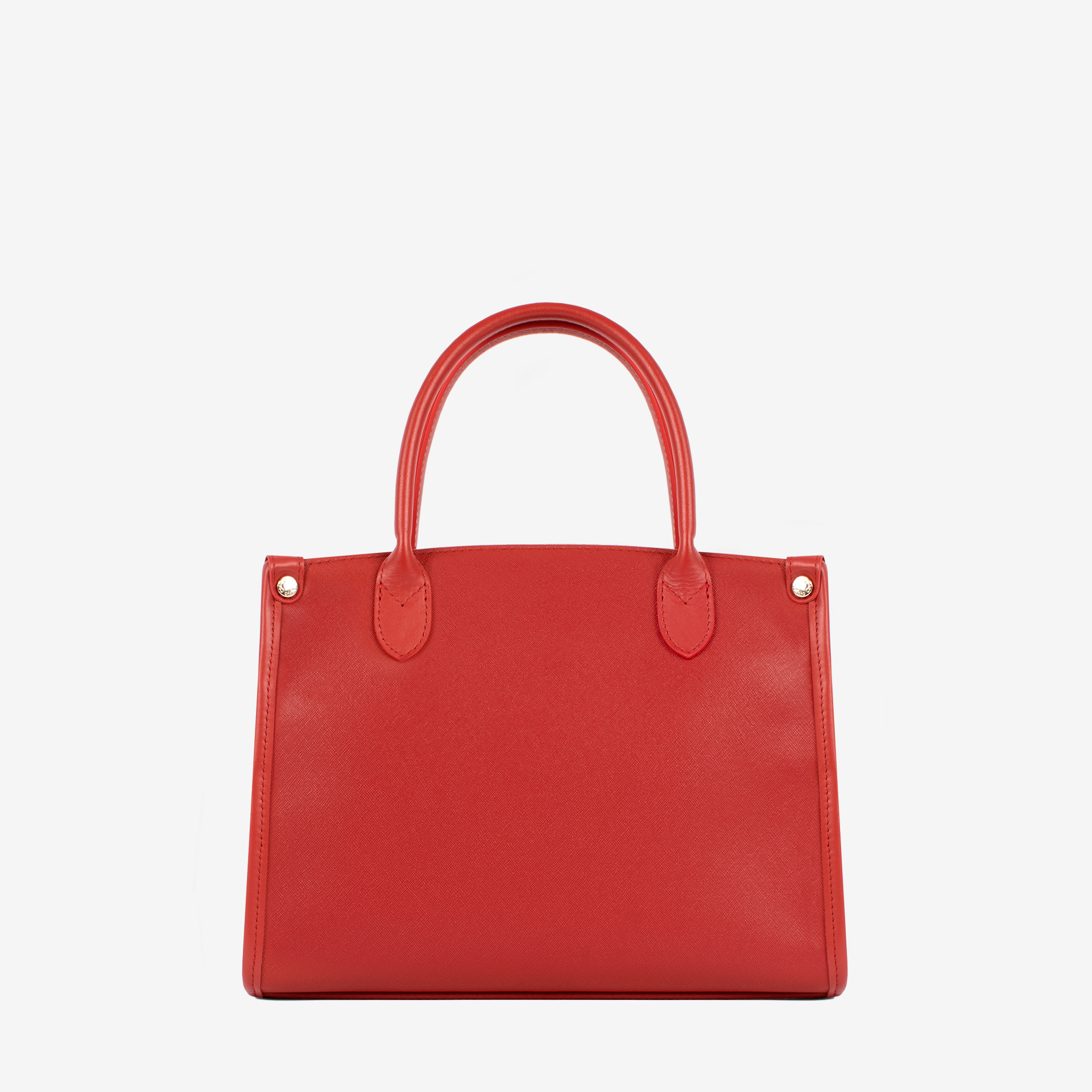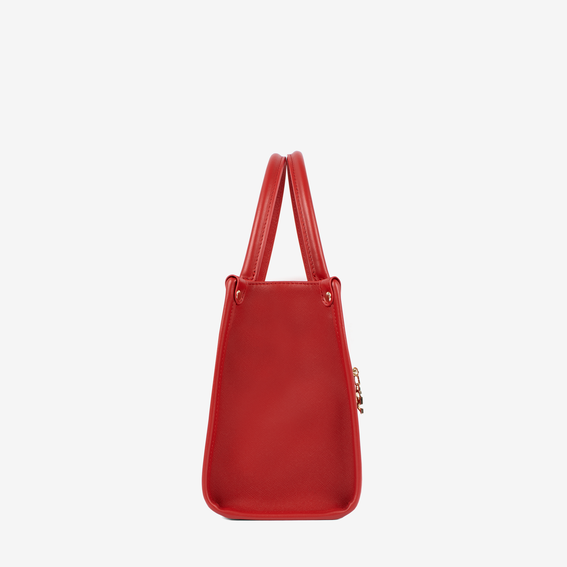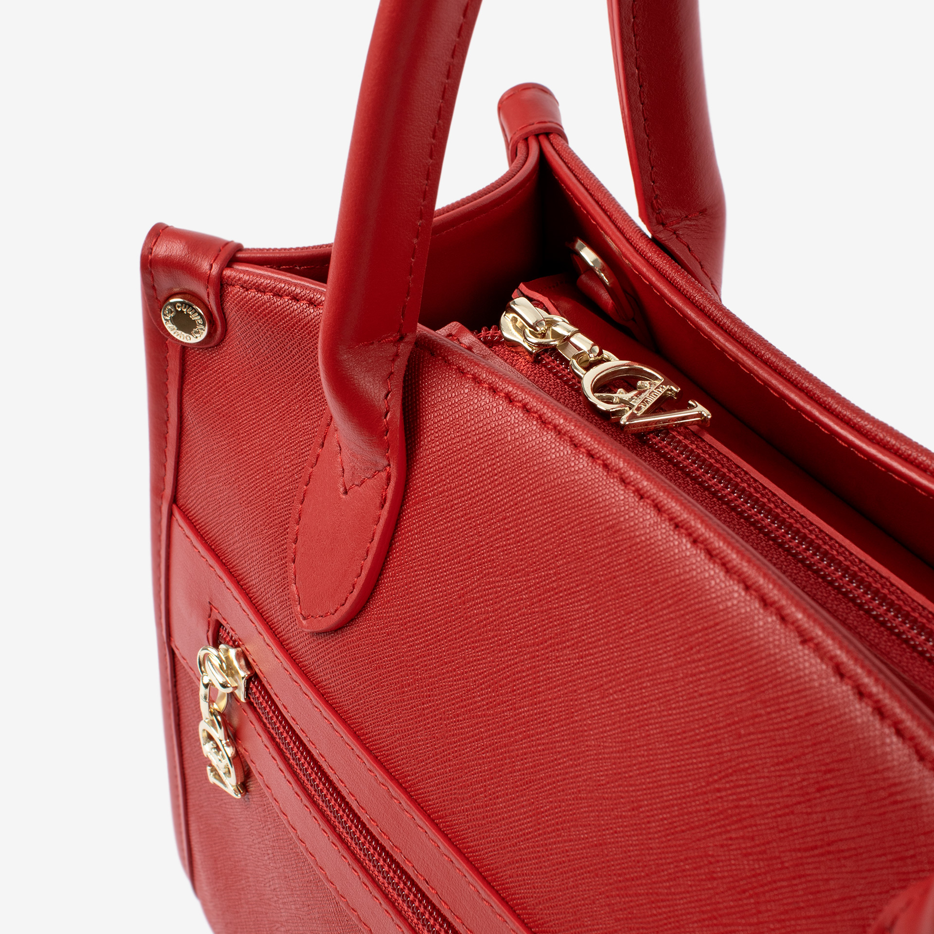 Mala de mão em tela vermelha, com detalhes em pele genuína. Divisória principal com forro em tecido, dois bolsos pequenos e fecho de correr. Bolso pequeno com fecho de correr na parte da frente da mala. Asa dupla de mão e alça de tiracolo ajustável e removível, ambas em pele genuína. Aplicações douradas.