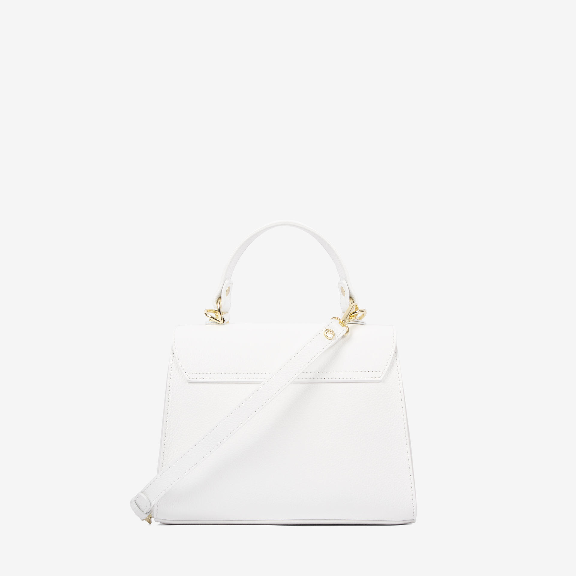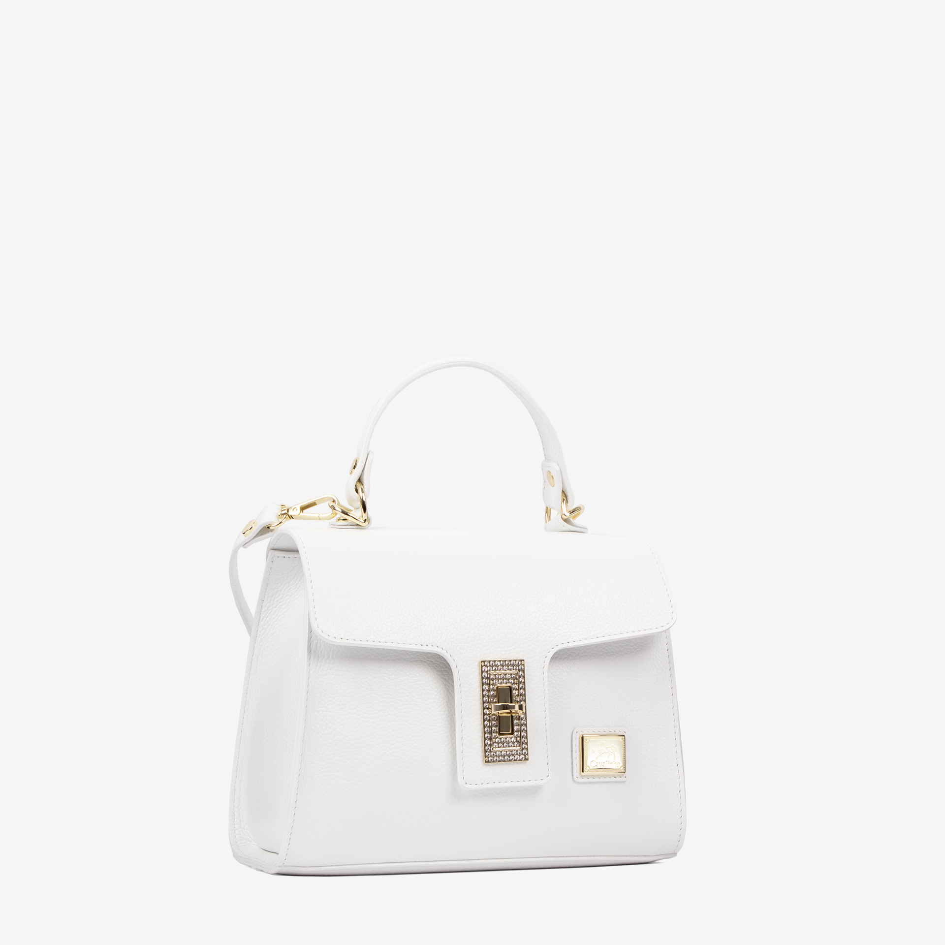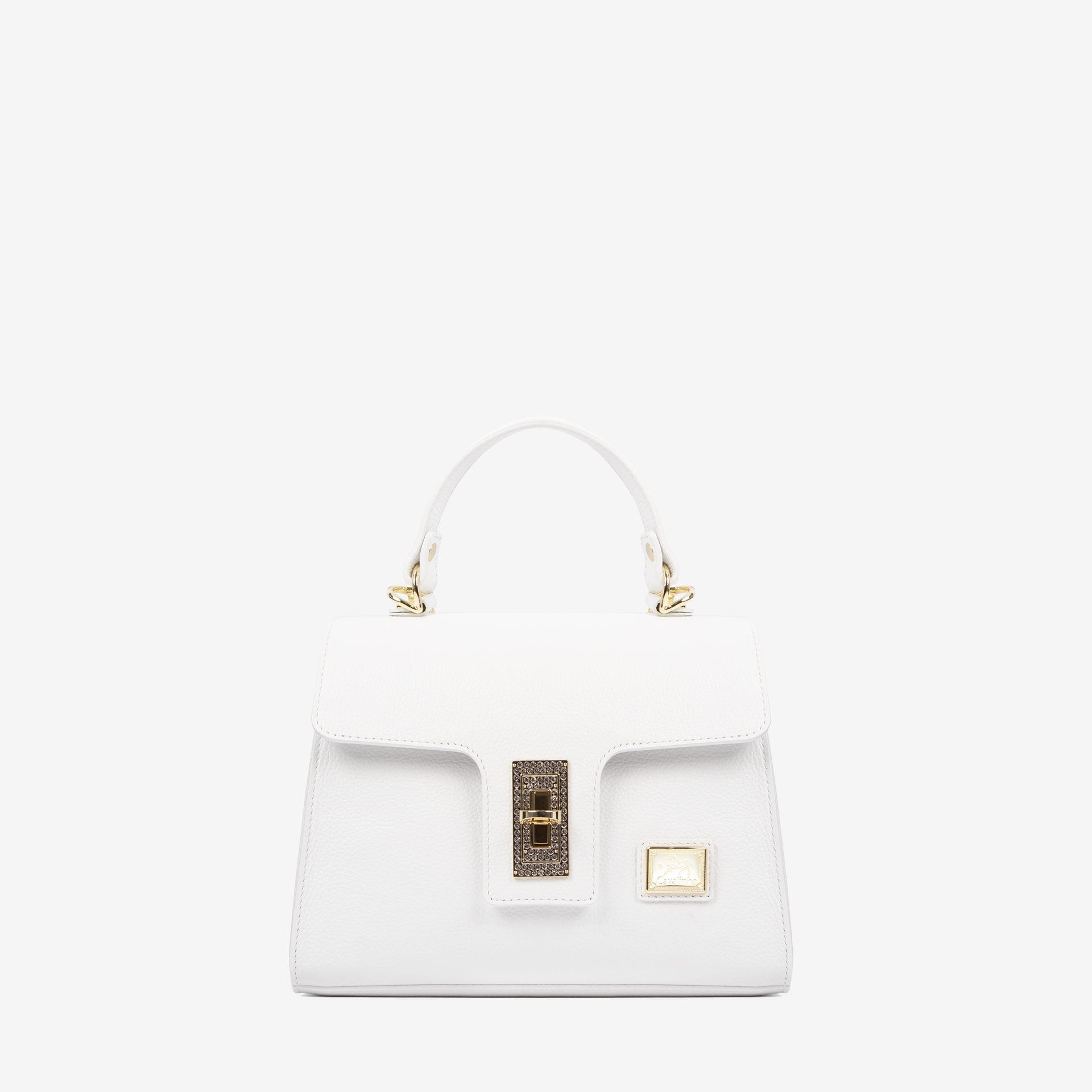 Mala pequena em pele genuína na cor branco. Divisória principal com abertura em torniquete com brilhantes. Asa de mão e alça para ombro, ajustável ou removível. Aplicações douradas.