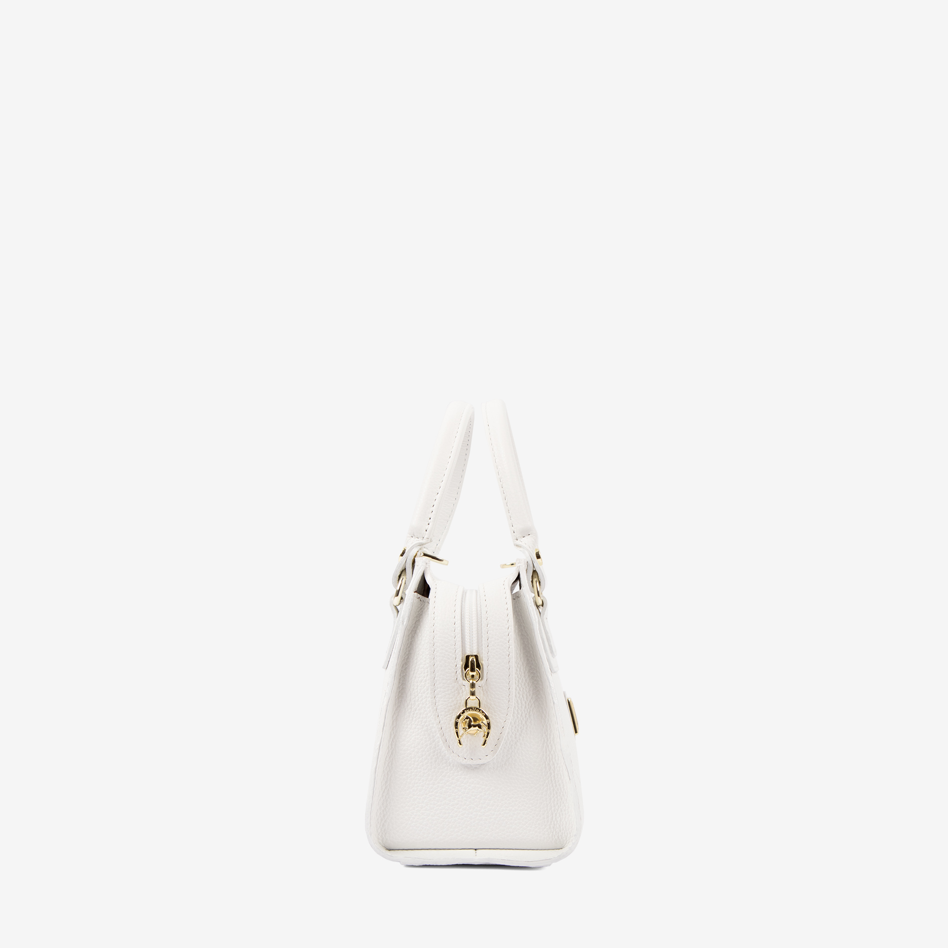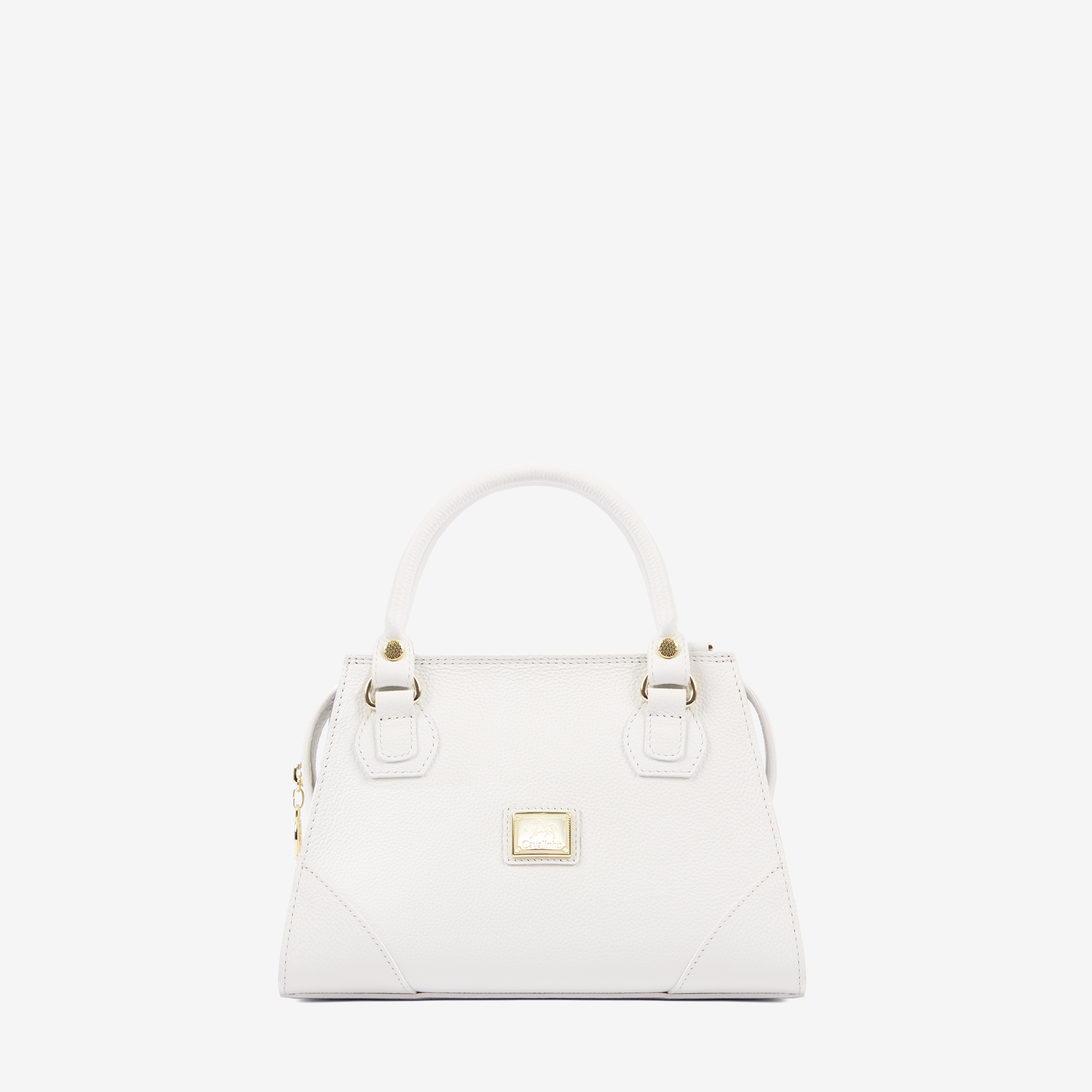Mala de mão em pele genuína na cor branco. Divisória principal com forro em tecido, dois bolsos pequenos e fecho de correr. Asa dupla de mão em pele e aplicações douradas.